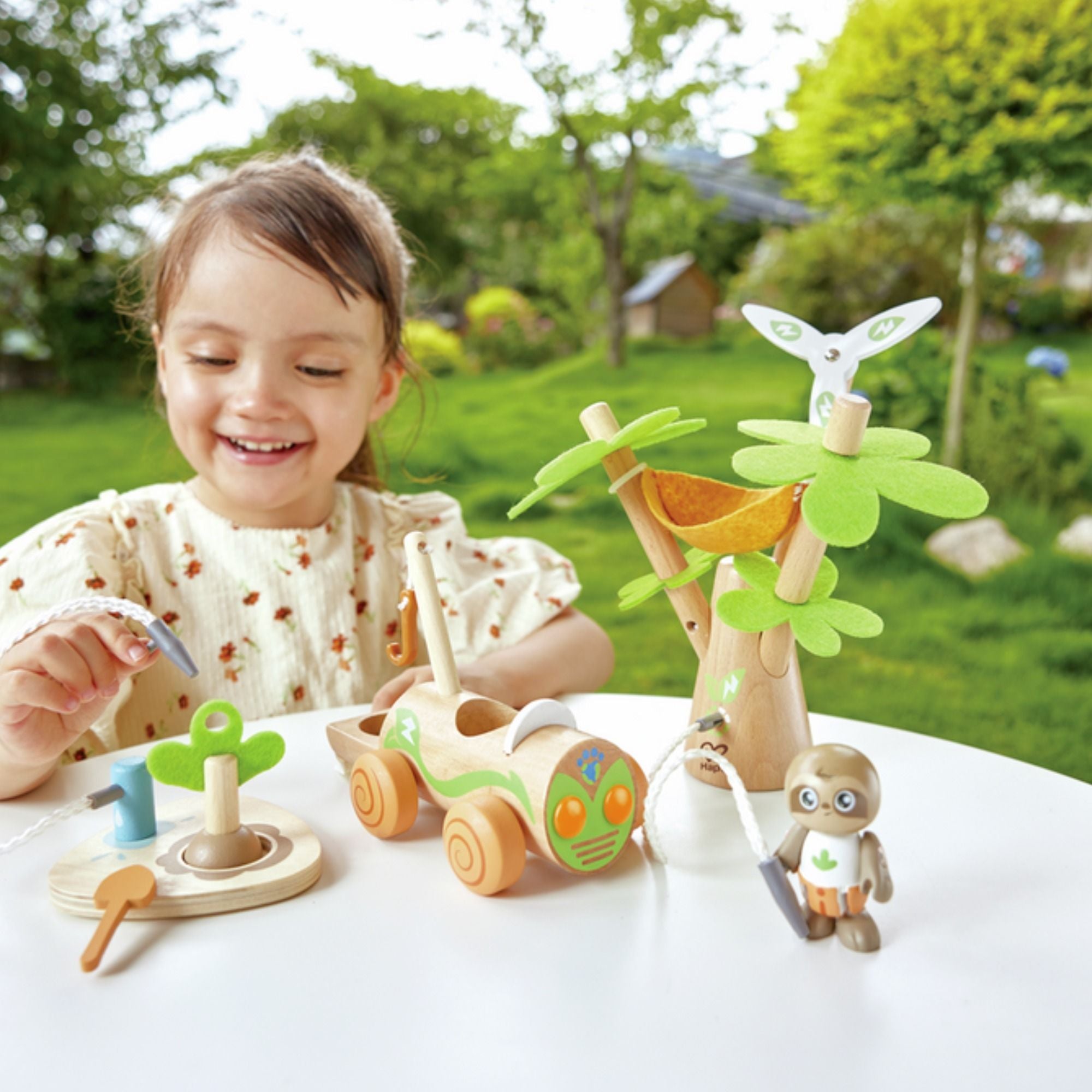 Begleite Aria, das umweltbewusste Mädchen, auf ihrer Mission, die Welt grüner zu machen! Mit dem "Bäume pflanzen mit dem E-Auto"-Set von Hape lernen Kinder auf spielerische Weise die Bedeutung von Nachhaltigkeit und erneuerbaren Energien kennen.