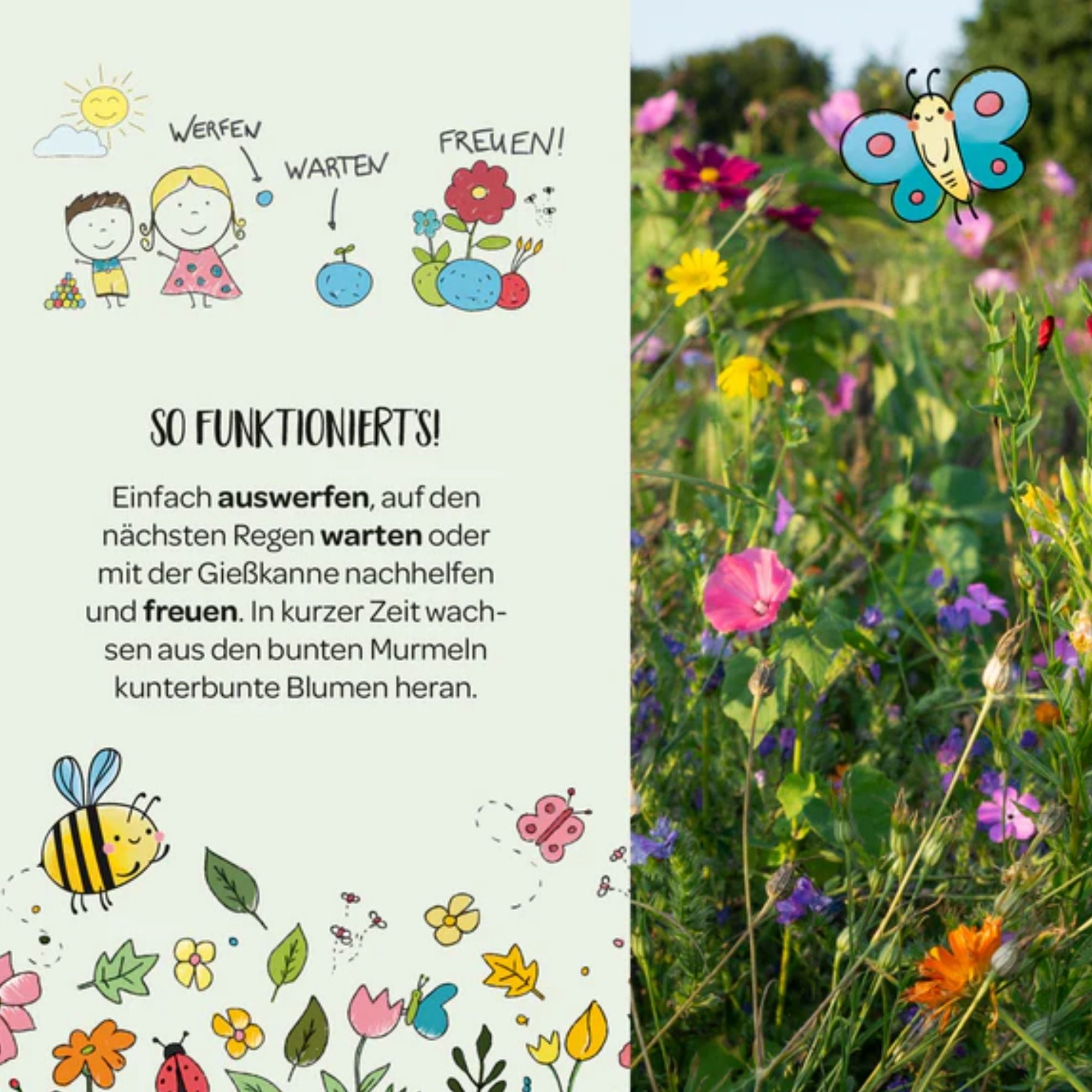 Enthält liebevoll gestaltete Tütchen mit je 5 bunten Blumenmurmeln, aus denen eine Blumenwiese wächst – eine tolle Geschenkidee für kleine Partygäste oder den Kindergarten