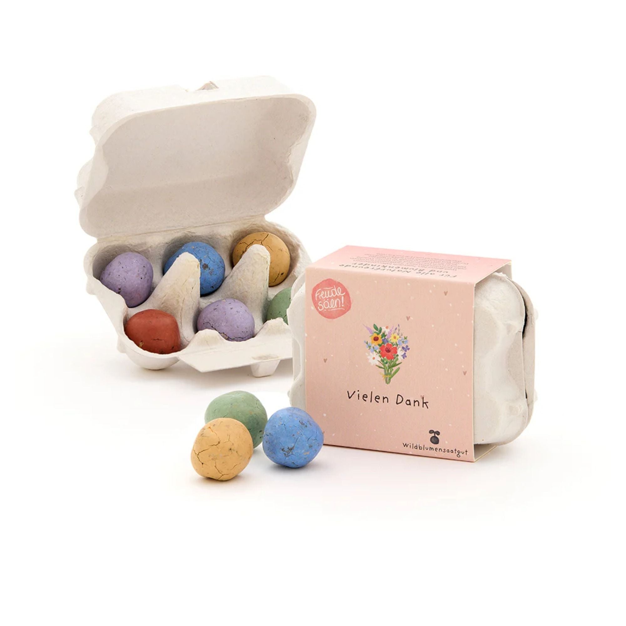 Die 6 bunten Blumenmurmeln im niedlichen Mini-Eierkarton enthalten Wildblumen-Saatgut und sind eine charmante Geschenkidee für alle, denen du Vielen Dank sagen möchtest. Einfach einpflanzen, gießen und sich freuen: Aus den farbenfrohen Kugeln wachsen verschiedene Wildblumensorten – ideal für Blumentöpfe, Balkonkästen oder den Garten.