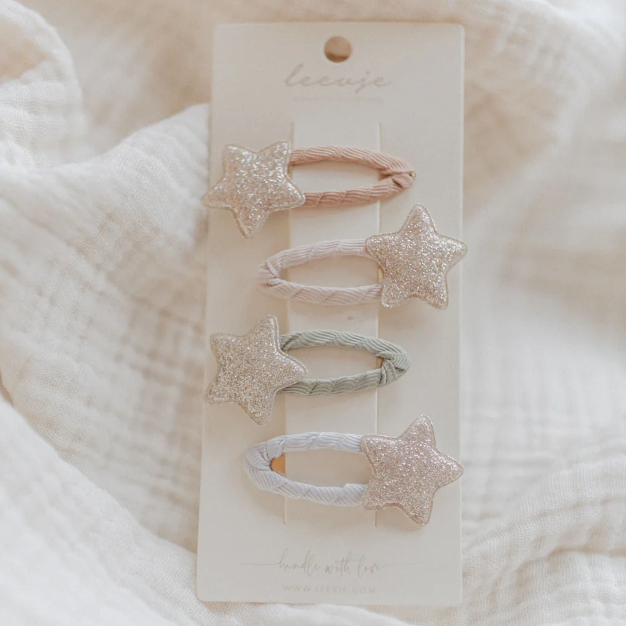 Diese süßen Haarspangen mit glitzernden und glänzenden Details lassen Kinderaugen strahlen. Durch die schlichten leevje-Farben passen sie toll zu jedem Outfit. Schöner Haarschmuck für die feierlichen Tag!