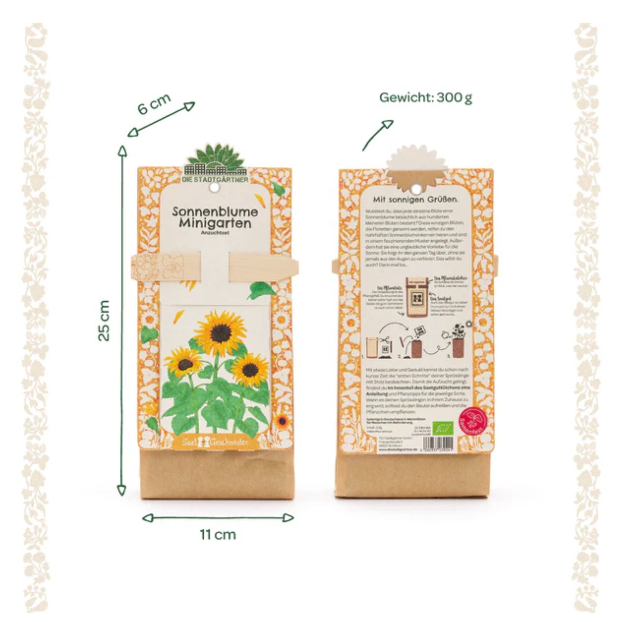 Inhalt: Keimfreudiges BIO-Saatgut für Sonnenblumen, hochwertige Anzuchterde, ein passendes Pflanzstäbchen als Beetmarkierer und eine wasserfeste Verpackung, die als Pflanzgefäß dient.