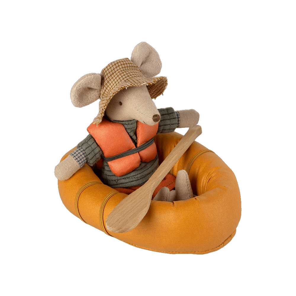 Schlauchboot mit Paddel und Rettungsweste für Maus