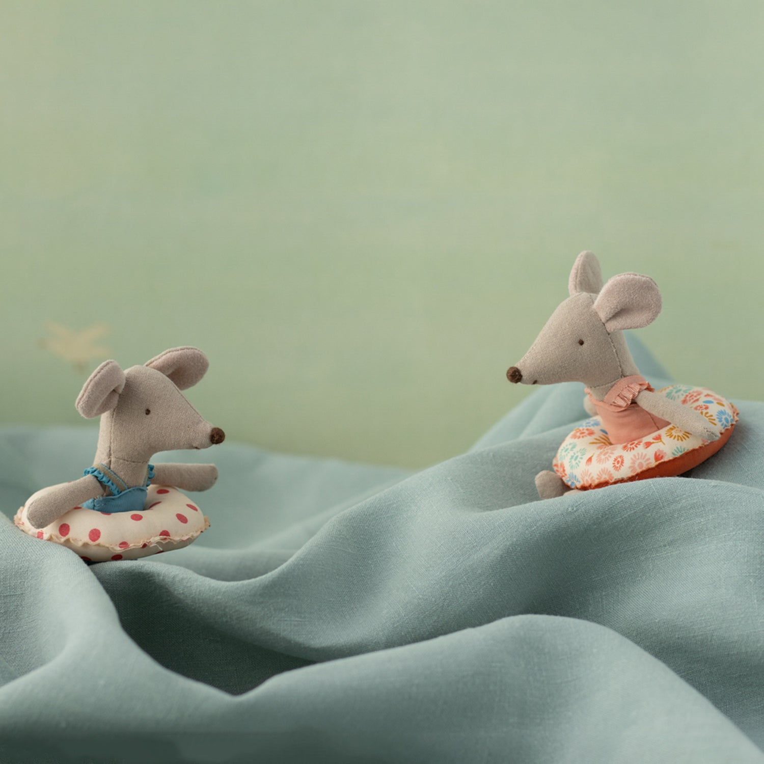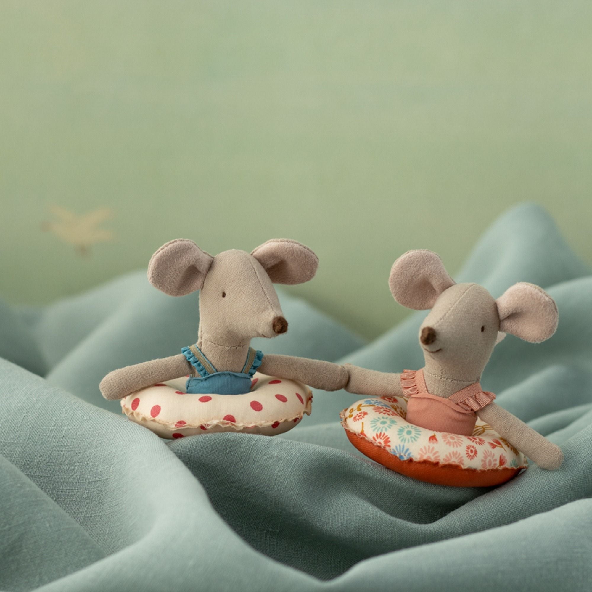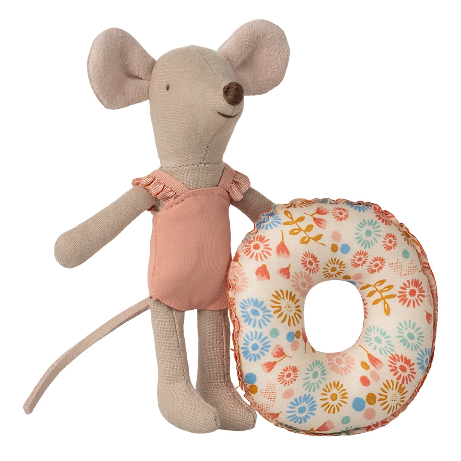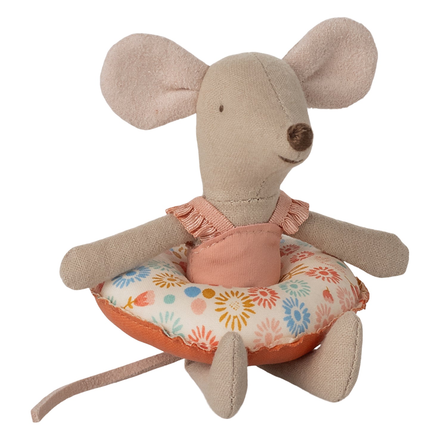 Bereit für sonnige Abenteuer! Die kleine Schwester der Maileg-Mäusefamilie ist perfekt ausgestattet für einen Tag am Strand. Mit ihrem himmelblauen Badeanzug und dem charmanten Schwimmring mit roten Punkten wird sie zum Highlight jeder Spielwelt.