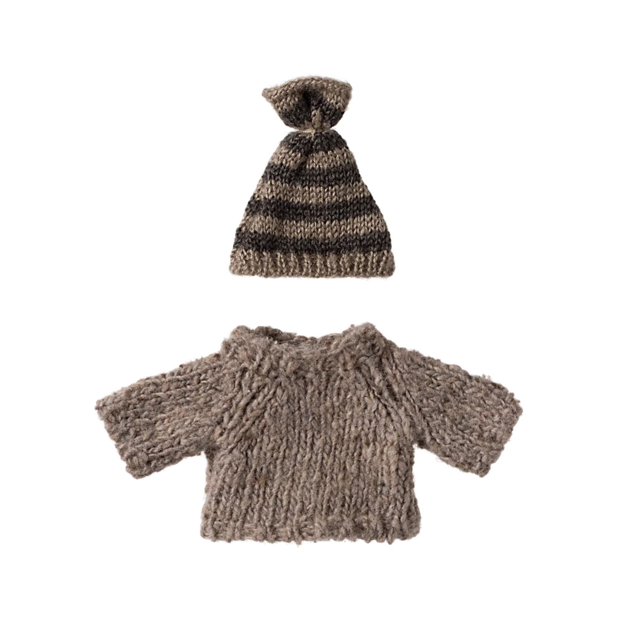 Ein weicher Strickpullover und eine Mütze für die kalte Winterzeit. Dies wird deine kleinen Freunde sicher warm halten. Die Sets passen den Mäusen in der Größe Große Schwester/ Großer Bruder.