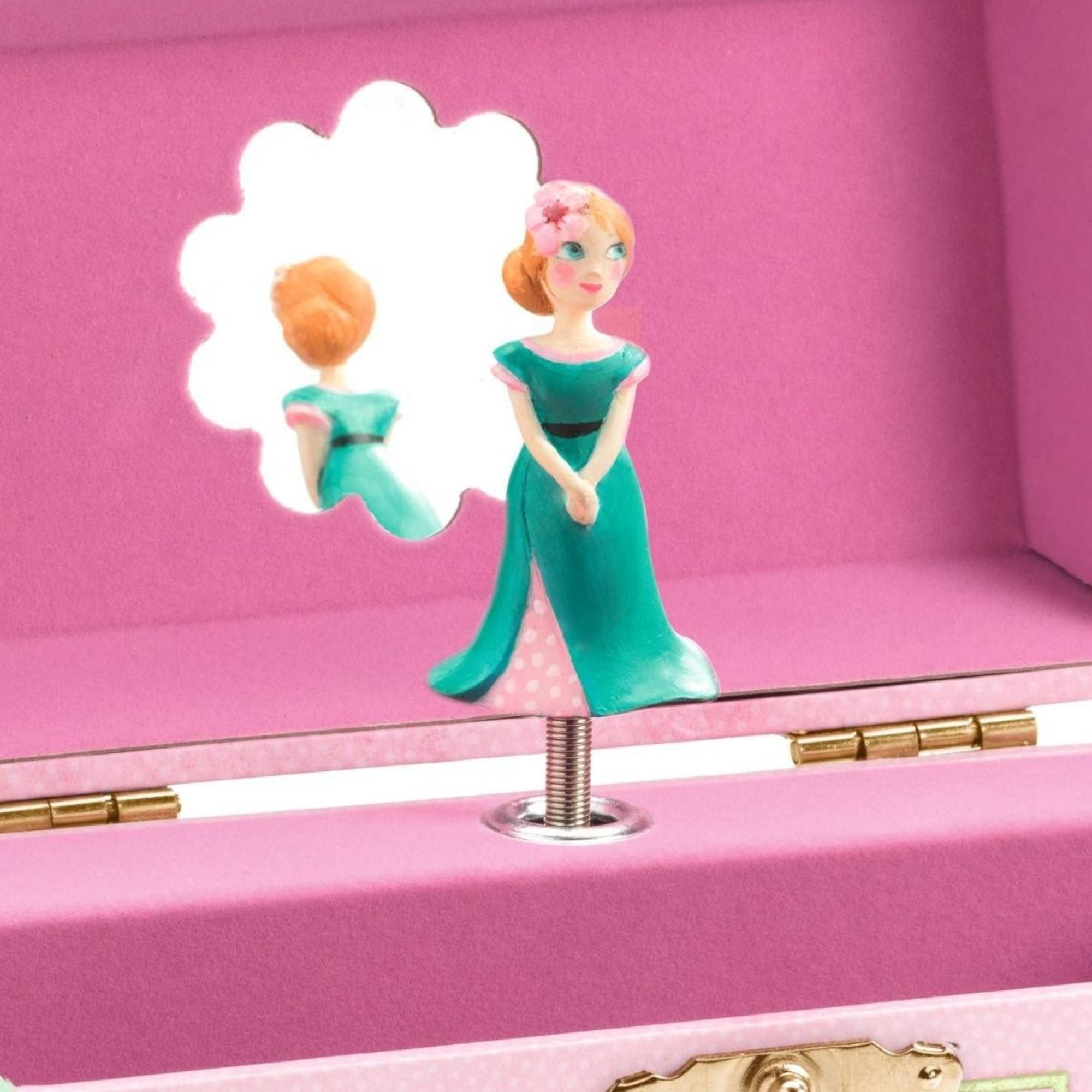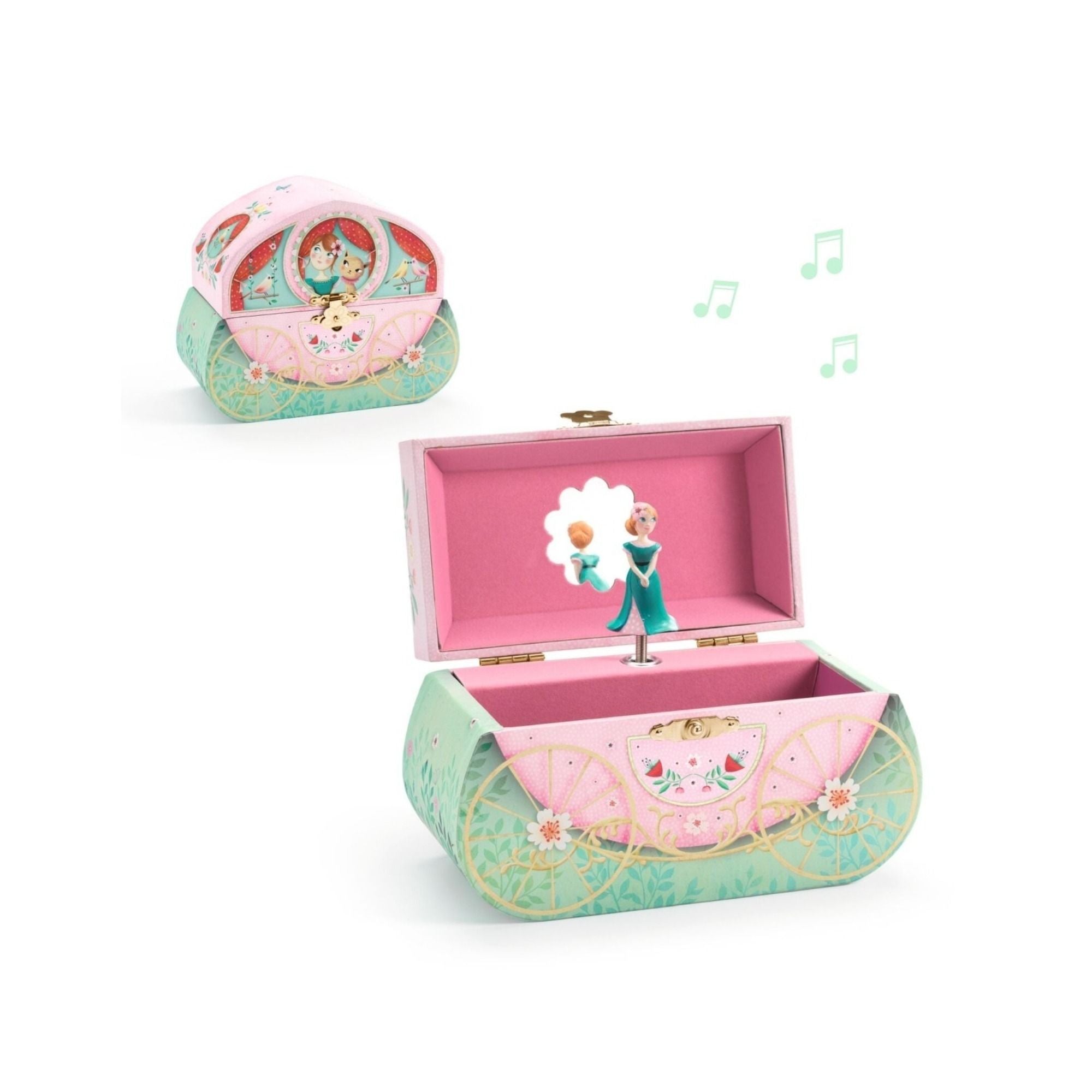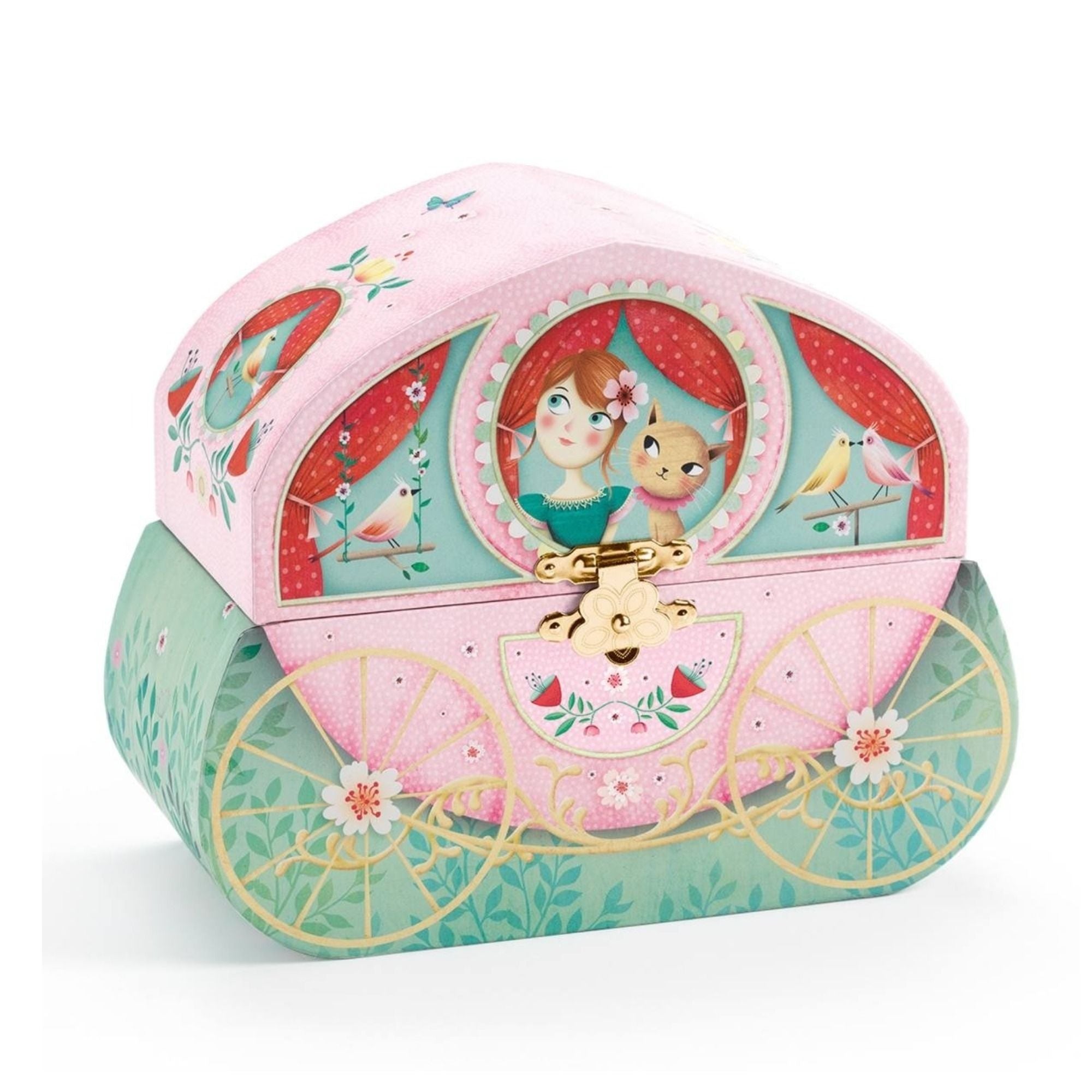 Ausflug in der Kutsche ist eine hübsch verzierte Spieluhr in Form einer Kutsche zur Aufbewahrung von Schmuck und kleinen Schätzen. Schüssel aufziehen, Dose öffnen und tada: Überraschung! Eine liebevoll gestaltete Prinzessin dreht sich zur Melodie von „Let Me Call You“ von Leo Friedman und spiegelt sich in einem schön geformten Spiegel.