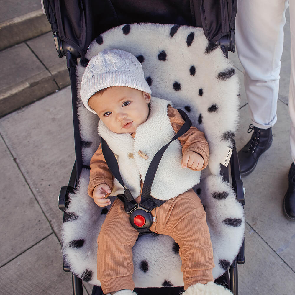 Die Schafsfelleinlagen sind mit allen Buggys kompatibel, die mit abnehmbarem 3- oder 5-Punkt-Gurt ausgestattet sind. Die Gurte und Schnallen werden einfach durch die vorgegebenen Gurtlöcher geführt.