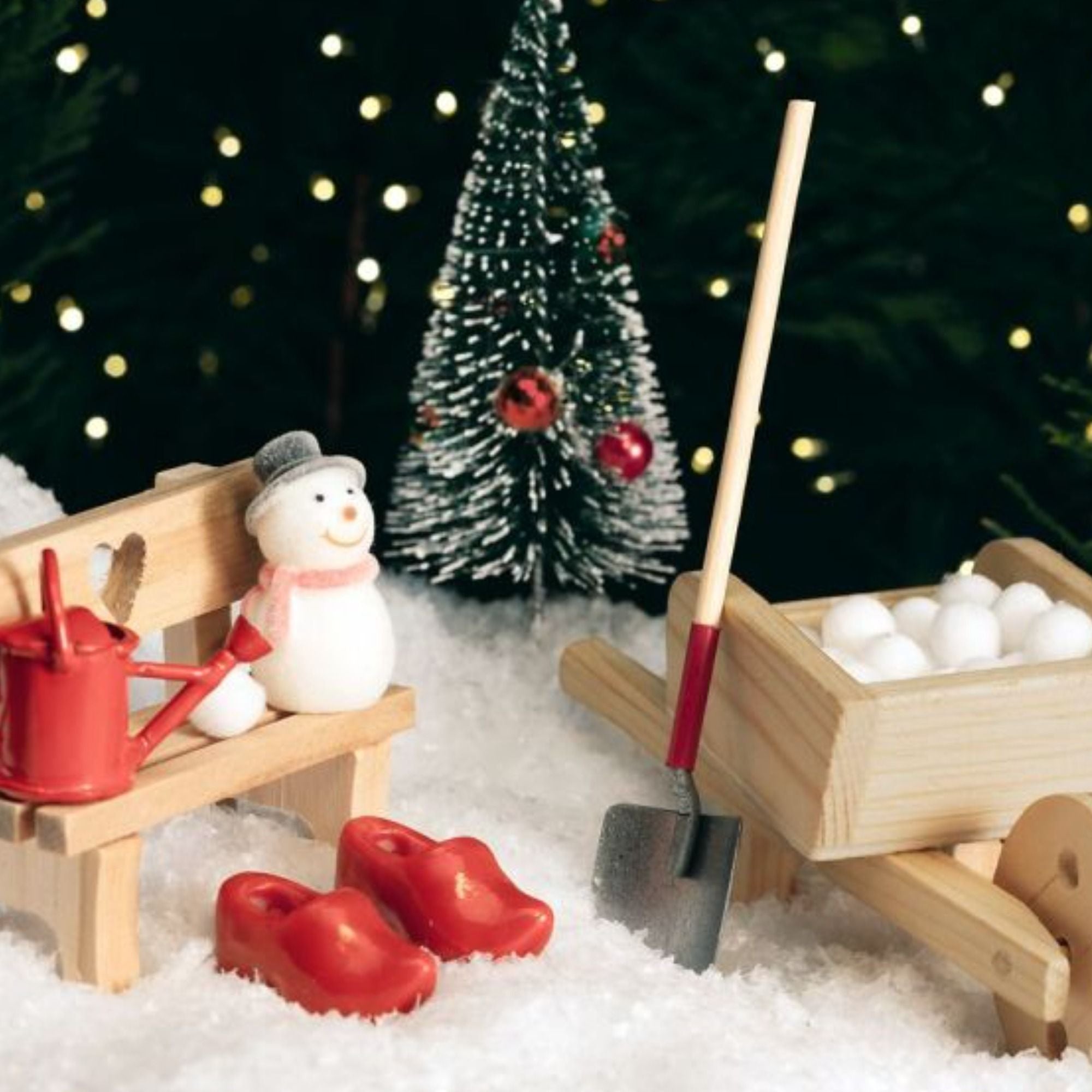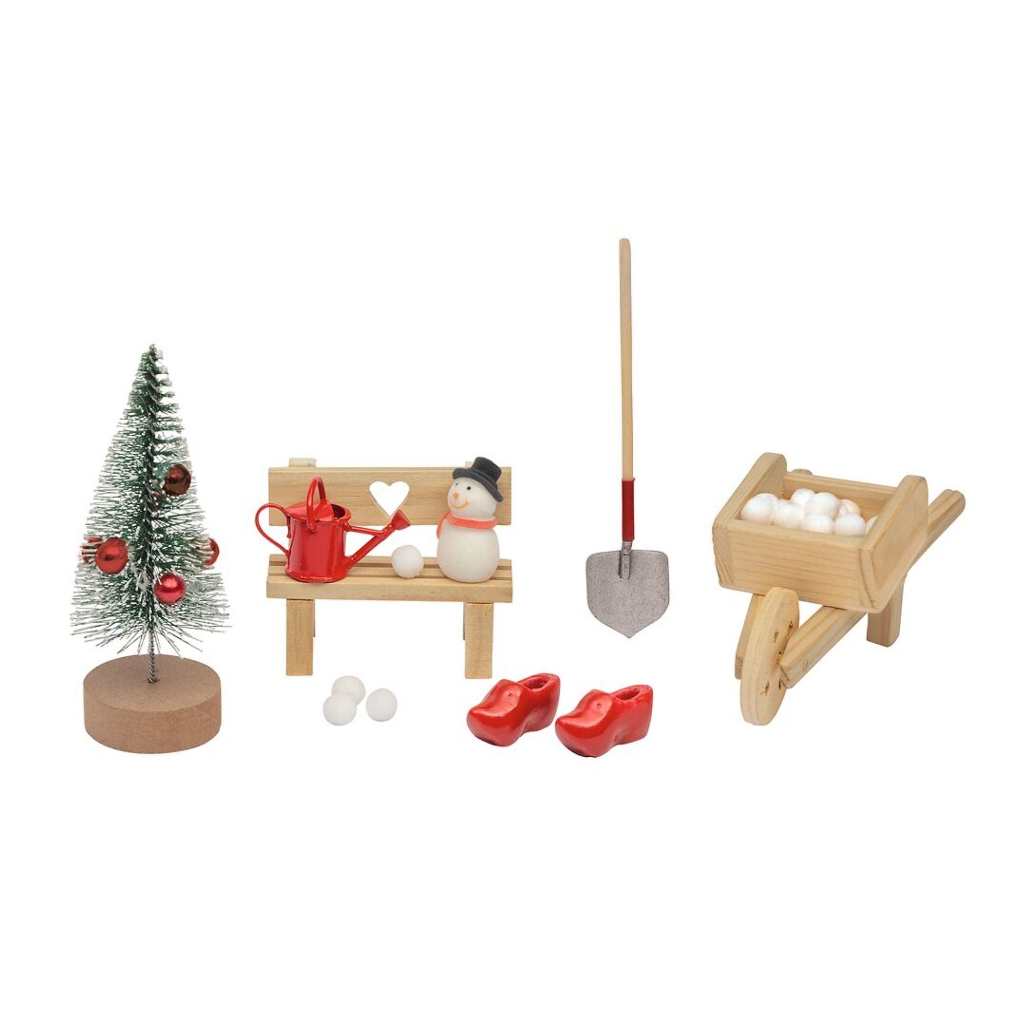 Set Im Wichtelgarten: mit Bank, Schubkarre, Gießkanne, Tannenbaum, Schuhe, Schaufel, Schneemann und Schneebällen