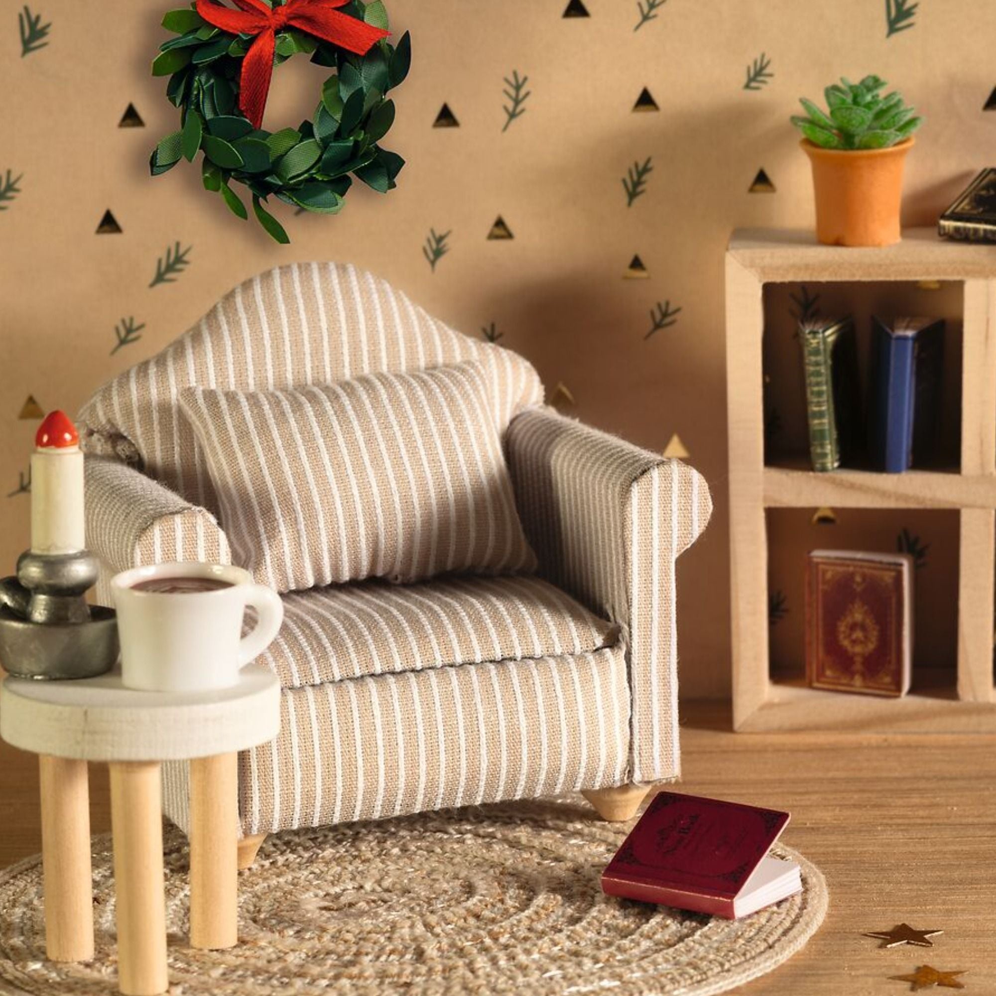 Set In der Wichtelstube: mit Sessel, Teppich, Regal, Bücher, Kerze, Pflanzen, Kaffeetasse und Hocker