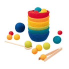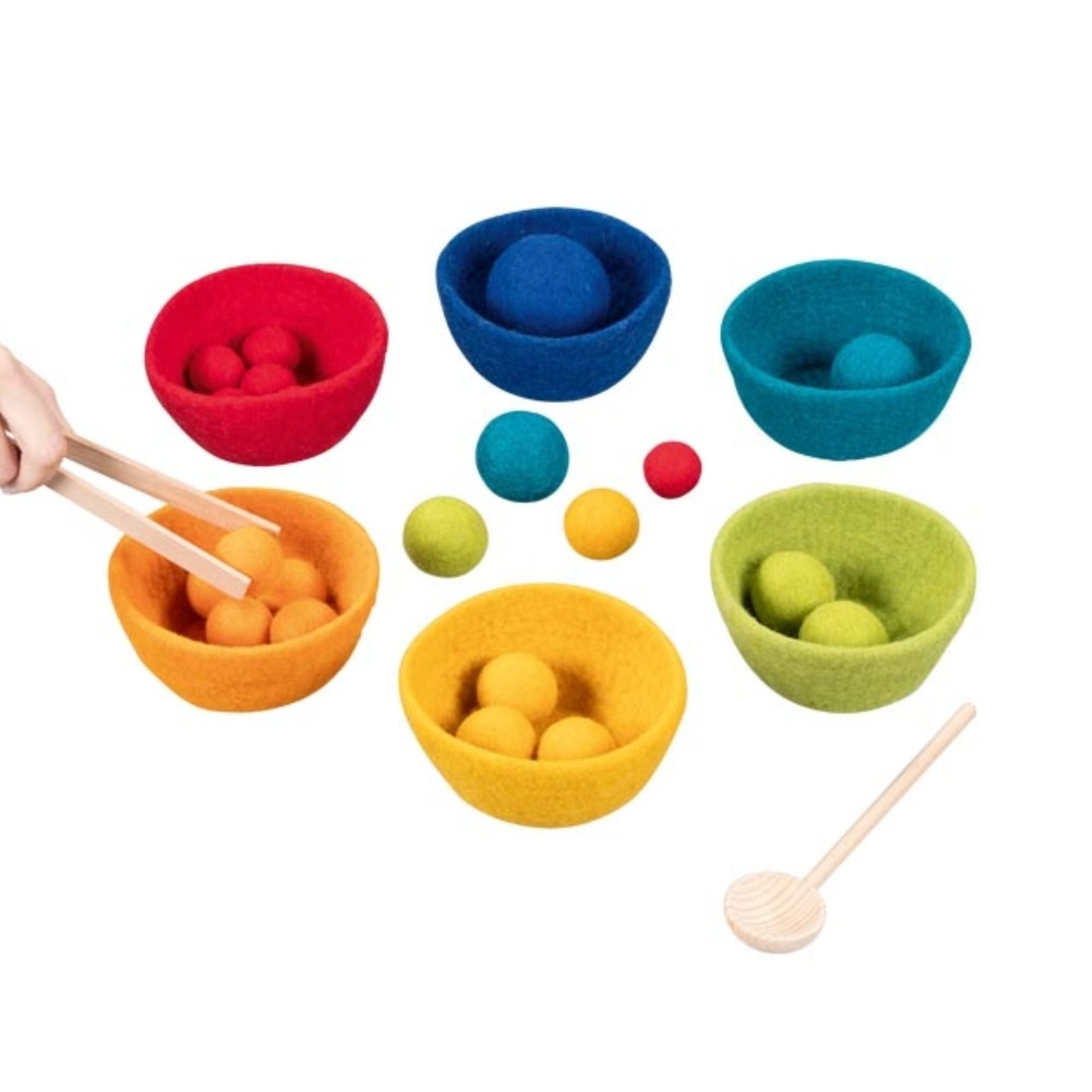 Dieses Sortierspiel besteht aus nachhaltigen Materialien und bietet vielfältige Spielmöglichkeiten. Mit der Zange und dem Löffel aus Holz, die optimal in kleine Kinderhände passen, lassen sich die handgefilzten Elemente aus fair gehandelter Wolle auf unterschiedliche Weise sortieren und bewegen. So entsteht ein pädagogisch wertvolles Spielzeug, das Kreativität, Feinmotorik und Nachhaltigkeit miteinander verbindet.