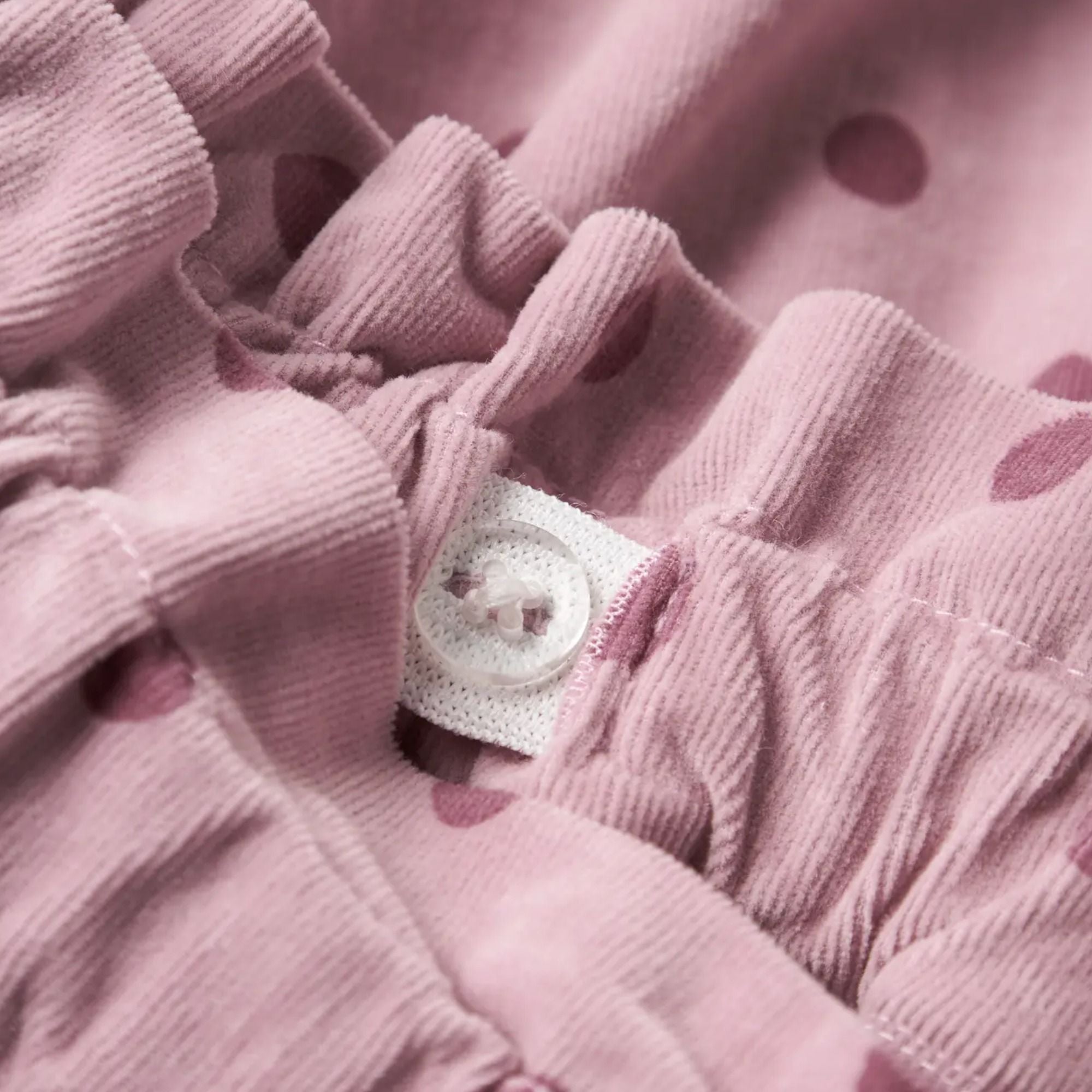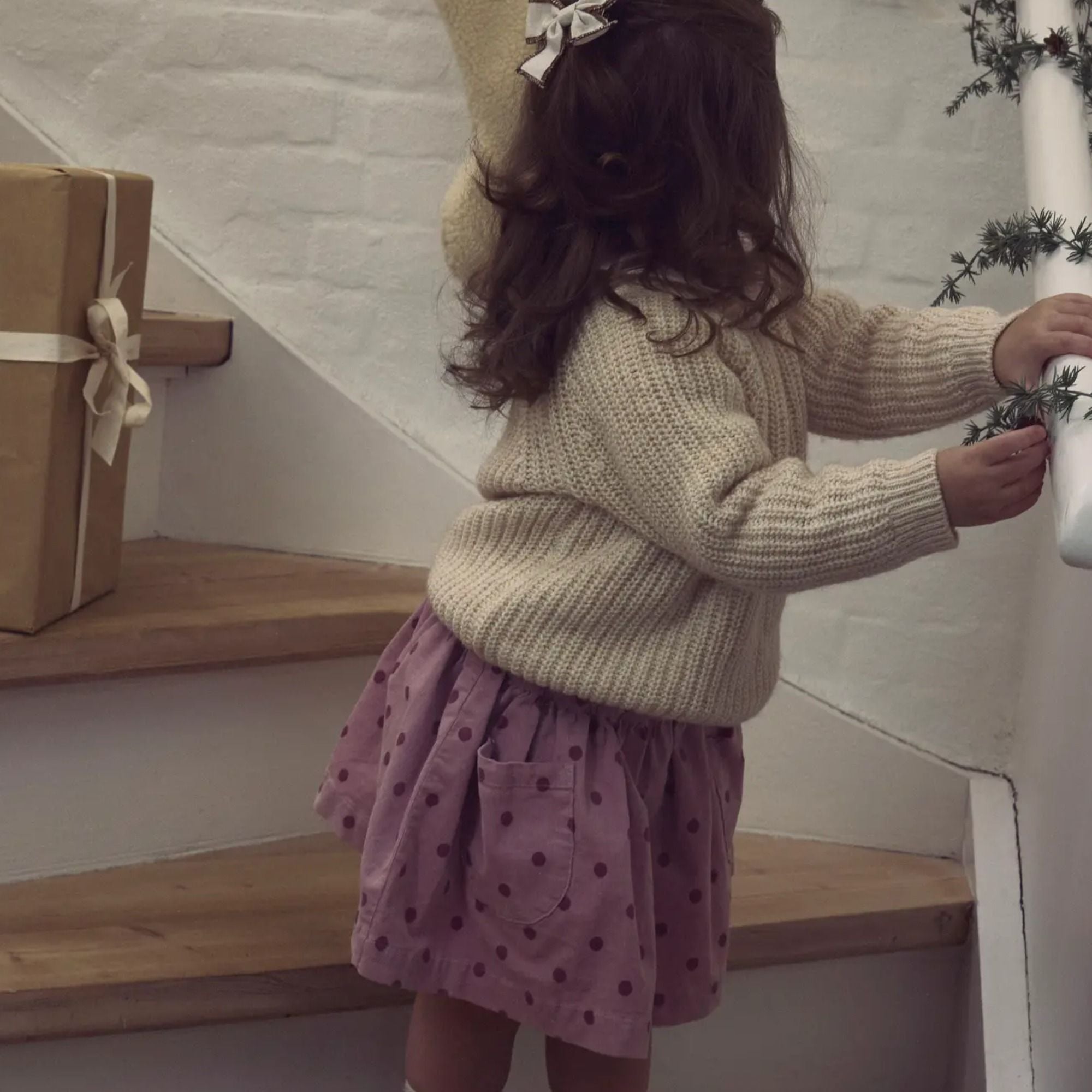 Dieser liebevoll gestaltete Kinder-Paperbag-Rock aus weichem Feincord besteht aus Bio-Baumwolle und verbindet Komfort mit verspieltem Design. Der elastische Paperbag-Bund mit verstellbarem Gummiband sorgt für eine individuell anpassbare Passform und verleiht dem Rock seine charakteristische, leicht geraffte Silhouette. Die samtige Feincord-Struktur fühlt sich angenehm weich an und liegt sanft auf der Haut, während das dezente Pünktchenmuster dem Look eine fröhliche, kindliche Note verleiht. Zwei praktische, aufgesetzte Taschen vorne runden das Design ab und machen den Rock zum idealen Begleiter für Alltag, Kindergarten oder besondere Anlässe.