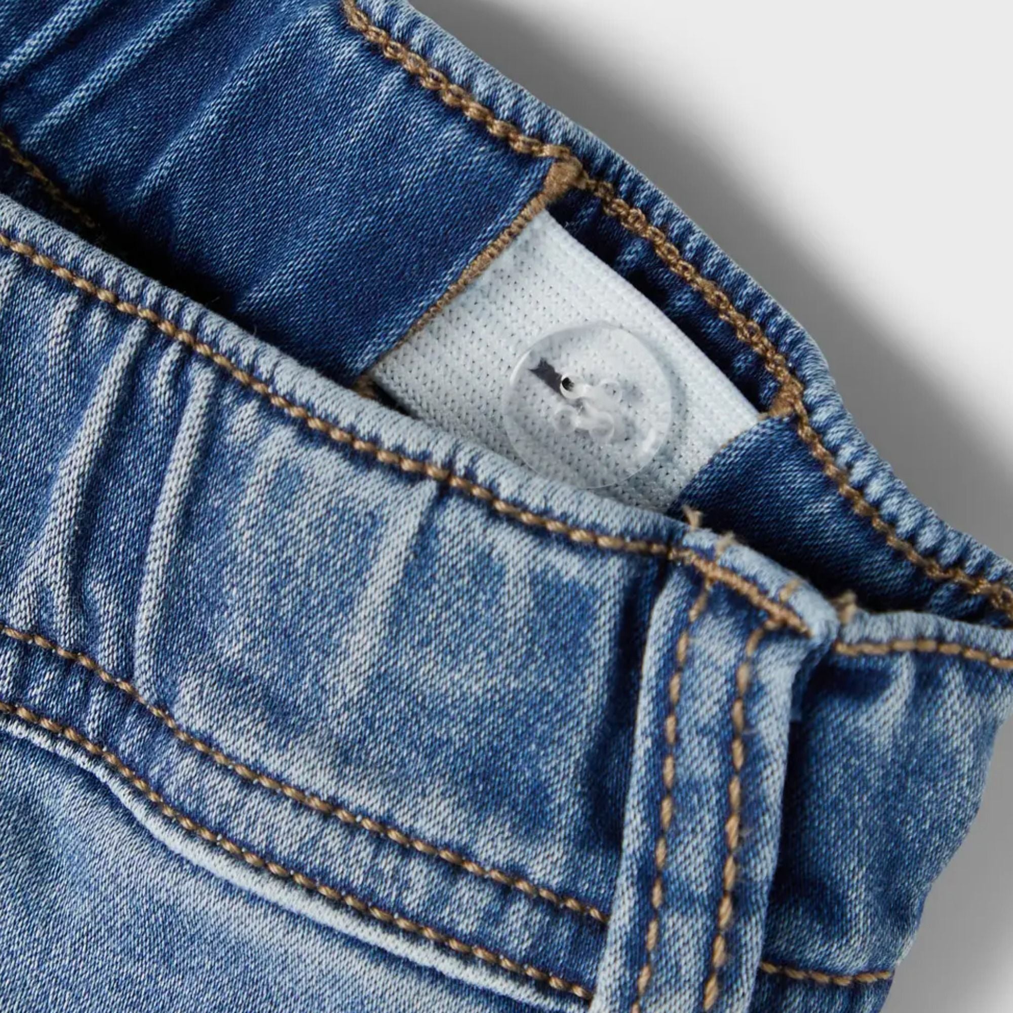Diese bequeme Kinder-Jeans aus recycelter Baumwolle kombiniert klassischen Denim-Look mit liebevollen Details. Zierbänder auf der Vorderseite verleihen der Hose eine verspielte Note, während das verstellbare Gummiband im Bund für eine individuell anpassbare und komfortable Passform sorgt. Die robuste, zugleich angenehm weiche Qualität macht sie zum idealen Begleiter für Alltag, Spiel und Abenteuer.