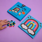Dieses Set ermöglicht das Gestalten eines weichen Bildes mit über 500 bunten und neonfarbenen Pompons. Die selbstklebende Leinwand ist mit farbigen Markierungen versehen, die bei der Platzierung der Pompons helfen.