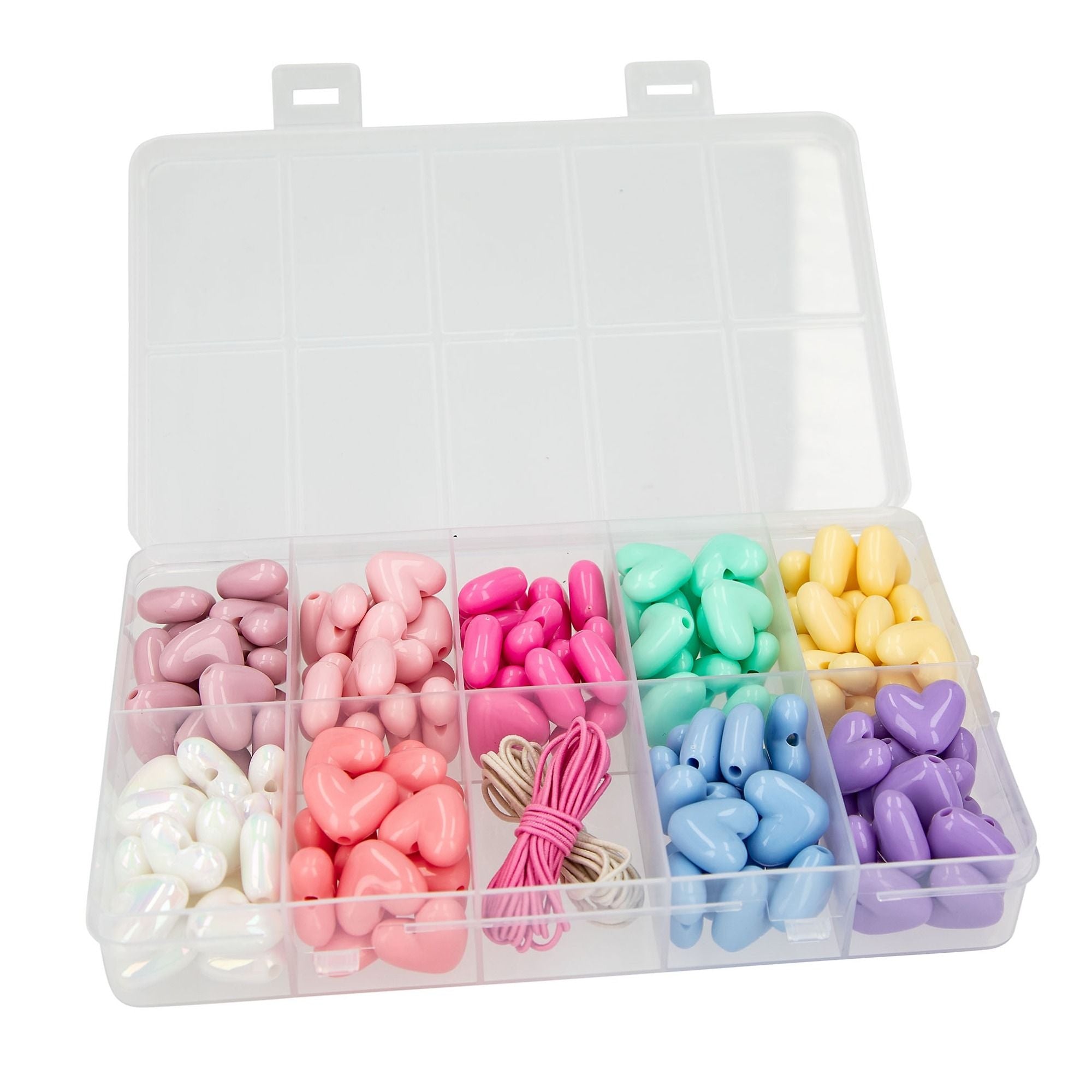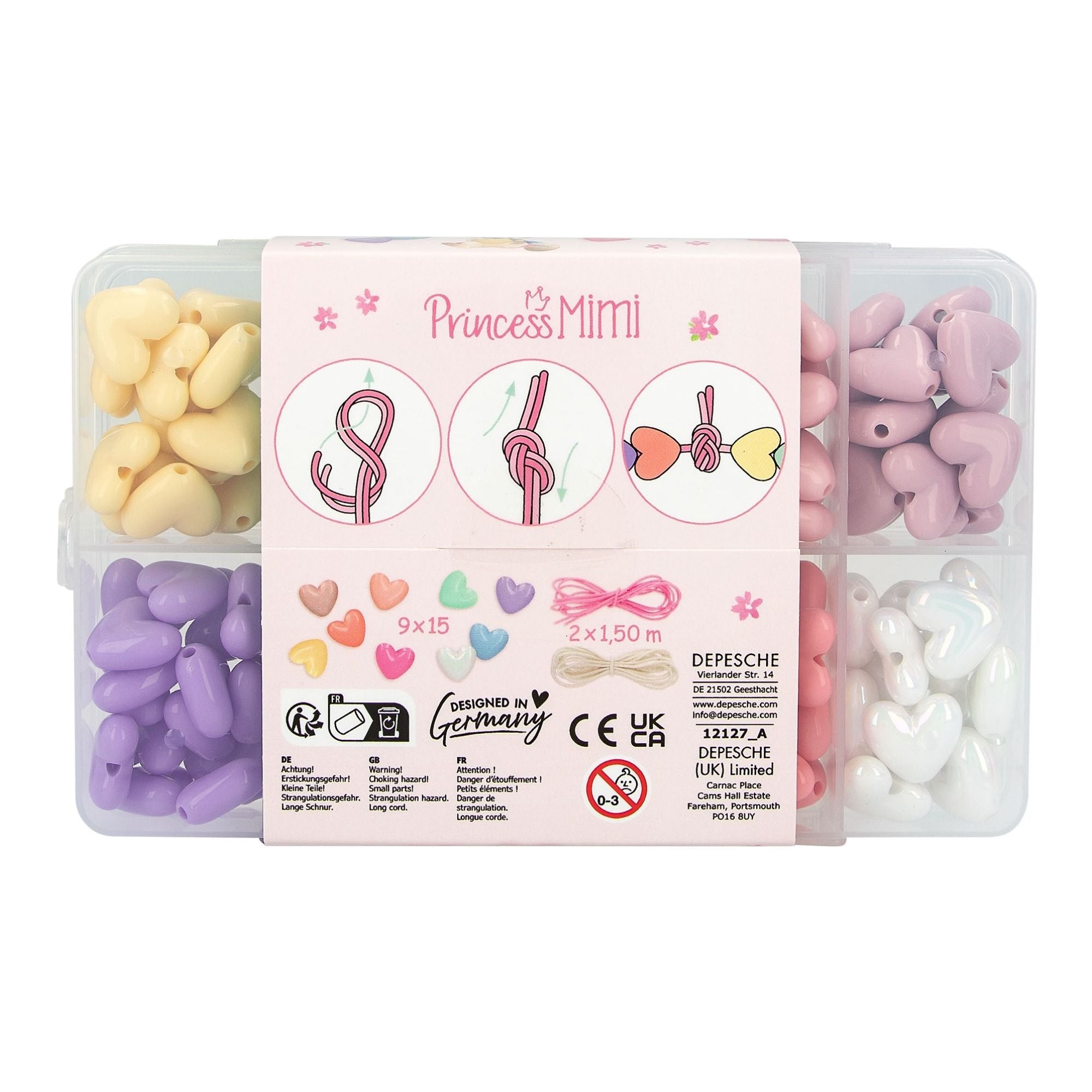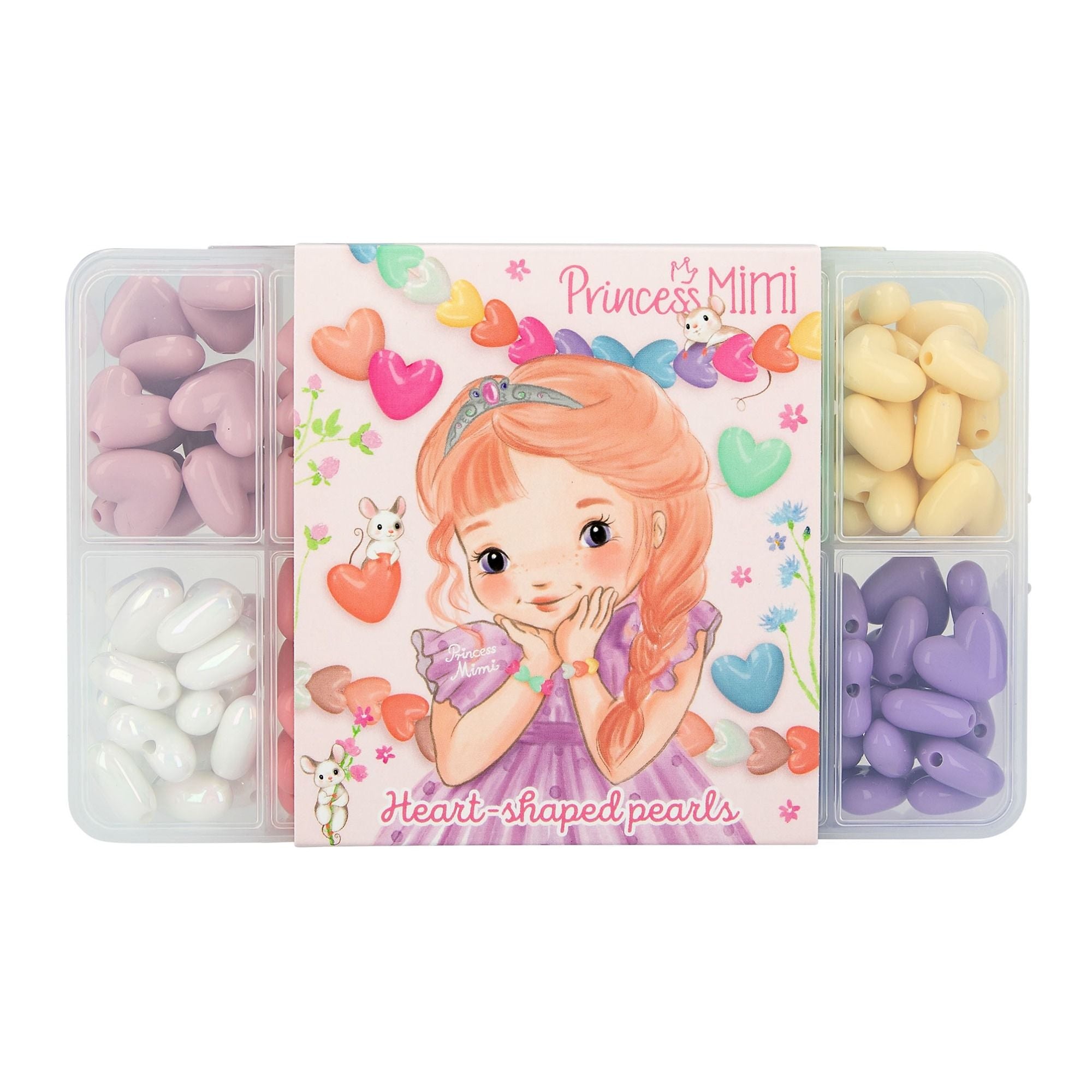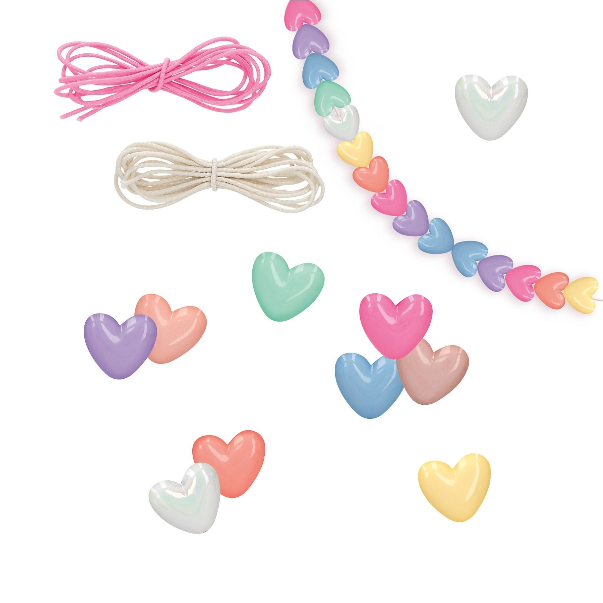 Herzige Schmuckstücke selber machen: Das Perlenset von Princess Mimi besteht aus niedlichen Herz-Perlen in 9 verschiedenen Farben (Perlmutt-Weiß, Rosa, Altrosa, Koralle, Pink, Mint, Gelb, Blau, Lila) und 2 elastischen Bändern in Pink und Creme (je 1,50 m). Alles verpackt in einer transparenten Klippverschluss-Box und mit beiliegender bebilderter Anleitung. Zum Fädeln und Freuen!