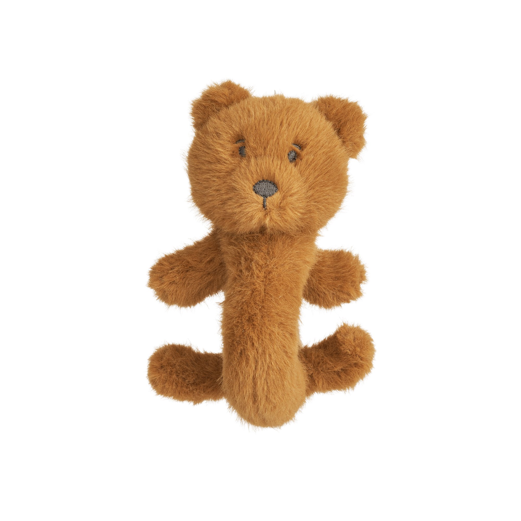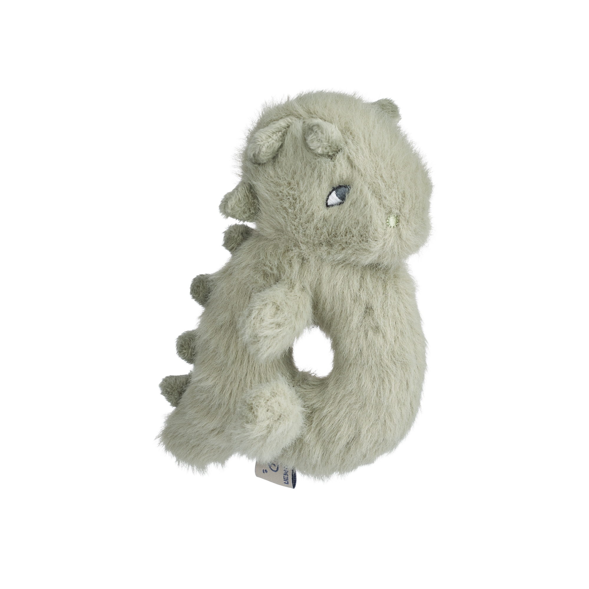 Die weiche Plüschrassel ist aus recyceltem Polyester hergestellt. Durch die Ring-Form passt die Rassel gut in die kleinsten Hände.