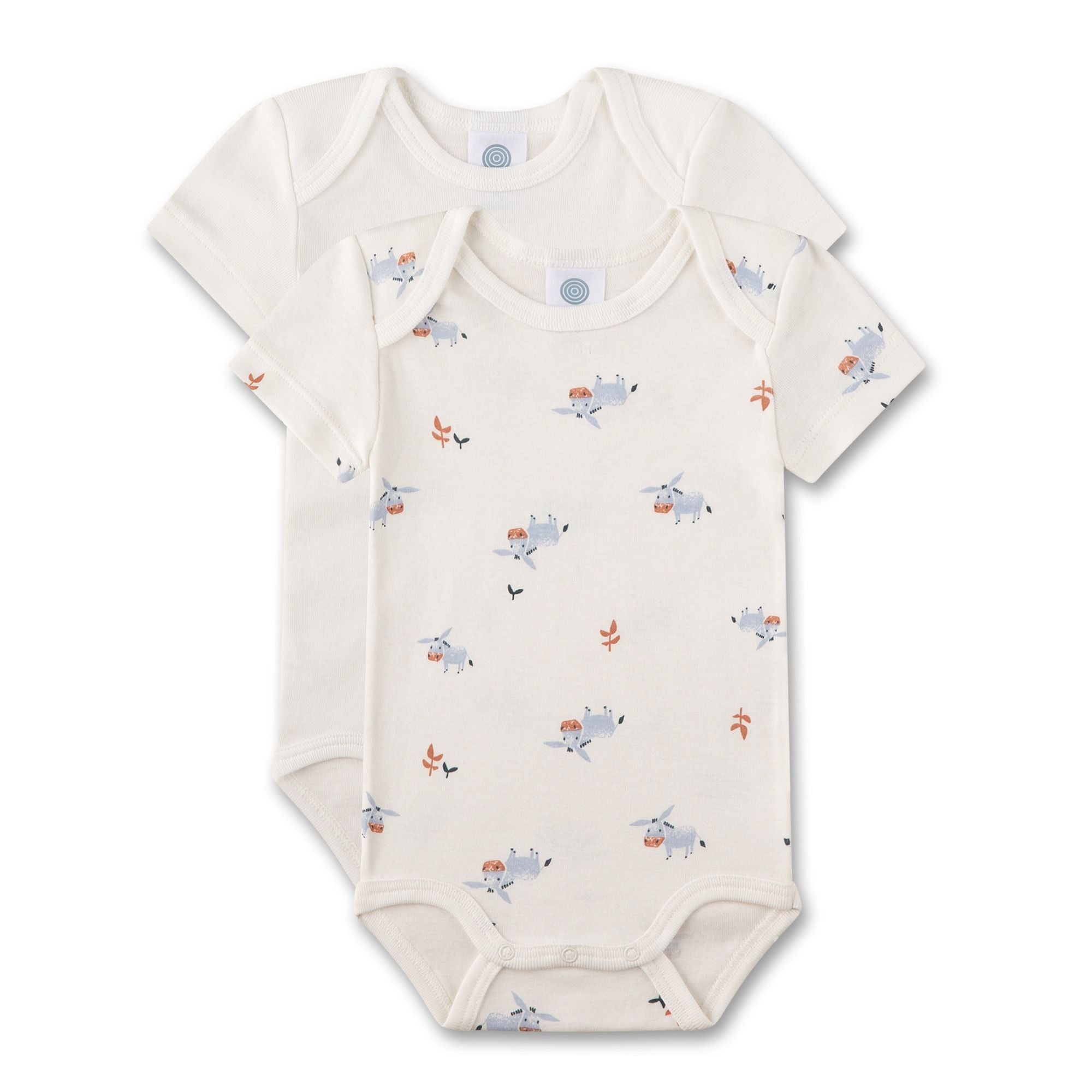 Diese Kurzarm-Bodys für Babys kommen im praktischen Doppelpack und begeistern mit einem niedlichen All-Over-Print von Eseln sowie einen schlichten Basic-Off-White. Die hochwertige Feinripp-Qualität besteht aus Bio-Baumwolle, was für besonders sanfte Hautpflege sorgt. Der Body ist mit einer amerikanischen Schulter ausgestattet, die das Hineinschlüpfen besonders einfach macht. Die gut schließenden Druckknöpfe im Schritt erleichtern das Windeln wechseln, und dank der pflegeleichten, trocknerbeständigen Eigenschaften ist der Body im Alltag besonders praktisch. Ein süßes, komfortables Set für dein Baby!