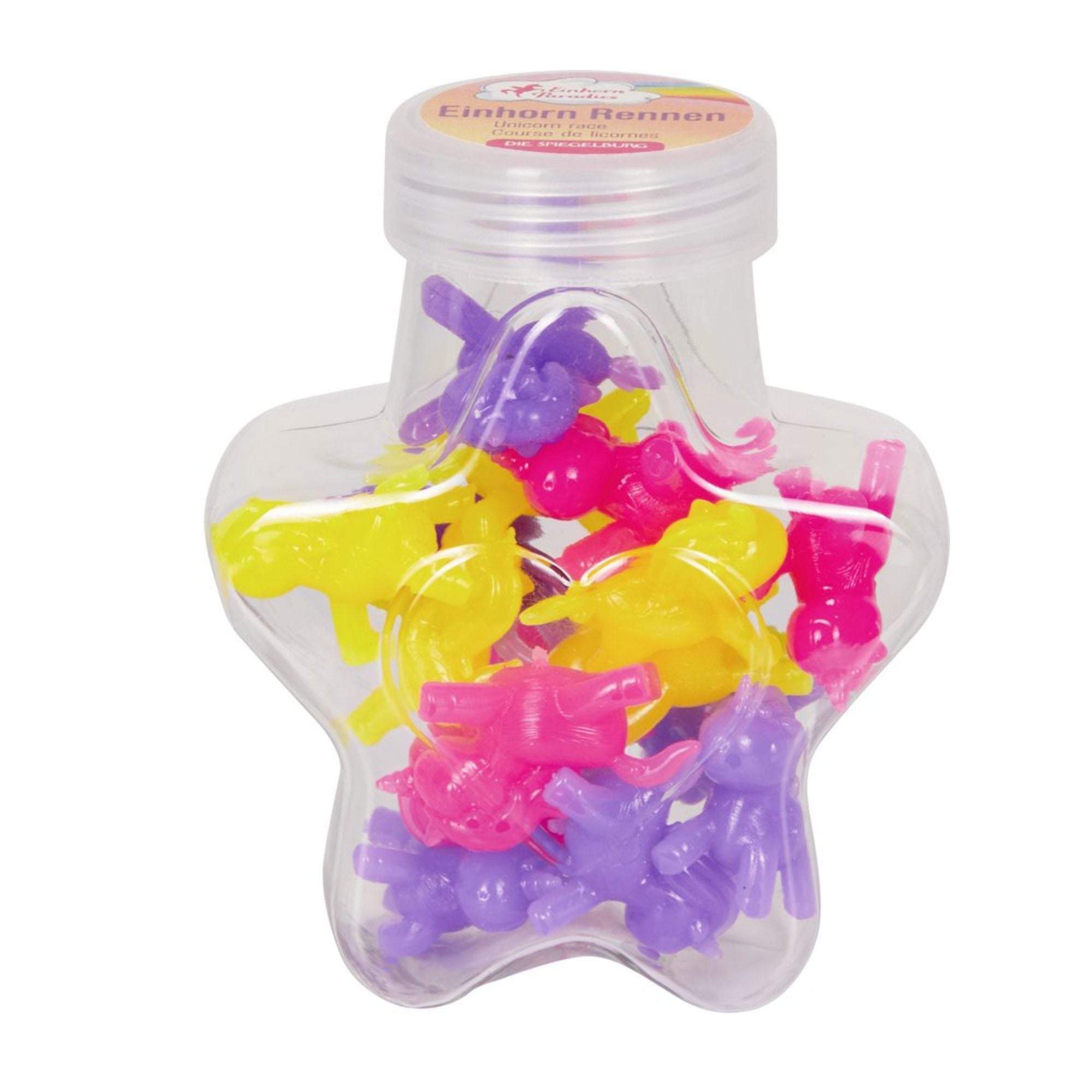 Willkommen im Einhorn-Paradies! Das Einhorn-Rennen ist ein Set aus 18 Einhörnern in 3 verschiedenen Farben. Fordere deine Freunde zum Einhorn-Duell! Die Spielidee ist einfach, aber spannend: Jeder Mitspieler lässt Einhörner einer bestimmten Farbe eine glatte Oberfläche herunterkrabbeln. Der Mitspieler, dessen Einhorn als Erstes den Boden erreicht, gewinnt das Wettrennen! Ein zauberhafter Zeitvertreib für echte Einhorn-Fans!