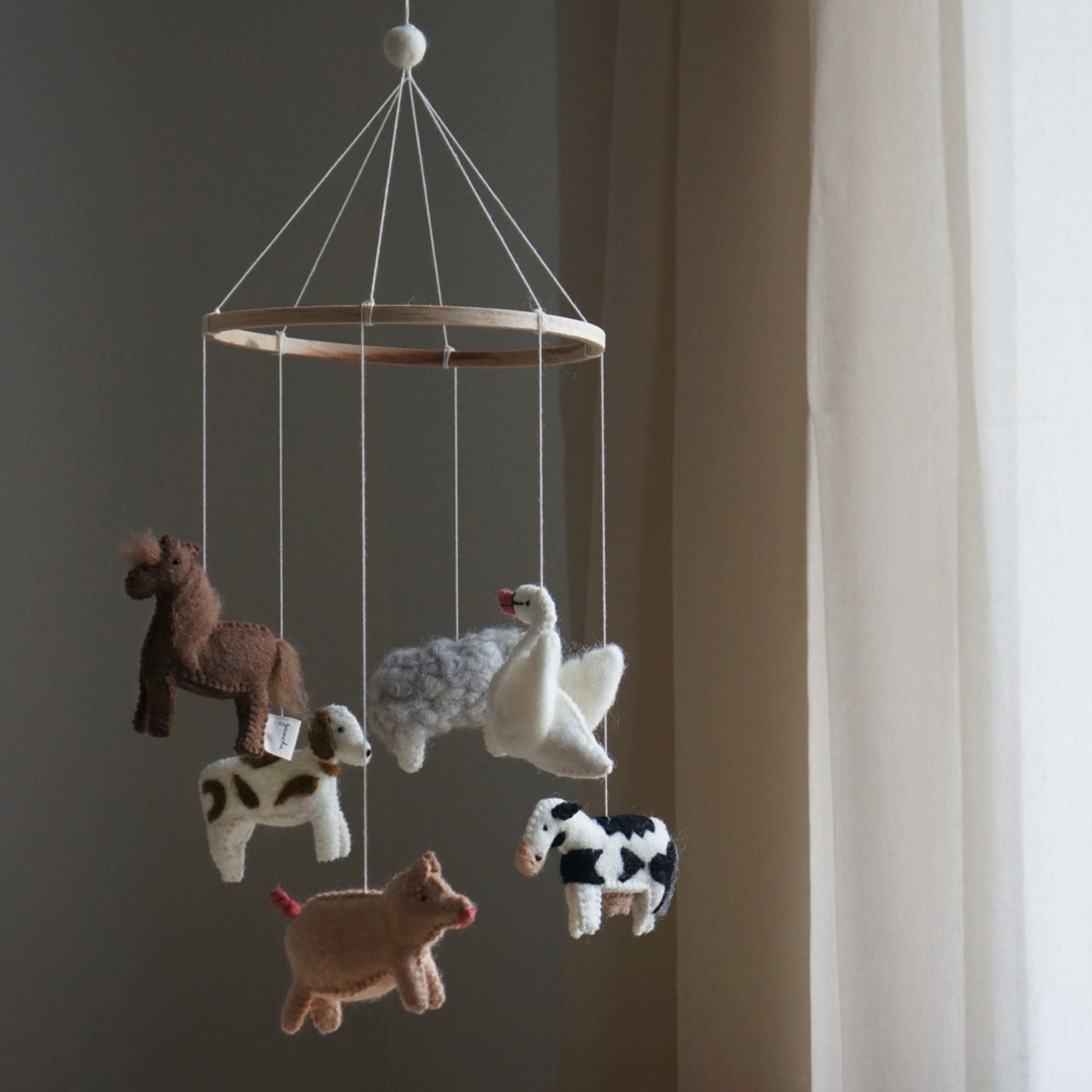 Dieses liebevoll gefertigte Mobile mit Bauernhoftieren ist eine wunderbare Ergänzung für jedes Kinderzimmer. Mit viel Sorgfalt und Liebe zum Detail von erfahrenen Kunsthandwerkerinnen hergestellt, bringt es die fröhliche Welt der Bauernhoftiere auf zauberhafte Weise ins Zuhause.