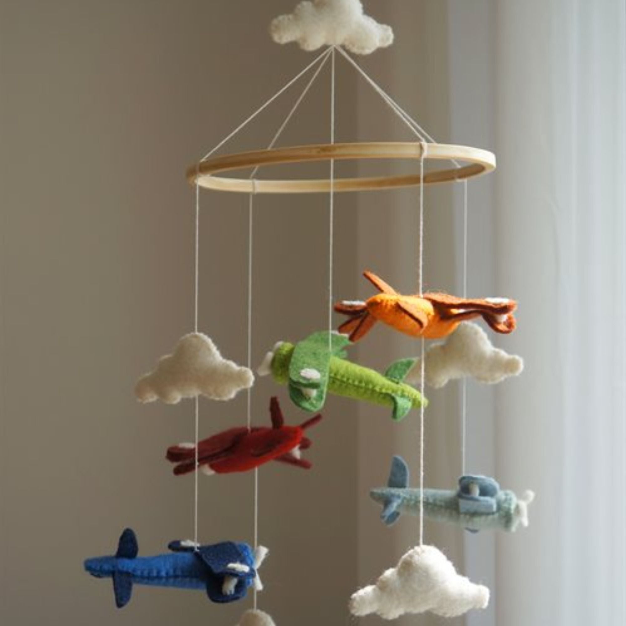 Dieses Mobile mit kleinen bunten Flugzeugen bringt Farbe, Leichtigkeit und ein Gefühl von Freiheit ins Kinderzimmer.
