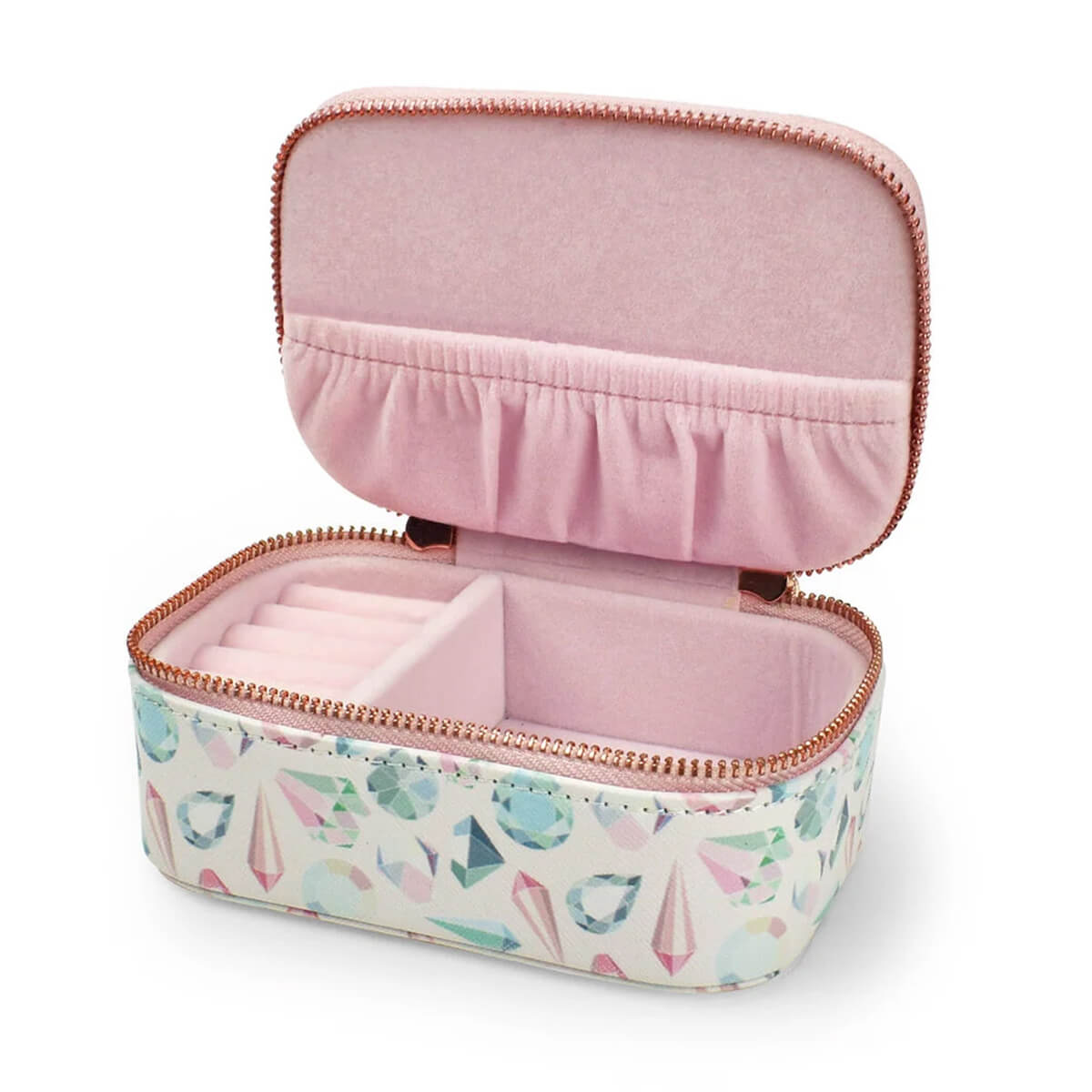 Schmuckkästchen „Bling Queen“ im Mini-Format für stilvolle und sichere Aufbewahrung deiner Lieblingsschmuckstücke. Das handliche Kästchen bietet drei praktische Fächer, in denen Ohrringe, Ringe und Armbänder übersichtlich sortiert werden können. Integrierte Haken sorgen dafür, dass Ketten ordentlich hängen und sich nicht verheddern. Das elegante Design macht das Schmuckkästchen zugleich zu einem dekorativen Highlight auf der Kommode. Der sichere Reißverschluss hält den Inhalt zuverlässig geschützt und sorgt dafür, dass alles an seinem Platz bleibt. Ideal für Zuhause, auf Reisen oder als charmantes Geschenk für Schmuckliebhaberinnen.