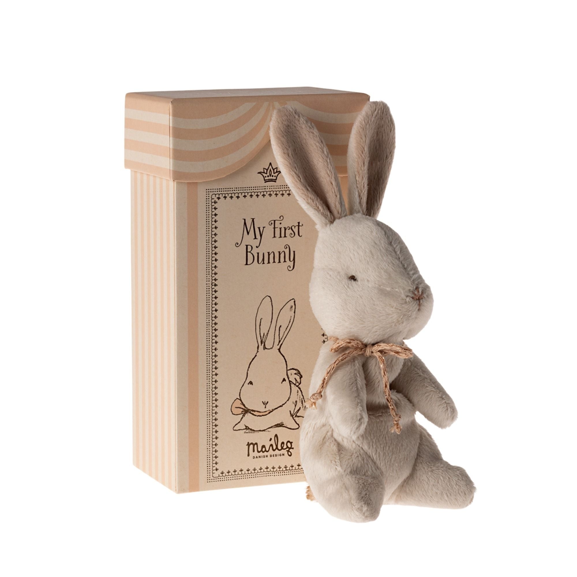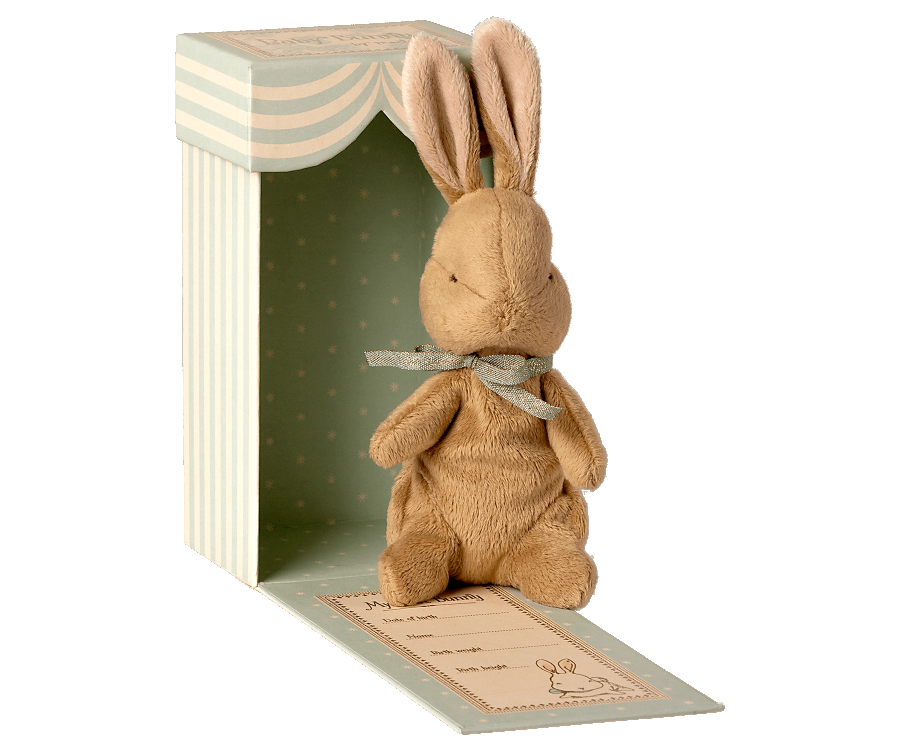 Mein erster Hase von Maileg, eignet sich ideal als Geschenk für Neugeborene. Der Hase ist aus sehr weichem Plüsch gefertigt und eignet sich sehr gut für kleine Hände. Er trägt eine farbige Schleife um den Hals und kommt in einer passenden Geschenkbox, in dieser können die Geburtsdaten des Neugeborenen festgehalten werden.