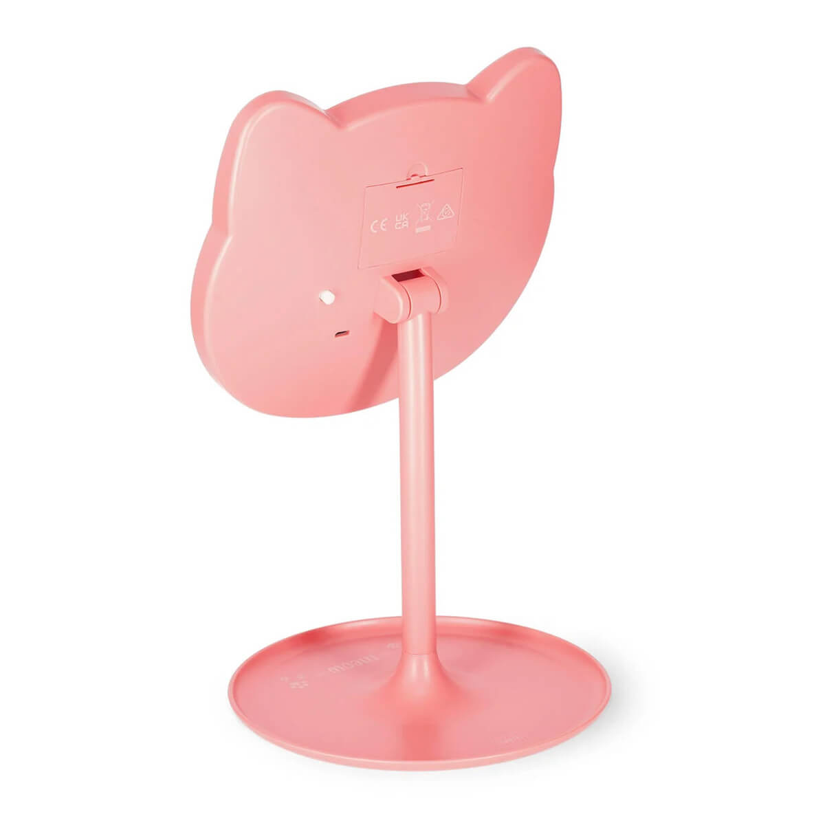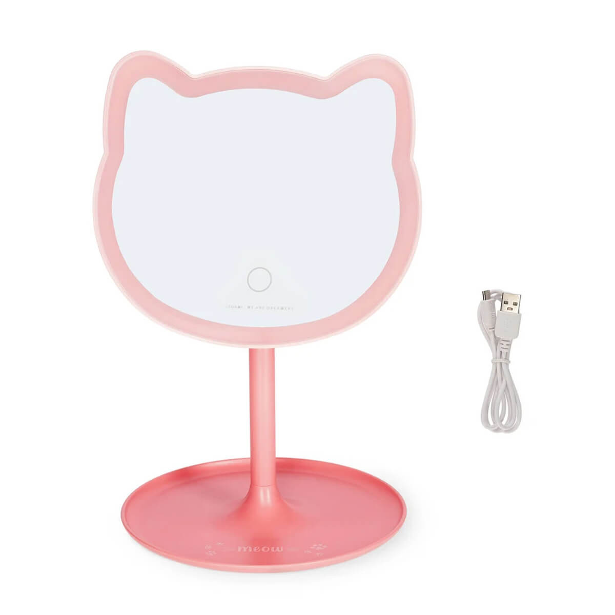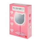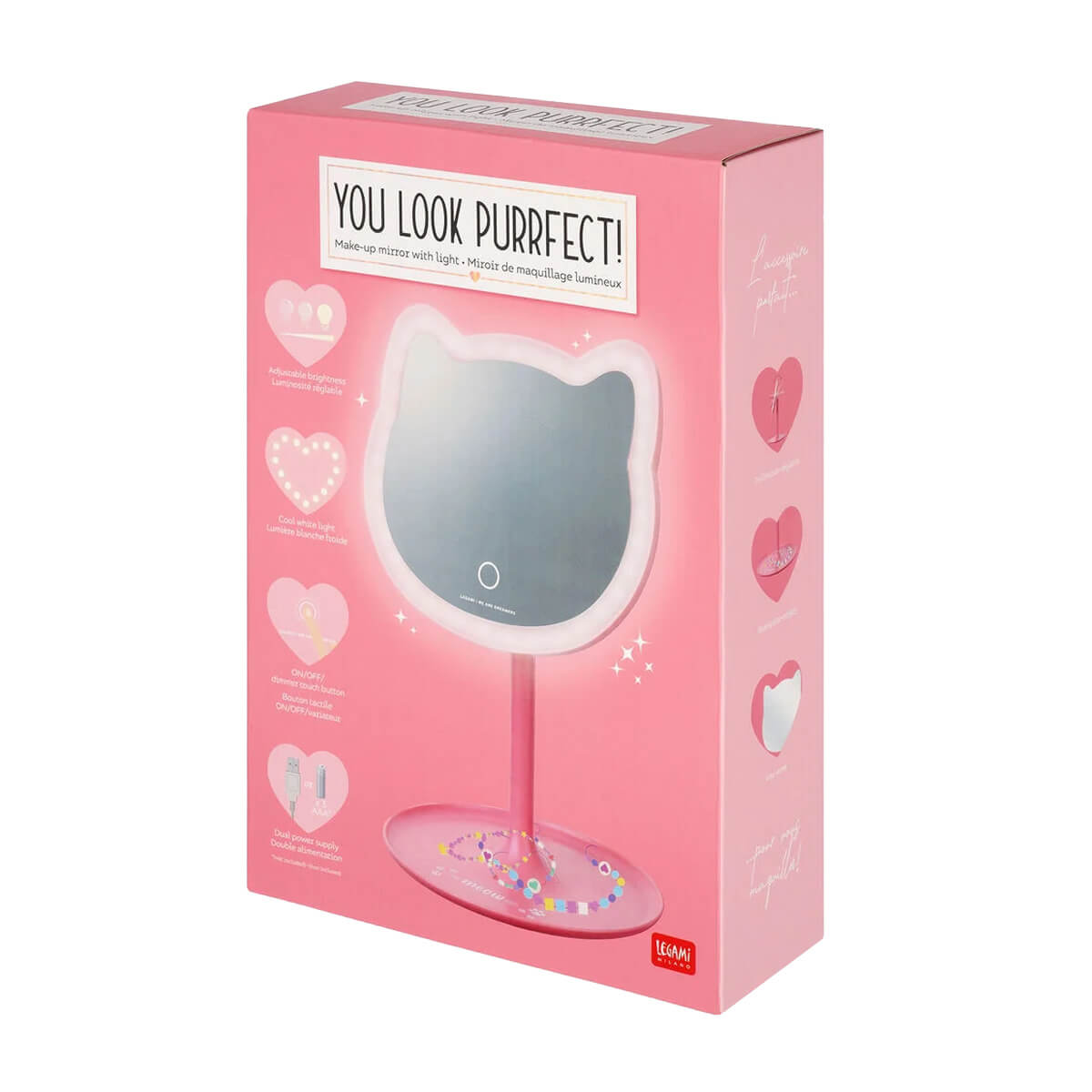 Tisch-Schminkspiegel „You Look Purrfect!“ mit 33 LEDs für eine gleichmäßige, helle Ausleuchtung beim Schminken und Stylen. Die Beleuchtung lässt sich über eine Berührungstaste ein- und ausschalten sowie stufenlos dimmen, um die Lichtintensität individuell anzupassen.