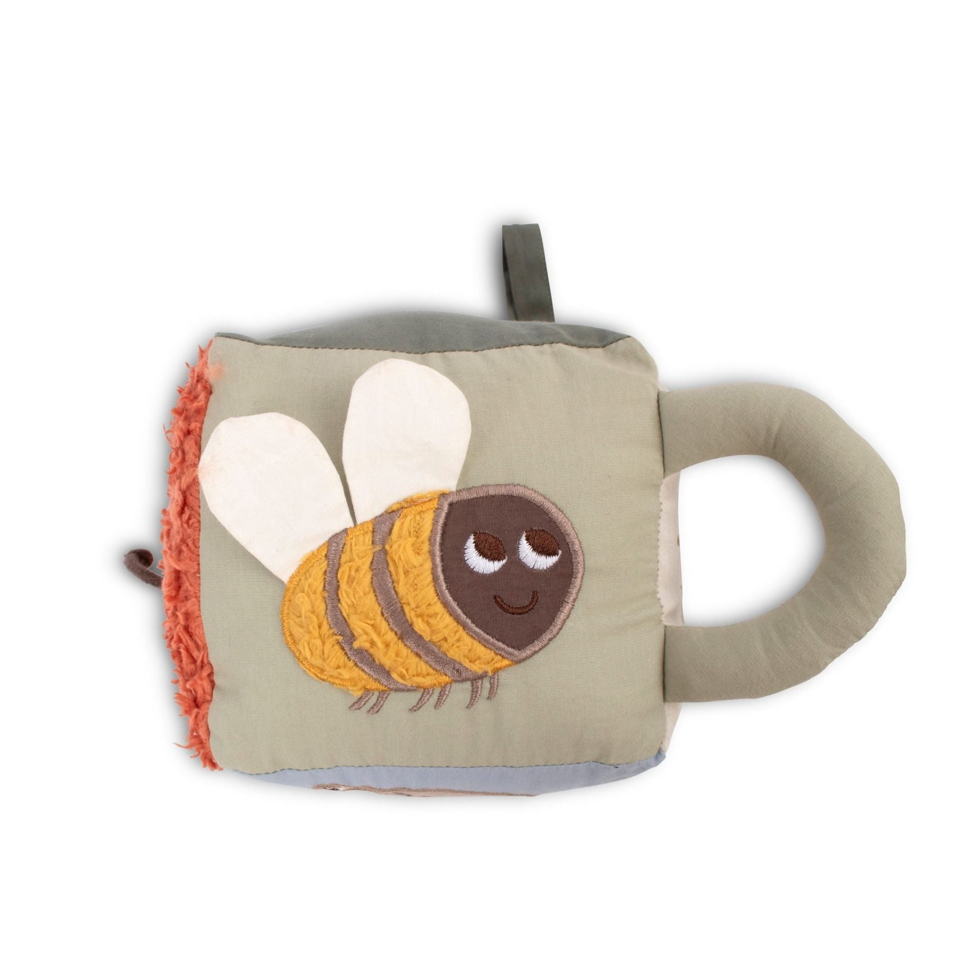 Der Würfel ist vollgepackt mit anregenden Details wie Spiegel, Glocke, Illustrationen, Knistergeräuschen, Schnüren und Stoffen, so dass es für kleine Hände viel zu entdecken gibt.