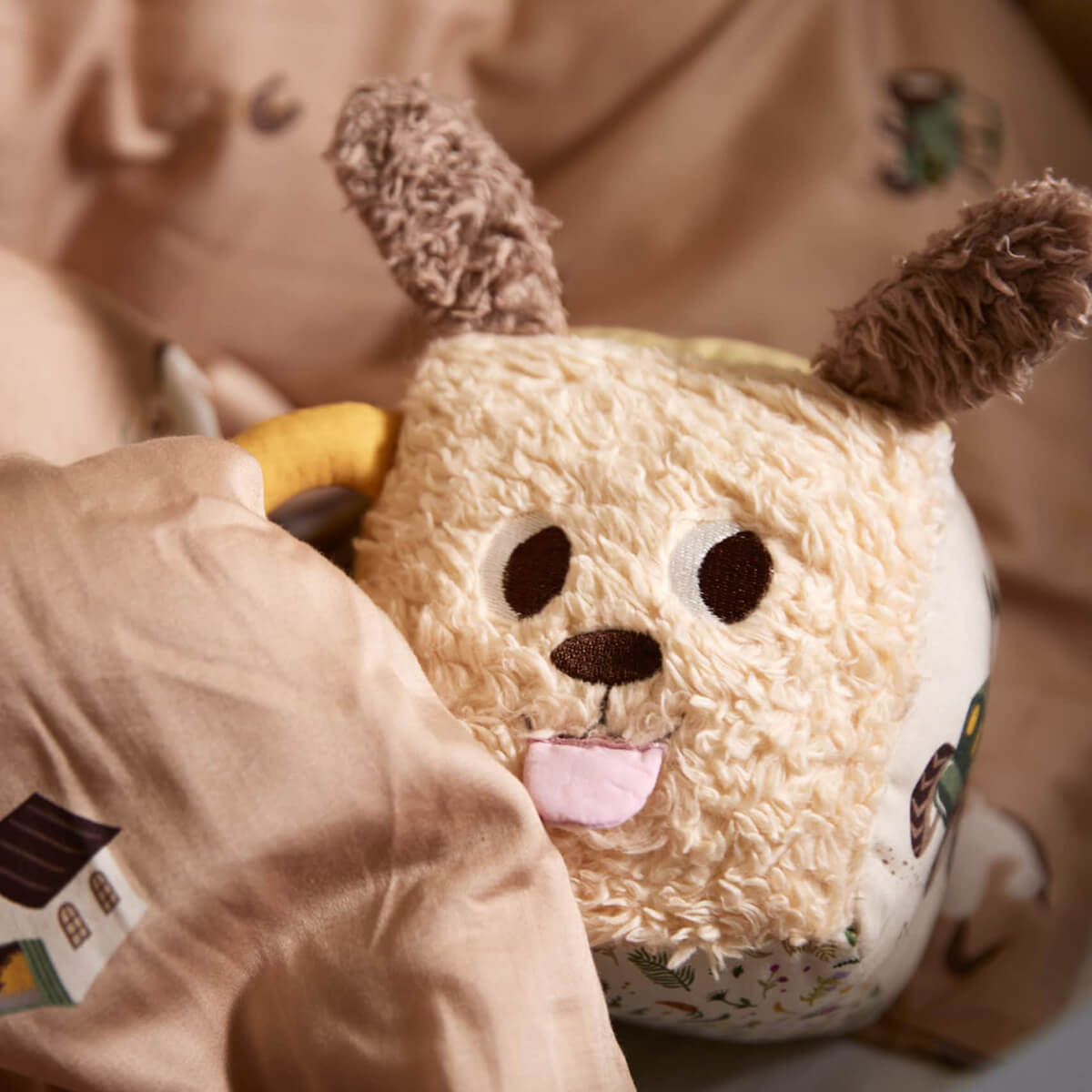 Der weiche Würfel ist mit verschiedenen Elementen auf jeder Seite mit vielen niedlichen Details und ruhigen Farbtönen gestaltet.