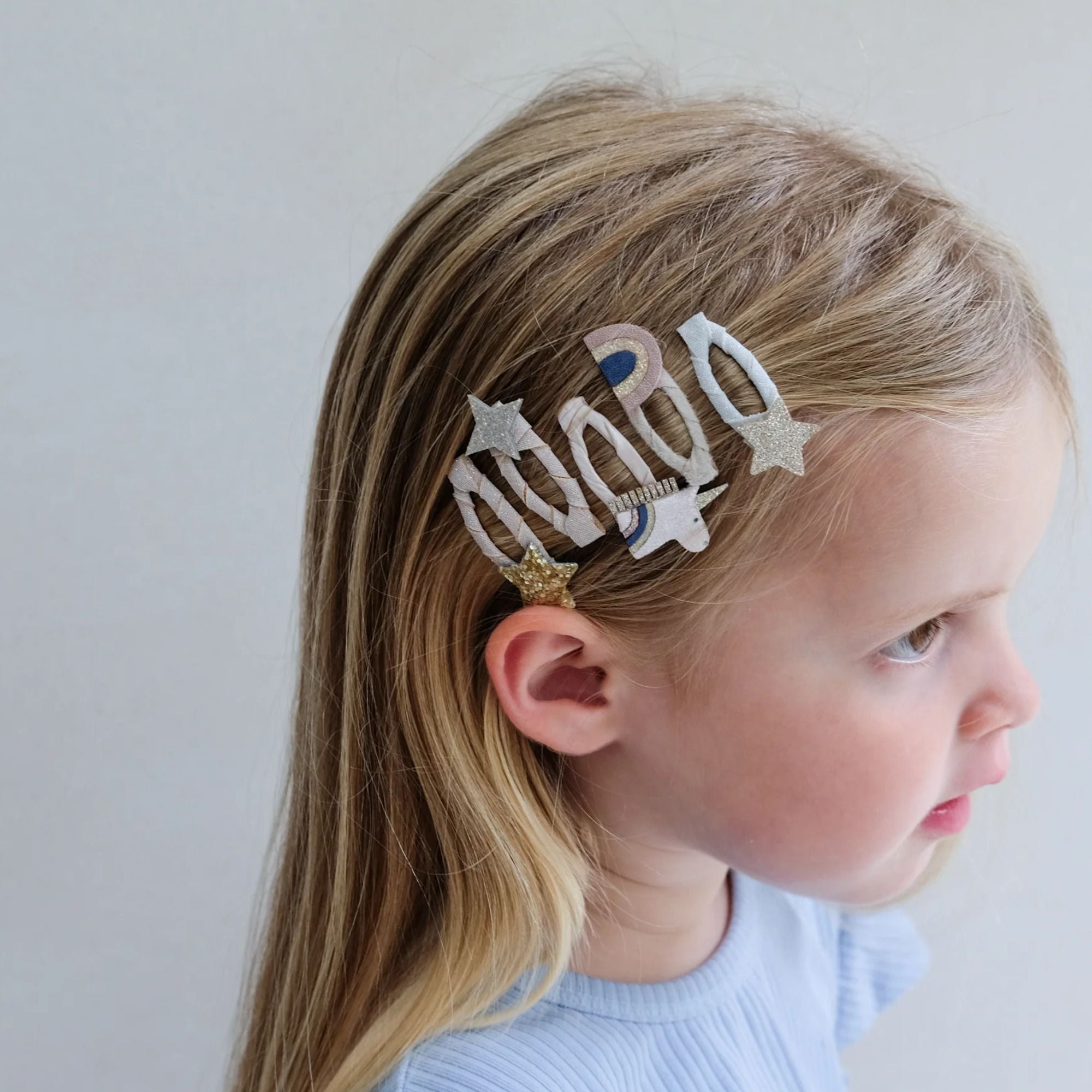 Lassen Sie Ihrer Fantasie freien Lauf und kreieren Sie mühelos bezaubernde Frisuren für jeden Anlass mit unseren entzückenden Haarspangen-Sets von MIMI & LULA!