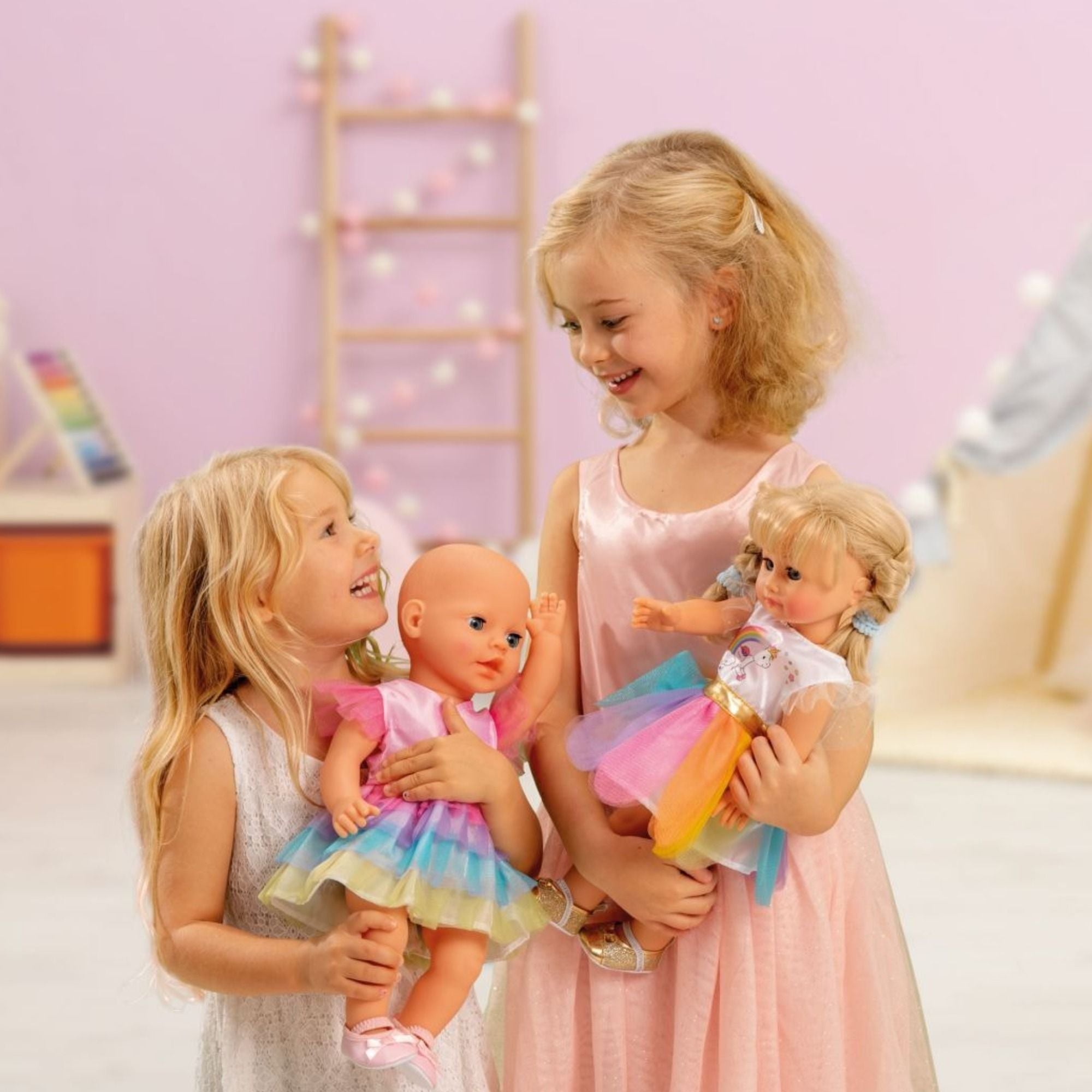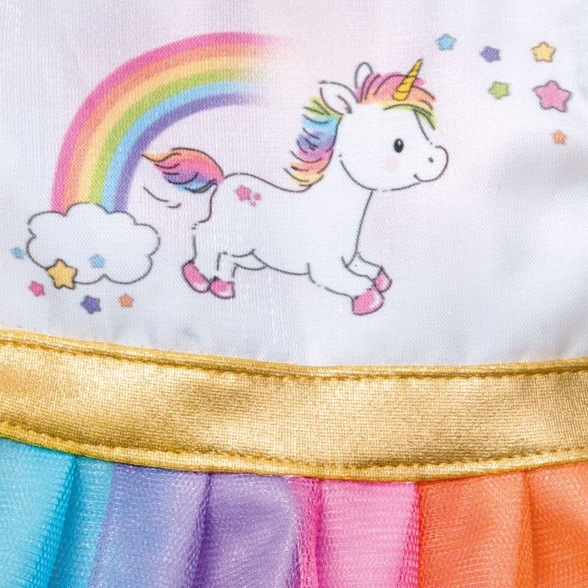 Es wurde mit viel Liebe zum Detail gestaltet: Der prächtige, mehrlagige Tüllrock in Blütenform zeigt alle Regenbogenfarben, und auf der Brust findet sich das niedliche Einhorn "Henri" mit Regenbogen und bunten Sternchen wieder.