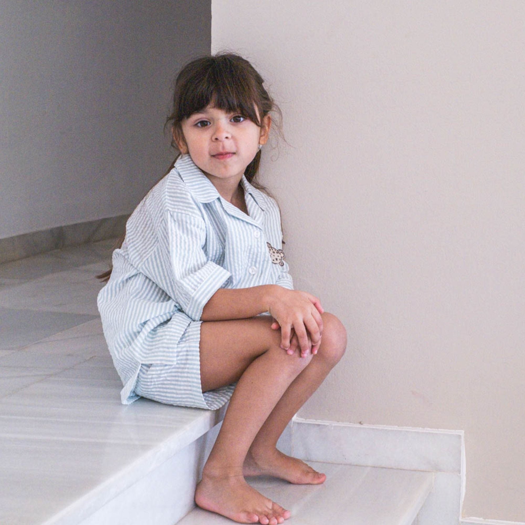 Shorts aus weichem Seersucker mit Streifen. Die Shorts haben einen elastischen Bund für eine bequeme Passform und eine lockere Passform, die viel Bewegungsfreiheit bietet. Perfekt für heiße Sommertage mit ihrem leichten und luftigen Material.