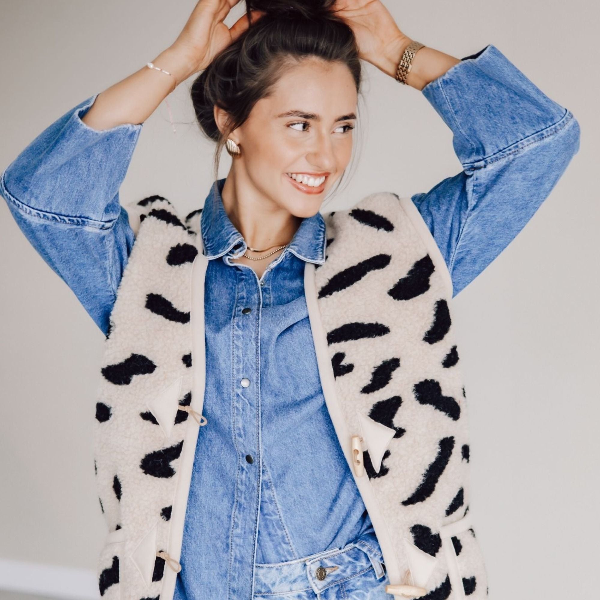 Der Klassiker von Alwero jetzt im Leo Print. Eine weiche Weste aus Wolle für Erwachsene, die man problemlos über allem tragen kann. Schön warm, und doch atmungsaktiv, damit man nicht schwitzt. Die Weste wird vorne mit Holzknöpfen geschlossen und hat zwei aufgesetzte Taschen auf der Vorderseite.