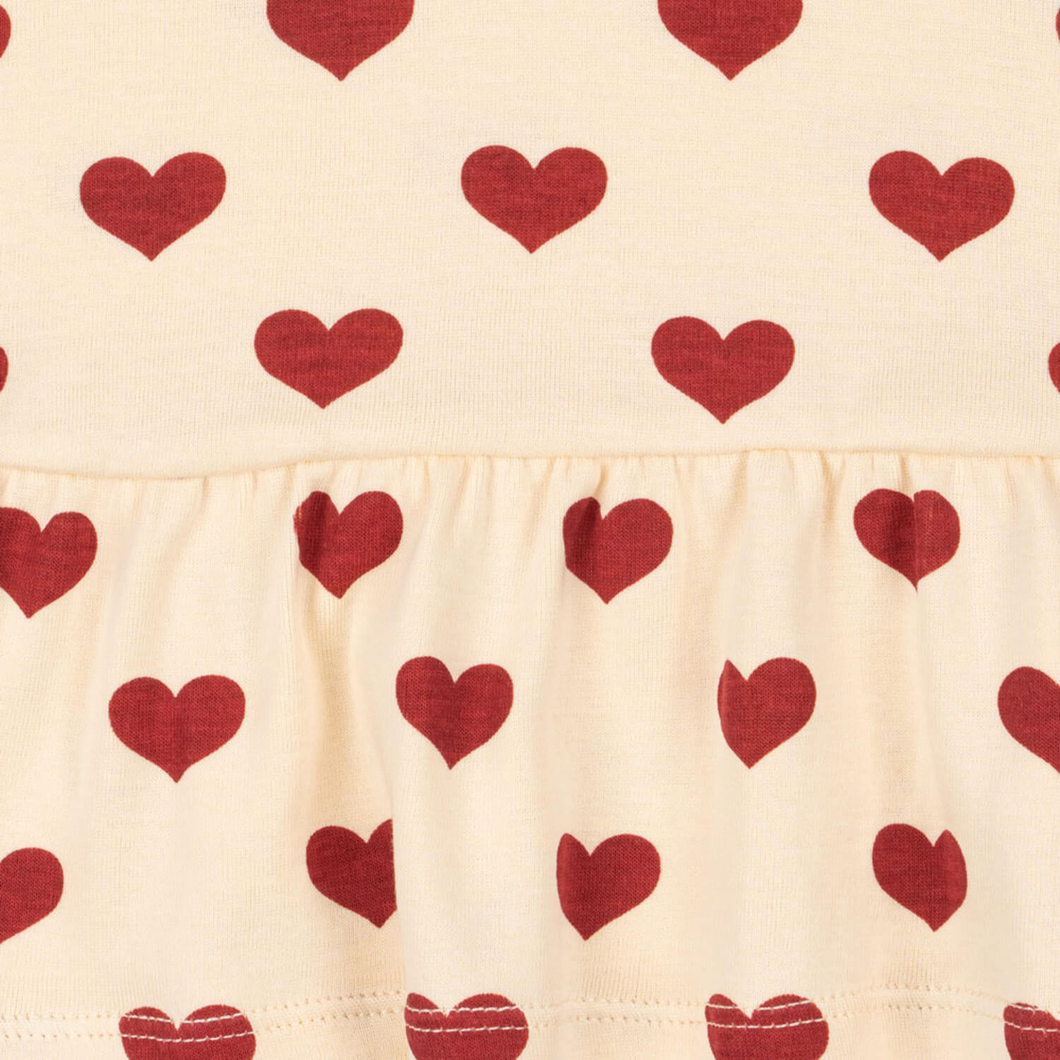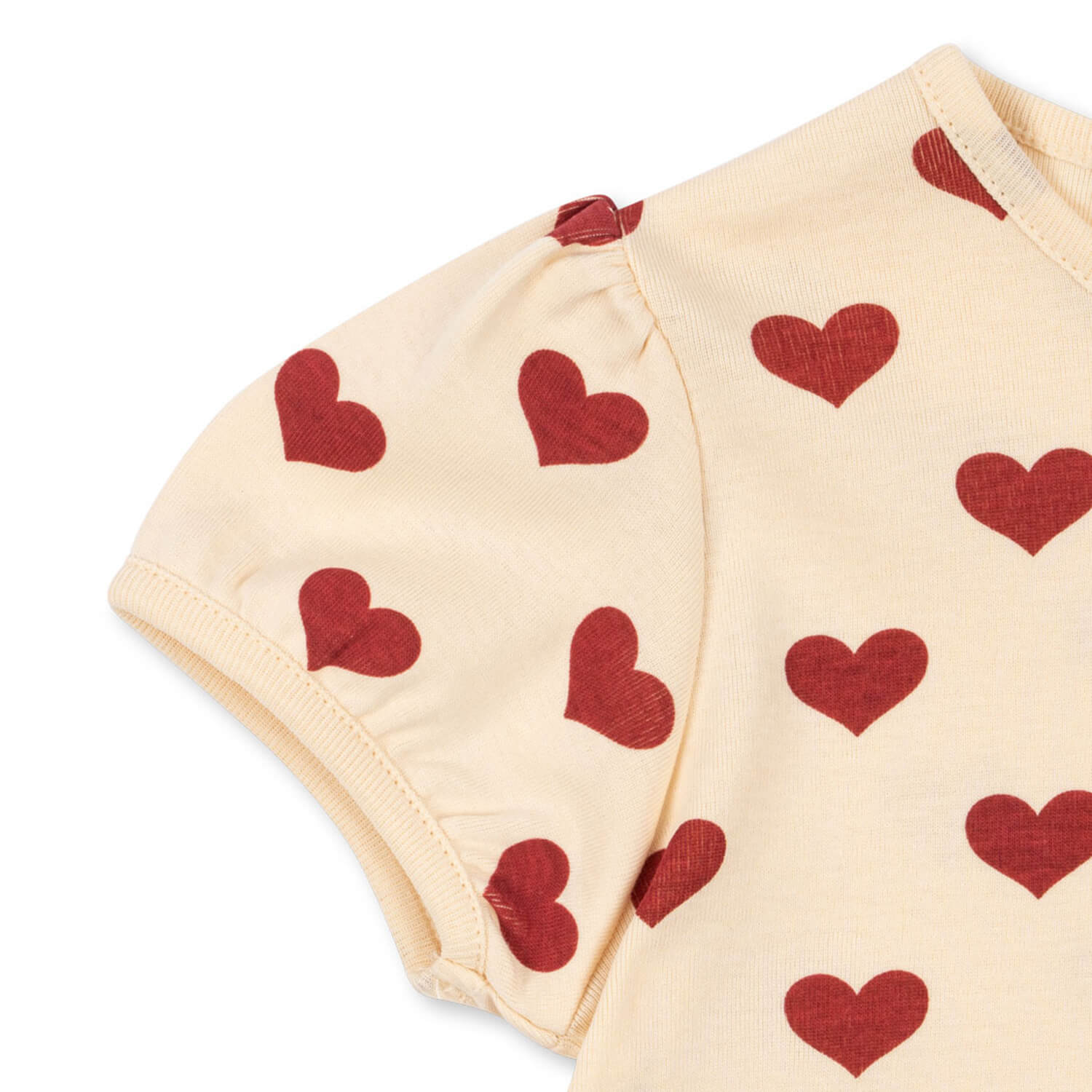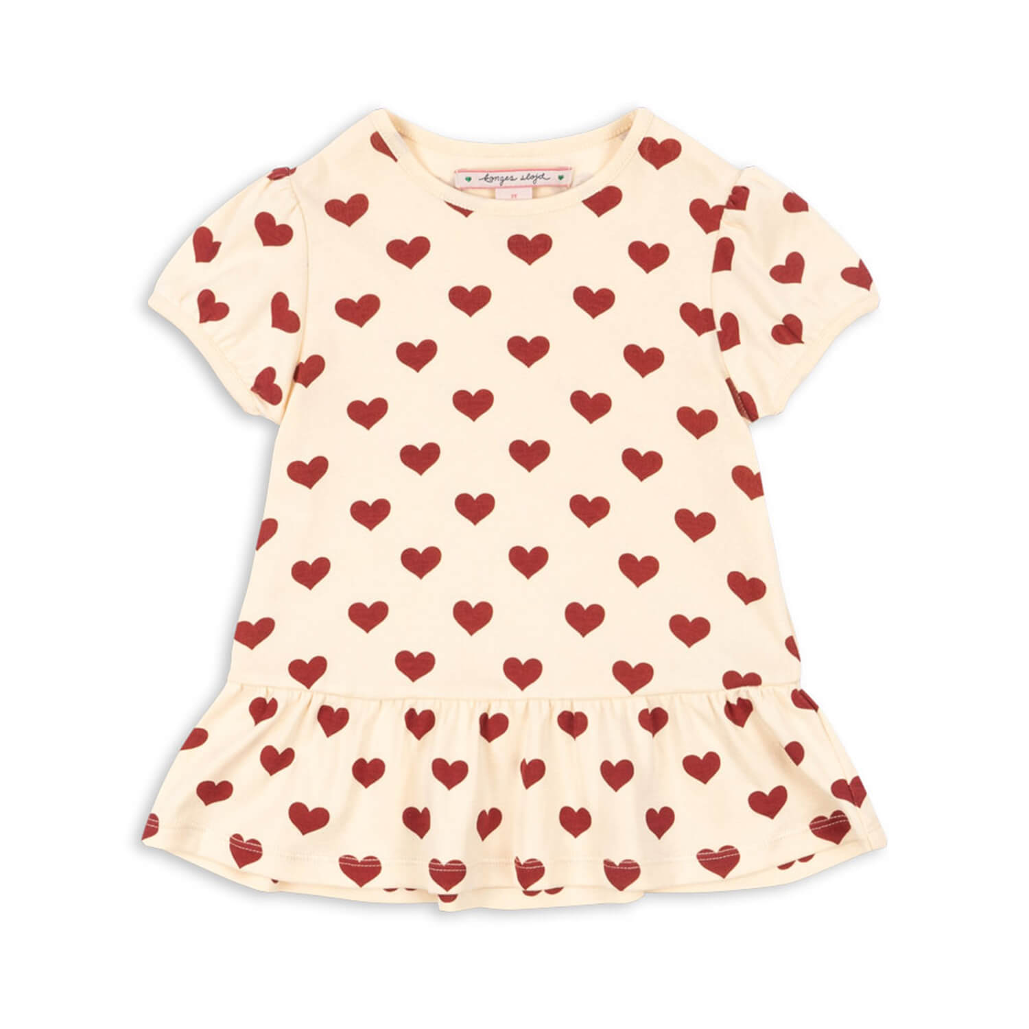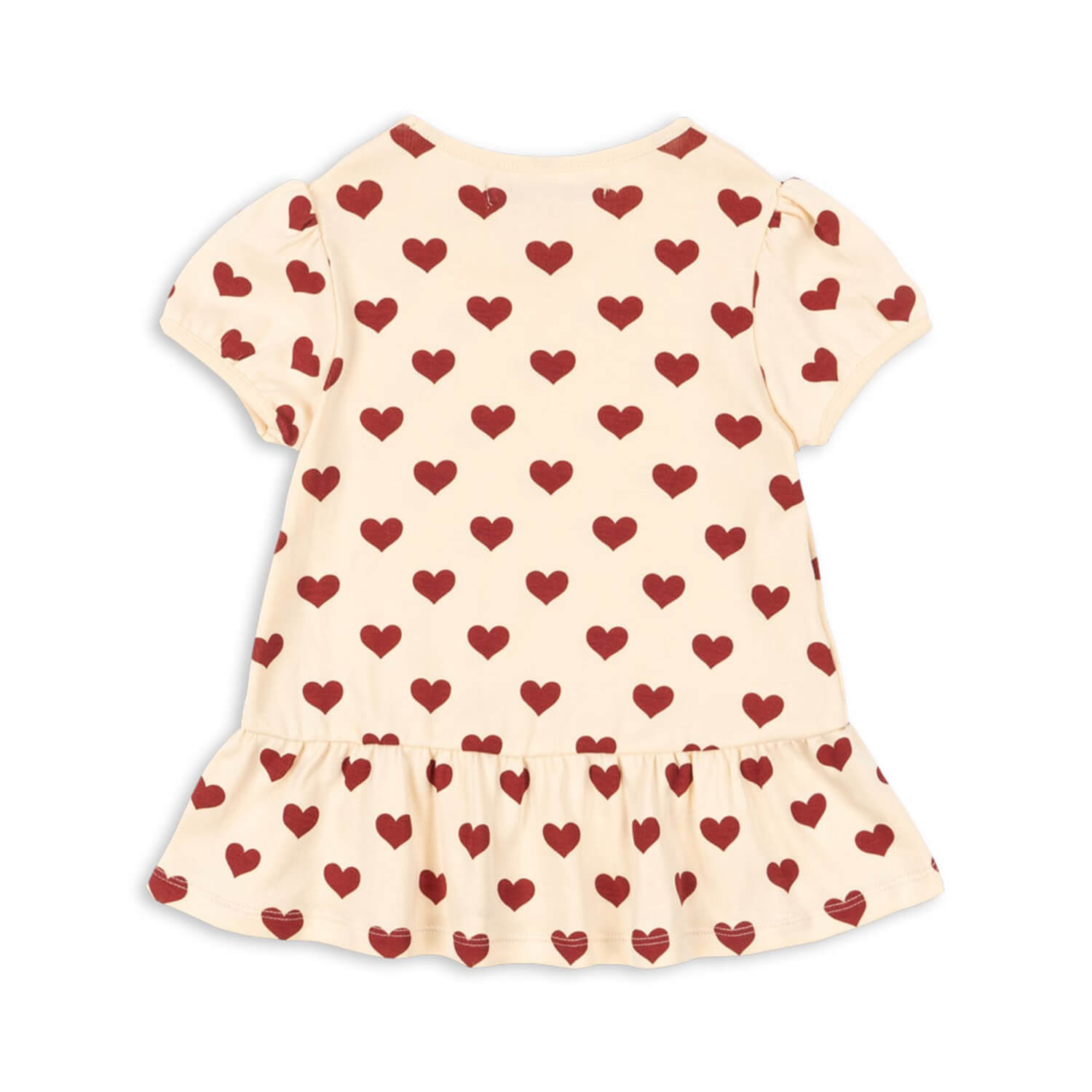 Das klassische T-Shirt ist aus 100% -zertifizierter Bio-Baumwolle und mit einem Herzchen Print gefertigt. Die Taille ist mit einem Schößchen gearbeitet, sodass es einen verspielten Look erzeugt.
