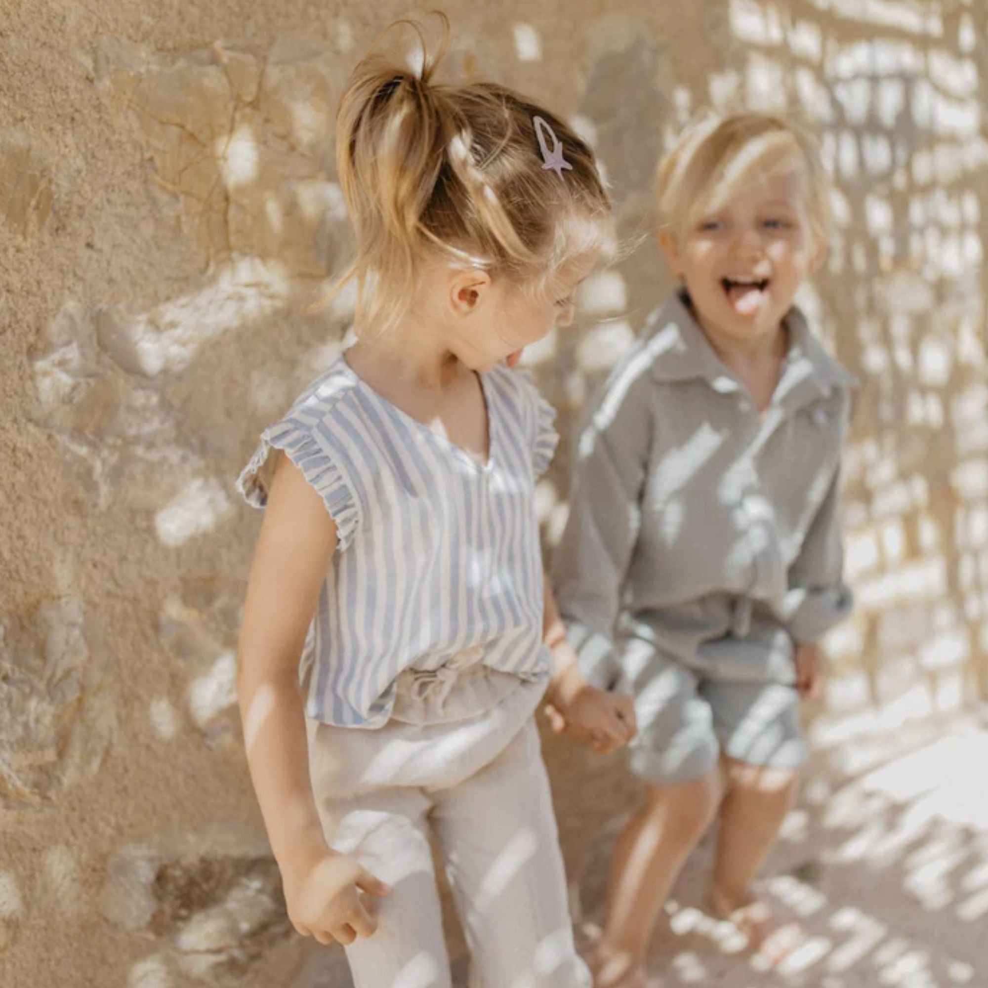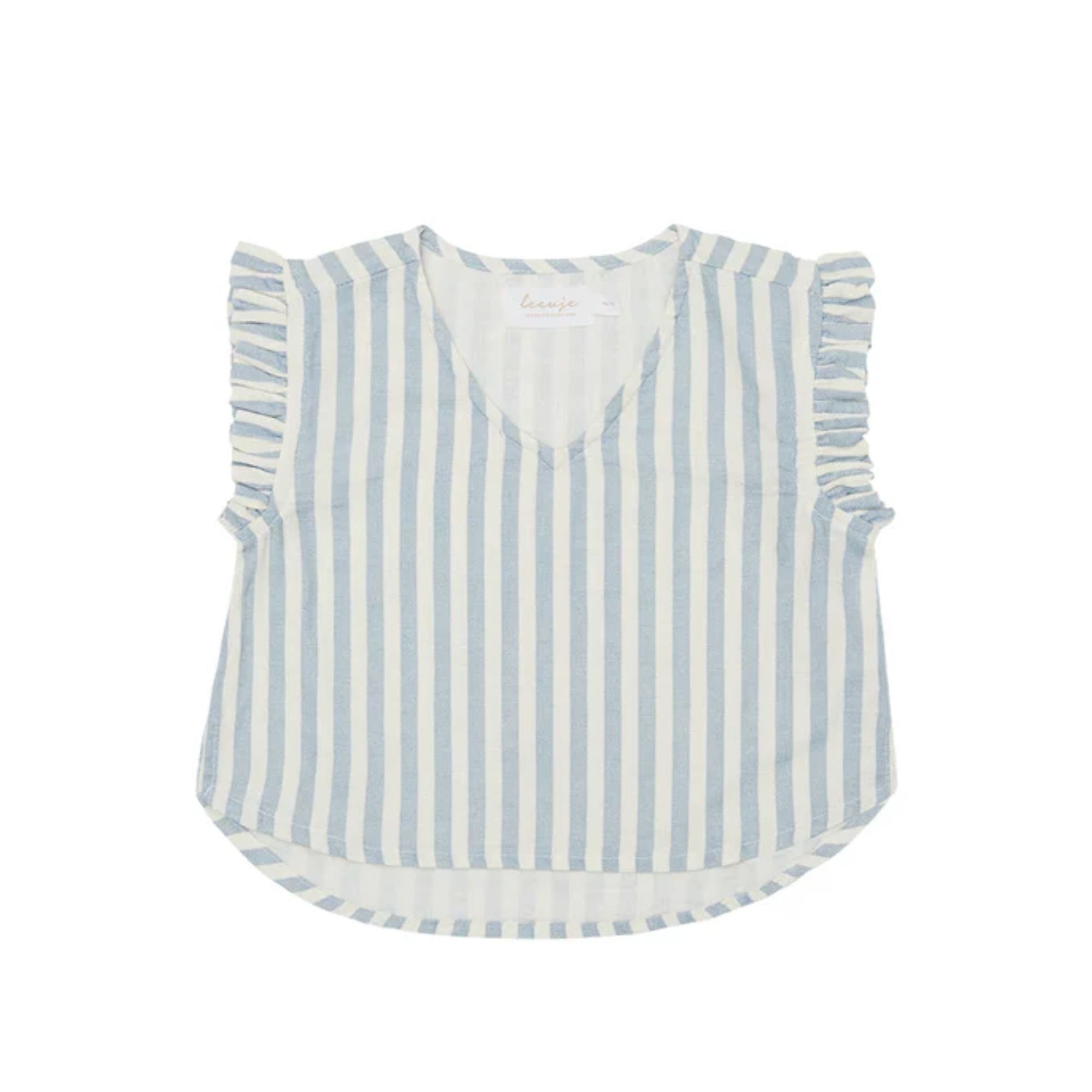 Dieses süße Kinder-Top vereint sommerlichen Stil mit nachhaltiger Qualität. Die blau-weiß gestreifte Optik verleiht dem Oberteil einen frischen, maritimen Look. Hergestellt aus einer hochwertigen Mischung aus Baumwolle und Leinen, bietet das Top ein angenehmes Tragegefühl – leicht, atmungsaktiv und perfekt für warme Tage.