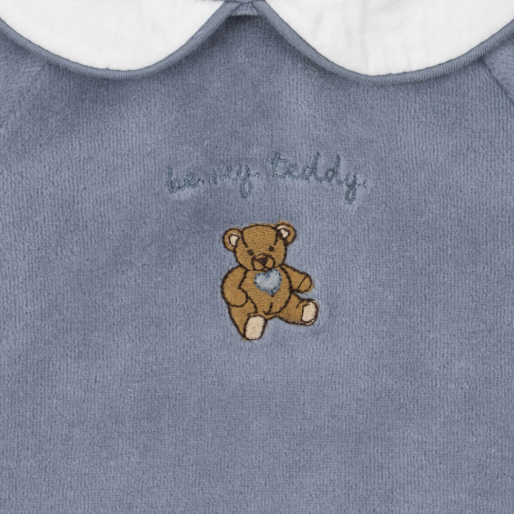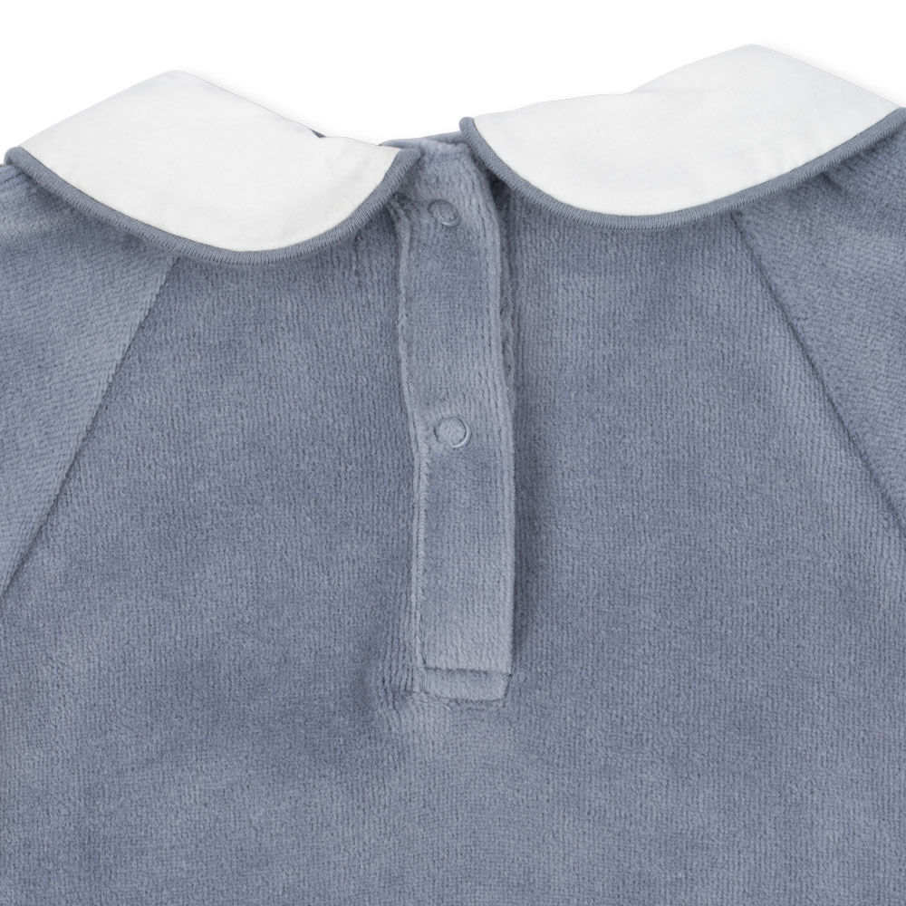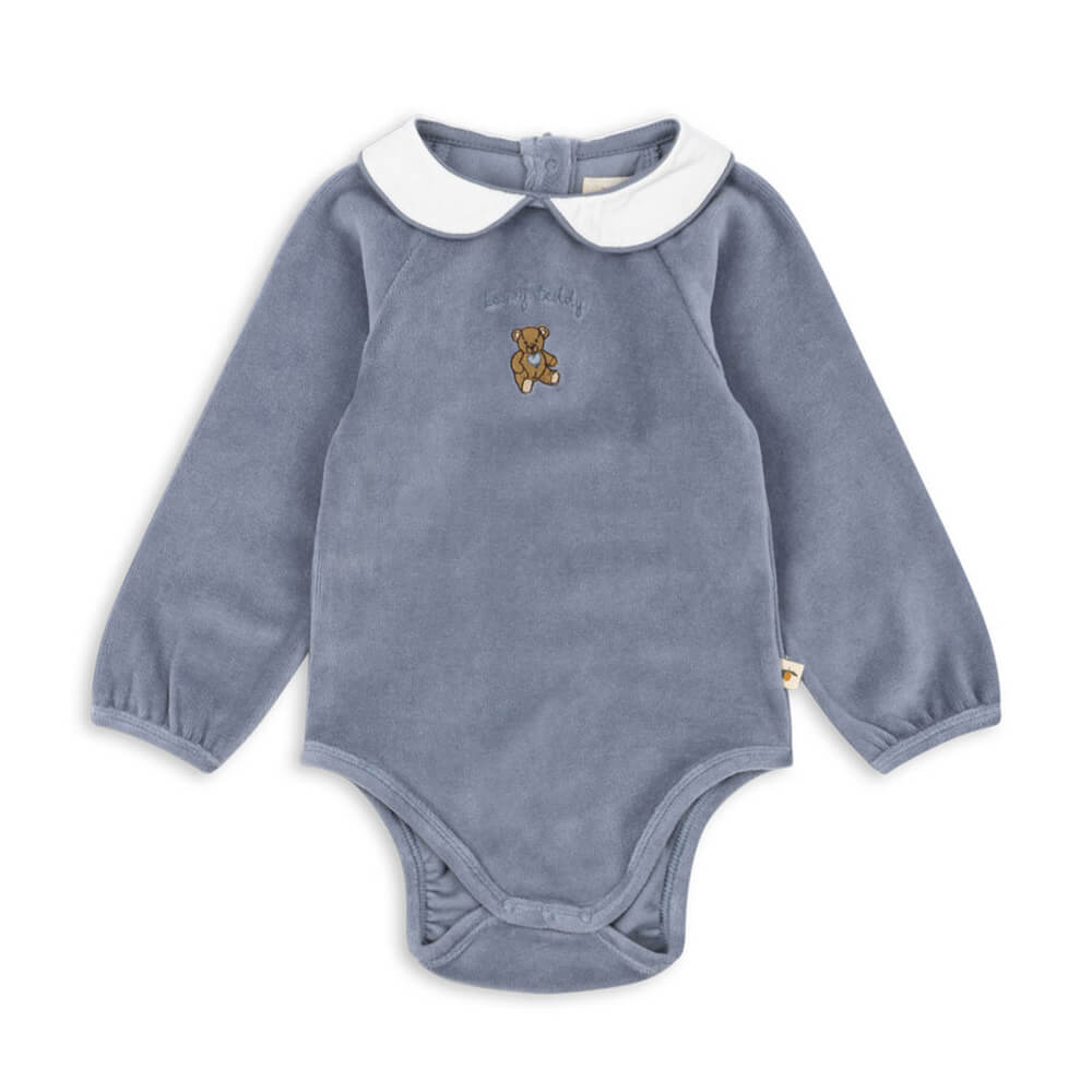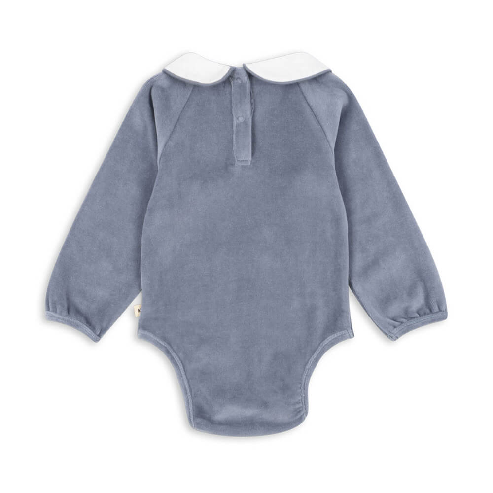 Der weicher Samt-Body mit dekorativem Kragen ist aus Bio-Baumwolle hergestellt. Ein schönes Detail ist die Stickerei auf der