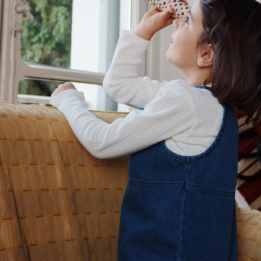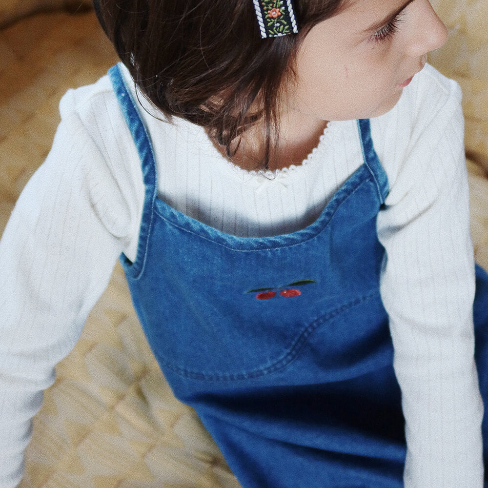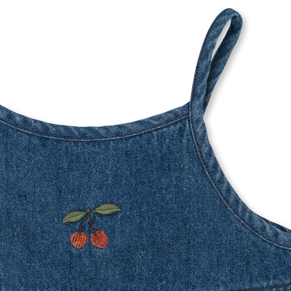 Das Magot Trägerkleid ist aus Bio-Baumwolle in Denim-Qualität hergestellt. Der ausgestellte Rock und die gestickten Kirschen auf der Vorderseite verleihen dem Kleid einen besonderen Charme.