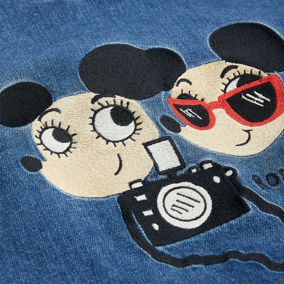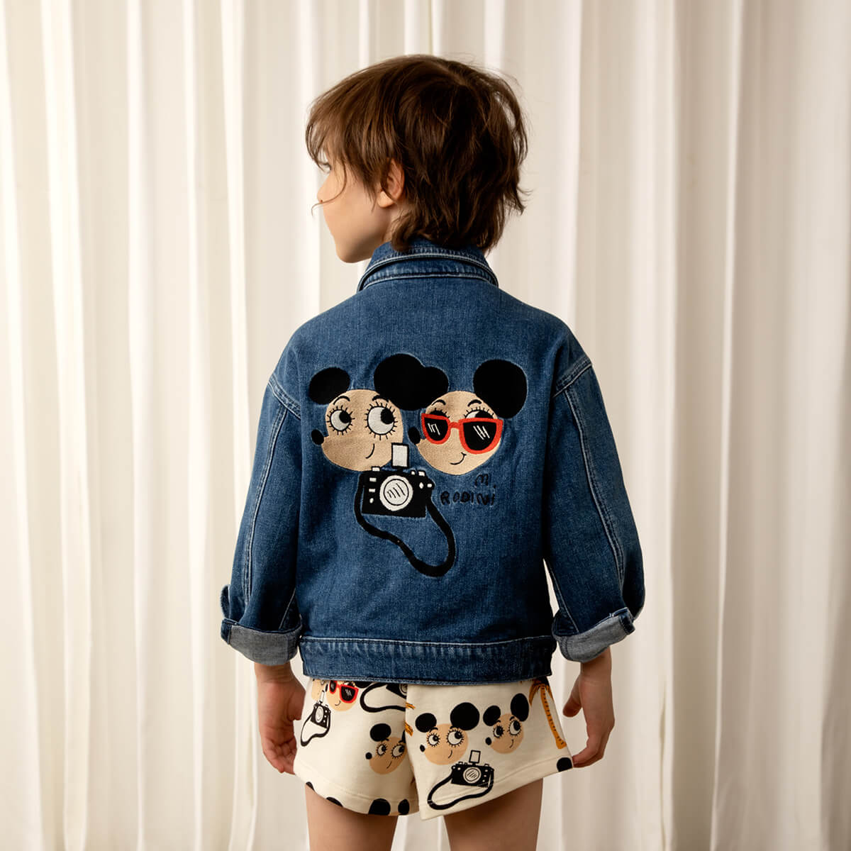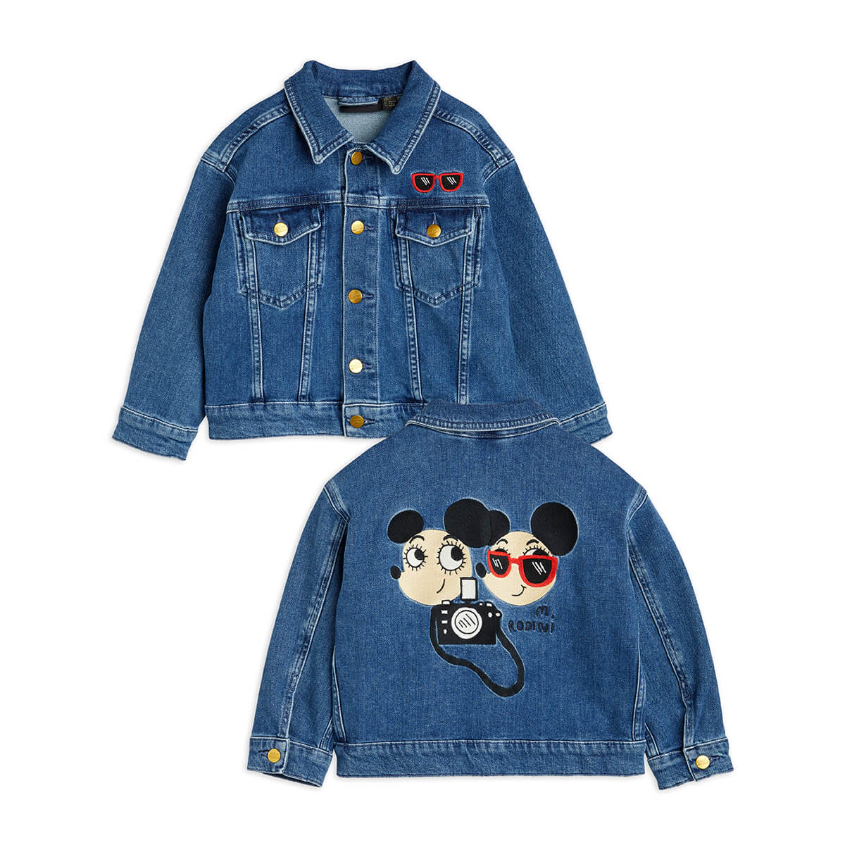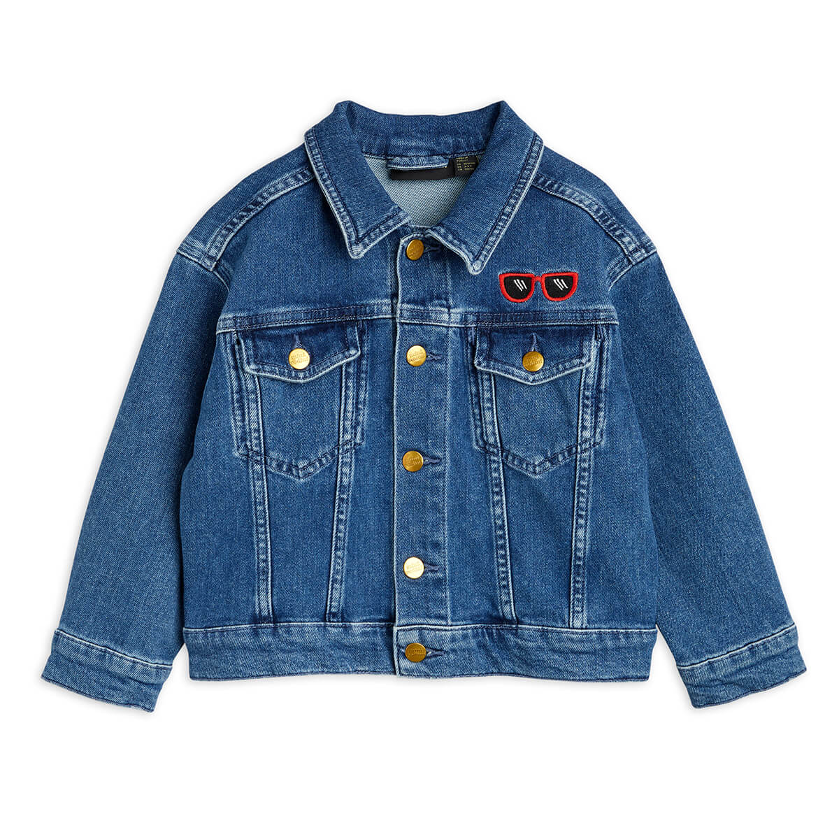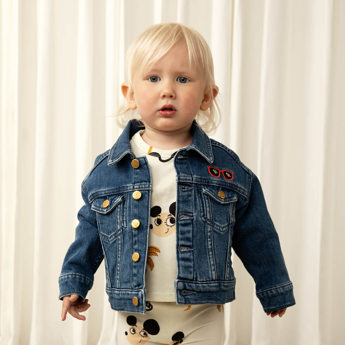 Jeansjacke mit Sonnenbrillen-Aufnäher aus -Bio-Baumwolle mit leichtem Stretch-Anteil. Ausgestattet mit zwei Vordertaschen mit Knopfverschluss und einer Knopfleiste. Ritzratz Mäuse Motiv auf dem Rücken. Eine perfekte leichtere Jacke zum Überziehen, die im Frühling oder in warmen Sommernächten getragen werden kann. Wenn Sie darunter wärmende Fleece- oder Wollkleidung tragen, sind Sie auch für kältere Tage gerüstet.