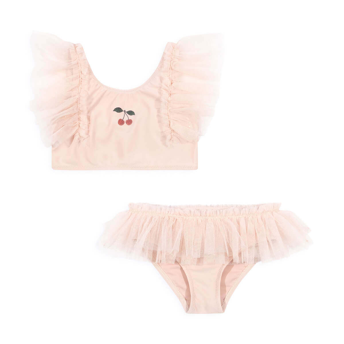 Der niedliche Bikini ist aus recyceltem Polyester gefertigt. An den Trägern und am Bund des Unterteil ist der Bikini mit Rüschen aus mehrlagigem Tüll verziert. Das Oberteil wurde mit einer süßen Applikation designt.