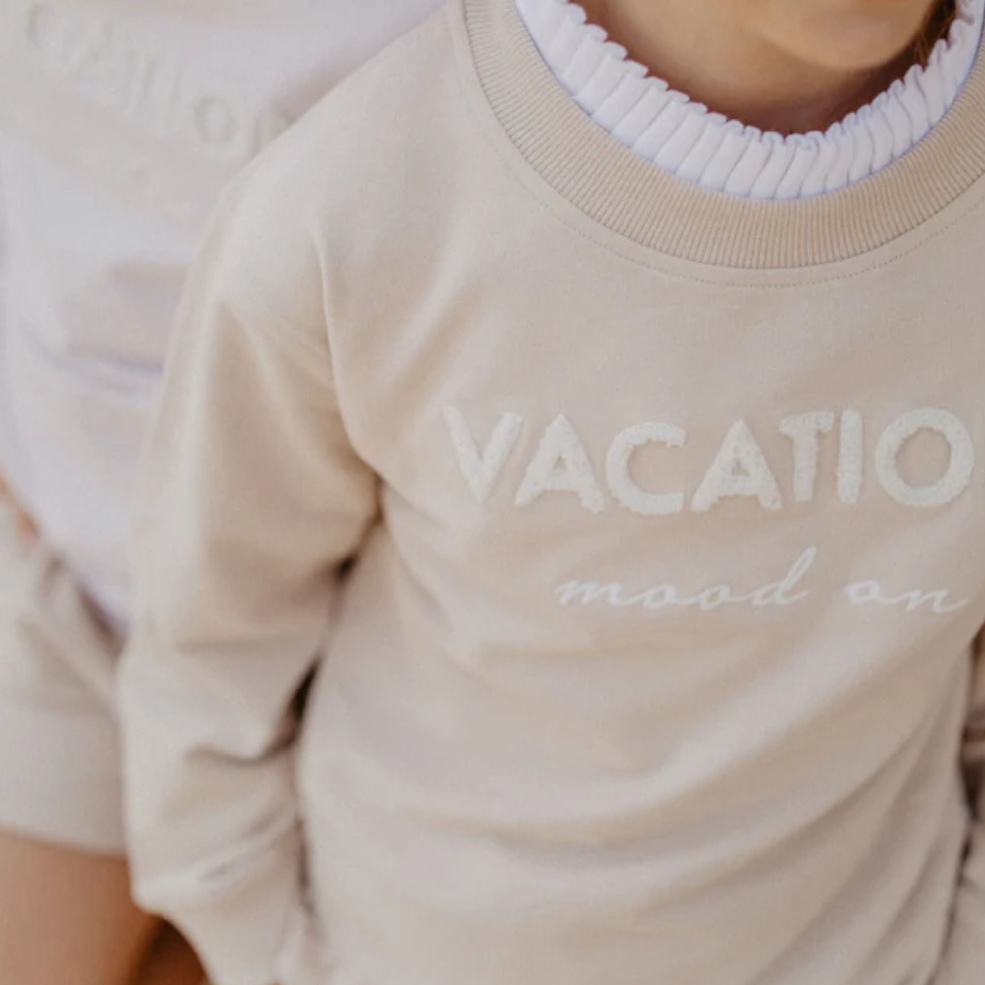 Der Kinder Sweater 'Vacation Mood On' bringt Urlaubsstimmung in den Alltag! Mit seiner liebevollen Stickerei und den verspielten Rüschen am Saum versprüht er pure Leichtigkeit und Lebensfreude.