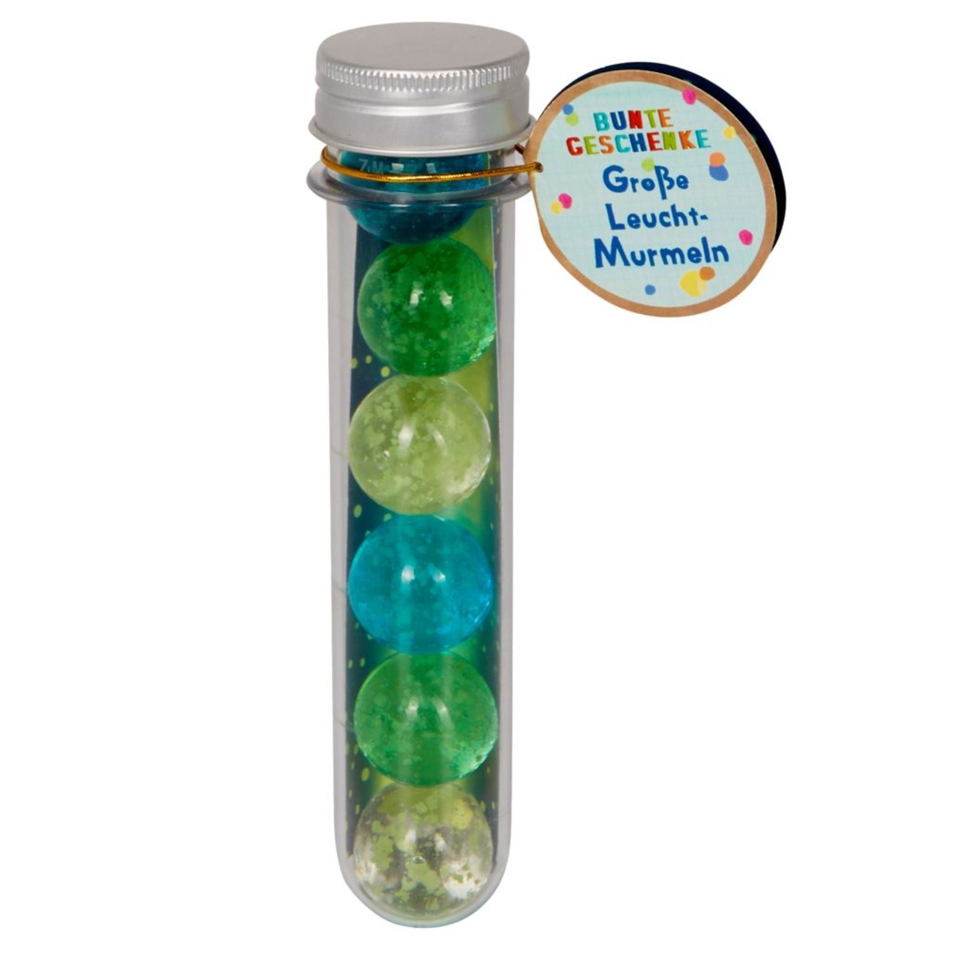 Bunte Geschenke für Kinder: Dieser Spiele-Klassiker zaubert ein Lächeln auf jedes Gesicht! Das Set besteht aus 6 großen Murmeln aus Glas. Das besondere Extra: Die Murmeln leuchten im Dunkeln – für extra großen Spielspaß! Die Murmeln von Die Spiegelburg kommen in einer wunderschönen Aufbewahrung, einem Reagenzglas aus Kunststoff. So sind sie sicher verstaut und immer griffbereit. Die Möglichkeiten sind endlos - zum Spielen und Verschenken!
