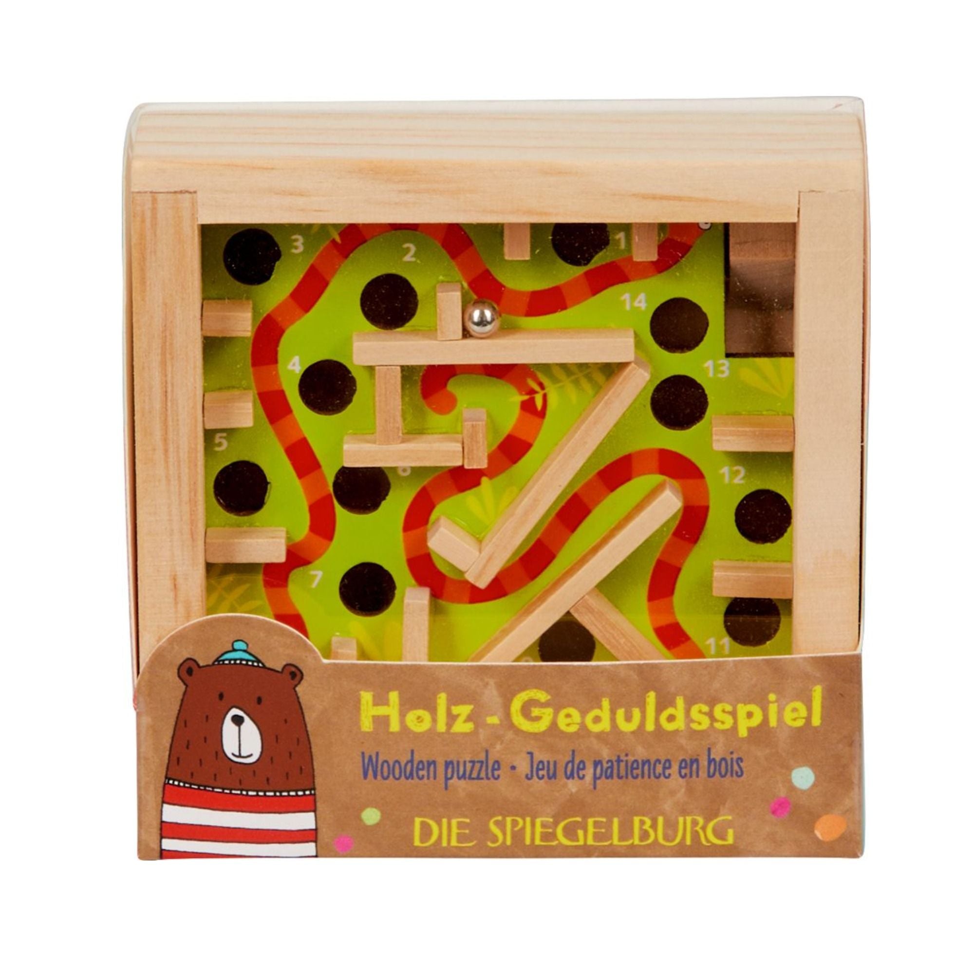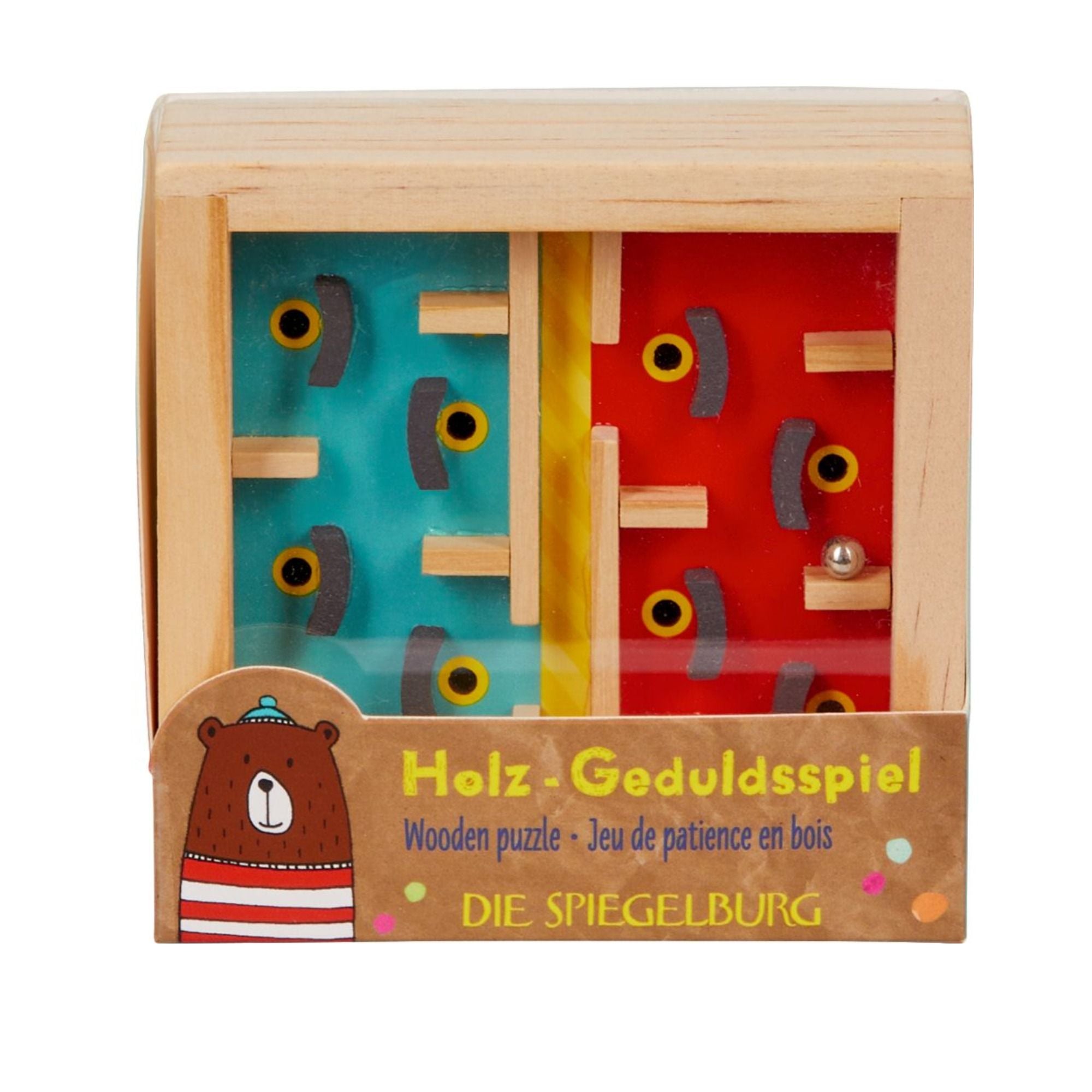 Mit diesem Geduldsspiel können schon die Kleinsten spielerisch ihre Geduld und Konzentration trainieren – gleichzeitig werden die feinmotorischen Fähigkeiten gefördert. Das liebevoll gestaltete Holzspielzeug in kunterbuntem Design eignet sich perfekt zum Knobeln und Verschenken. Erhältlich in 3 verschiedenen Designs.