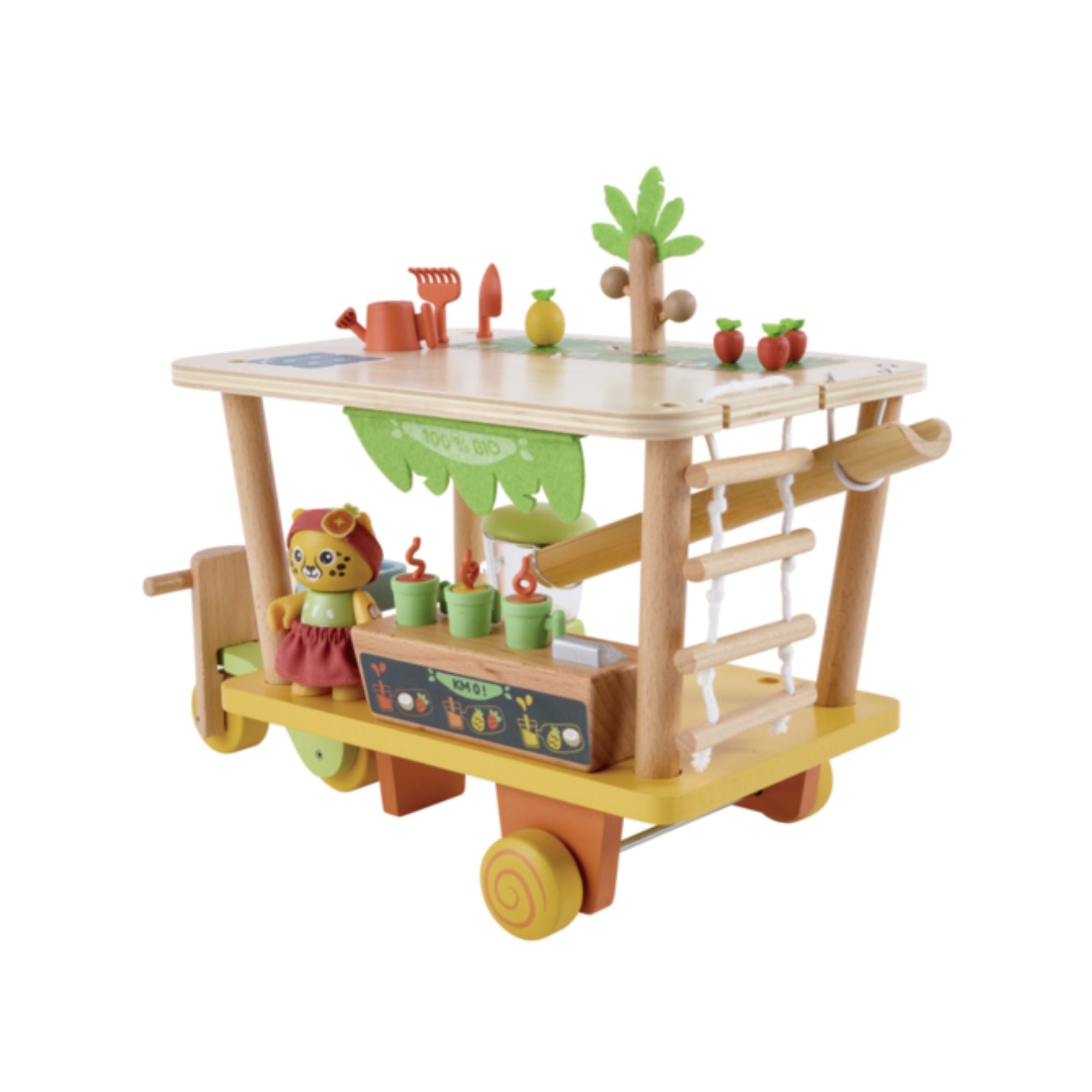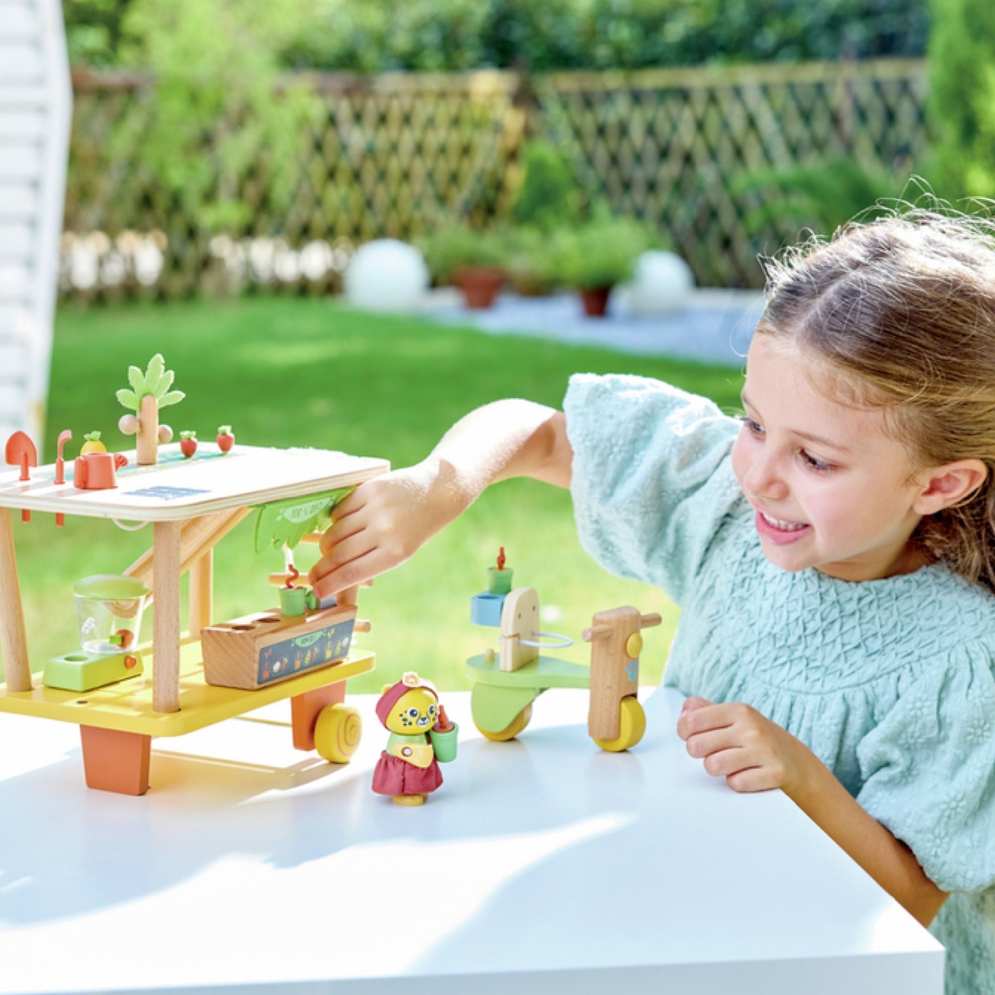 Begleite Clio, die umweltbewusste Gepardin, auf ihrer Mission, frische Fruchtsäfte zu servieren und Kindern die Bedeutung gesunder Ernährung näherzubringen. Mit dem "Clios Fruchtsaft-Truck" von Hape lernen Kinder spielerisch den Umgang mit Lebensmitteln und Nachhaltigkeit.