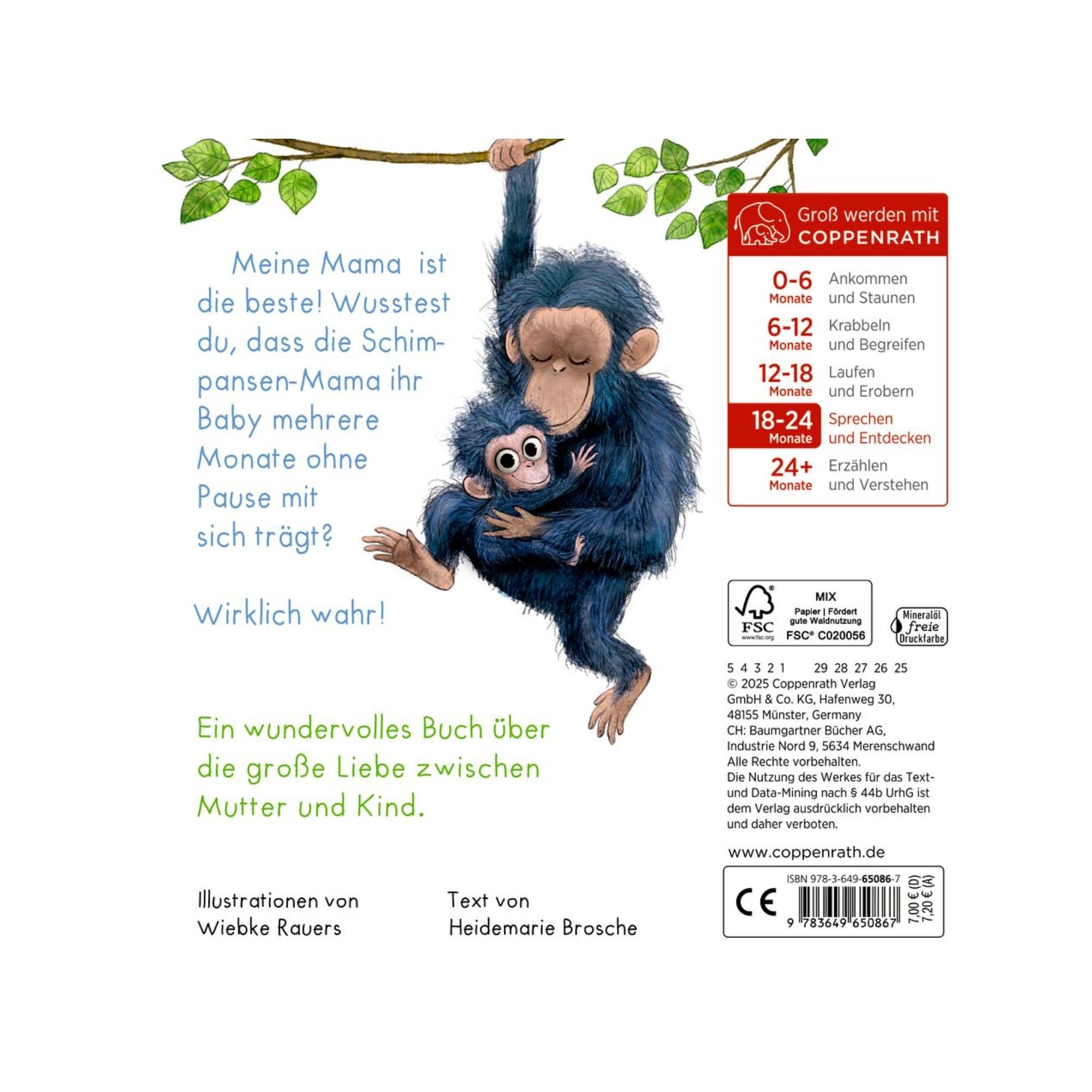 Wusstest du, dass Schimpansen-Mamas ihr Baby monatelang ohne Pause bei sich tragen? Mit faszinierenden Tierfakten, humorvollen Szenen und starken Illustrationen begeistert dieses Bilderbuch kleine und große Leser.