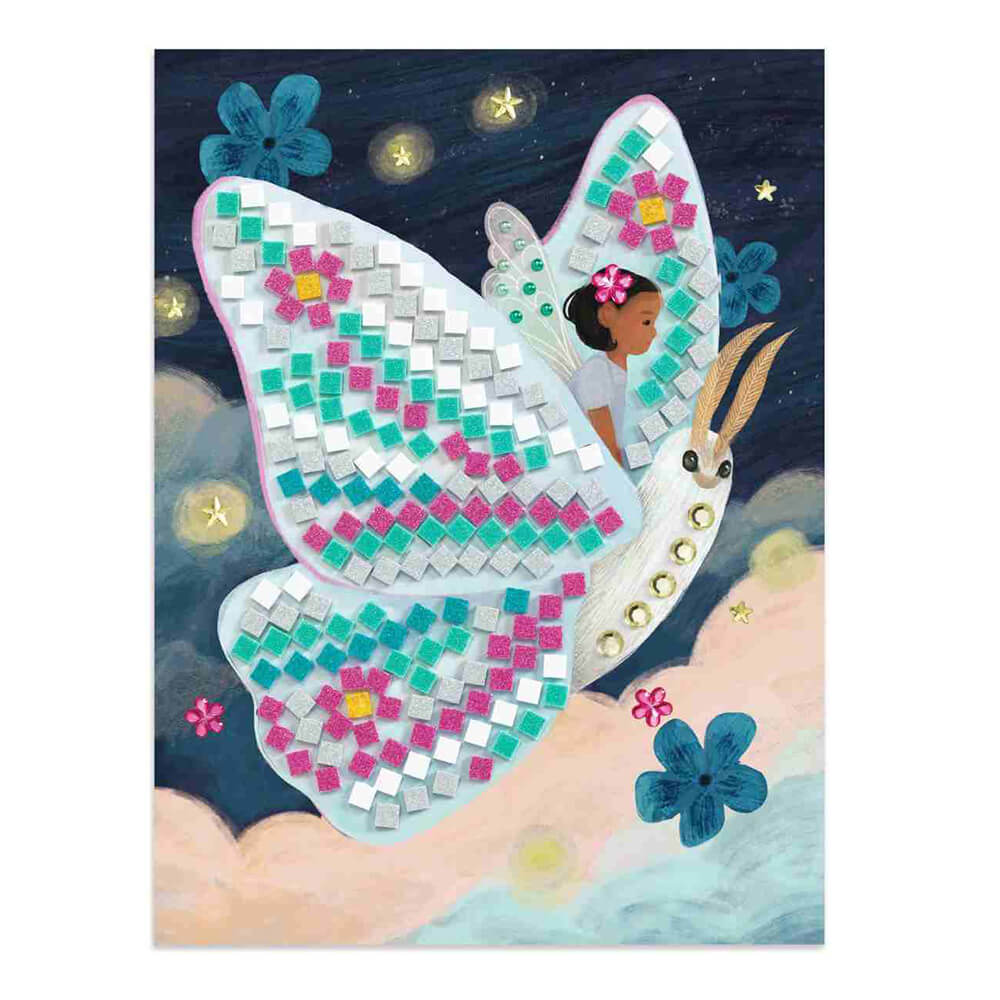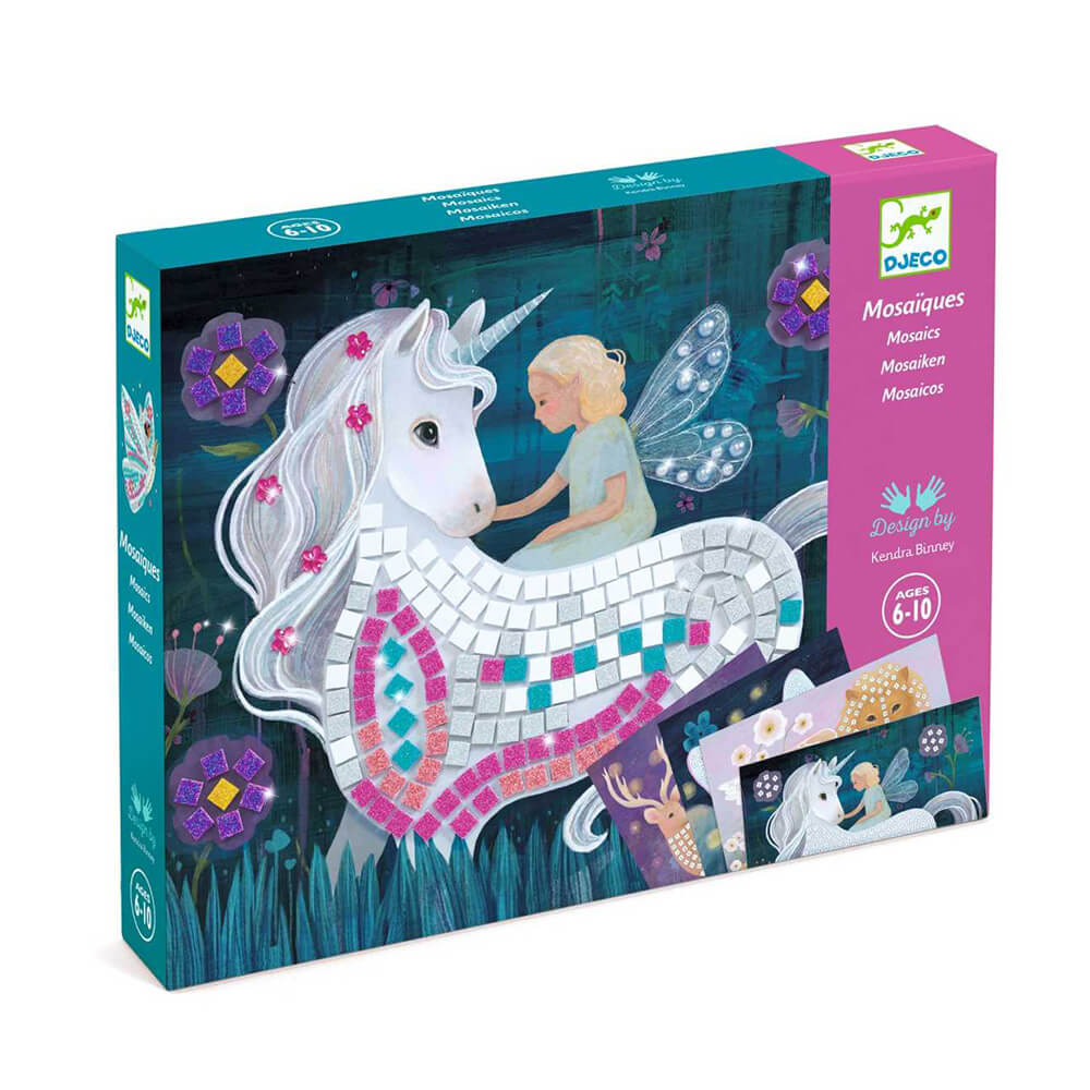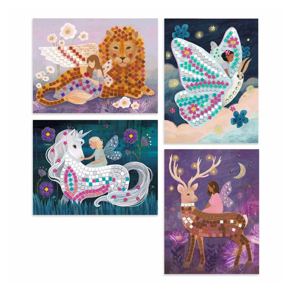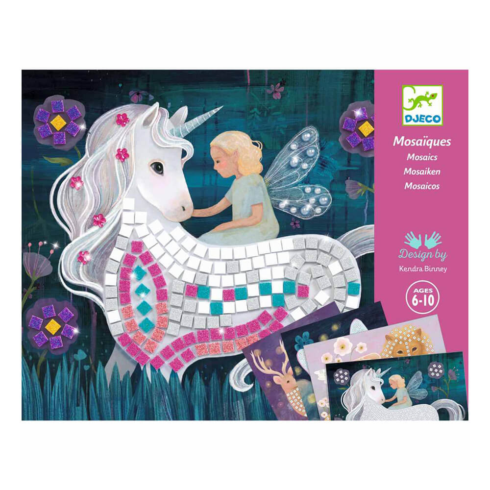 Ein Mosaik-Einsteigerset. 4 Bilder, die durch das Aufkleben von kleinen Quadraten aus Glitzerschaum und Strasssteinen verziert werden können. Das Kind sucht die Zahlen und klebt die entsprechenden Mosaiksteine dann auf den dafür vorgesehenen Platz. Es entstehen schillernde und glitzernde Bilder einer verzauberten Welt.