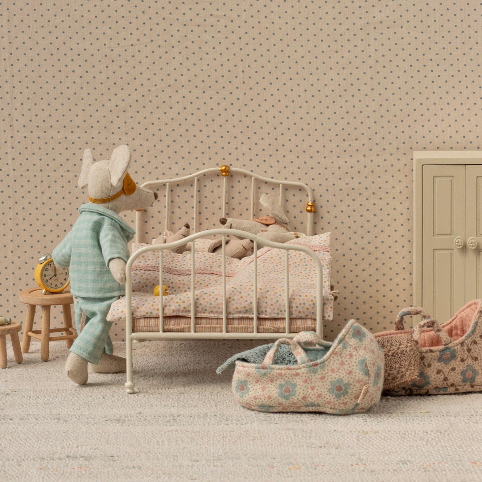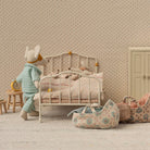 Ein Ort zum Ausruhen, Kuscheln und Träumen: Dieses detailverliebte Metallbett bringt klassischen Vintage-Stil ins Mäusehaus. Das filigrane Gestell in sanftem Off-White sowie die weiche Miniatur-Bettwäsche schaffen eine gemütliche Atmosphäre, die kleine Rollenspielwelten liebevoll ergänzt.