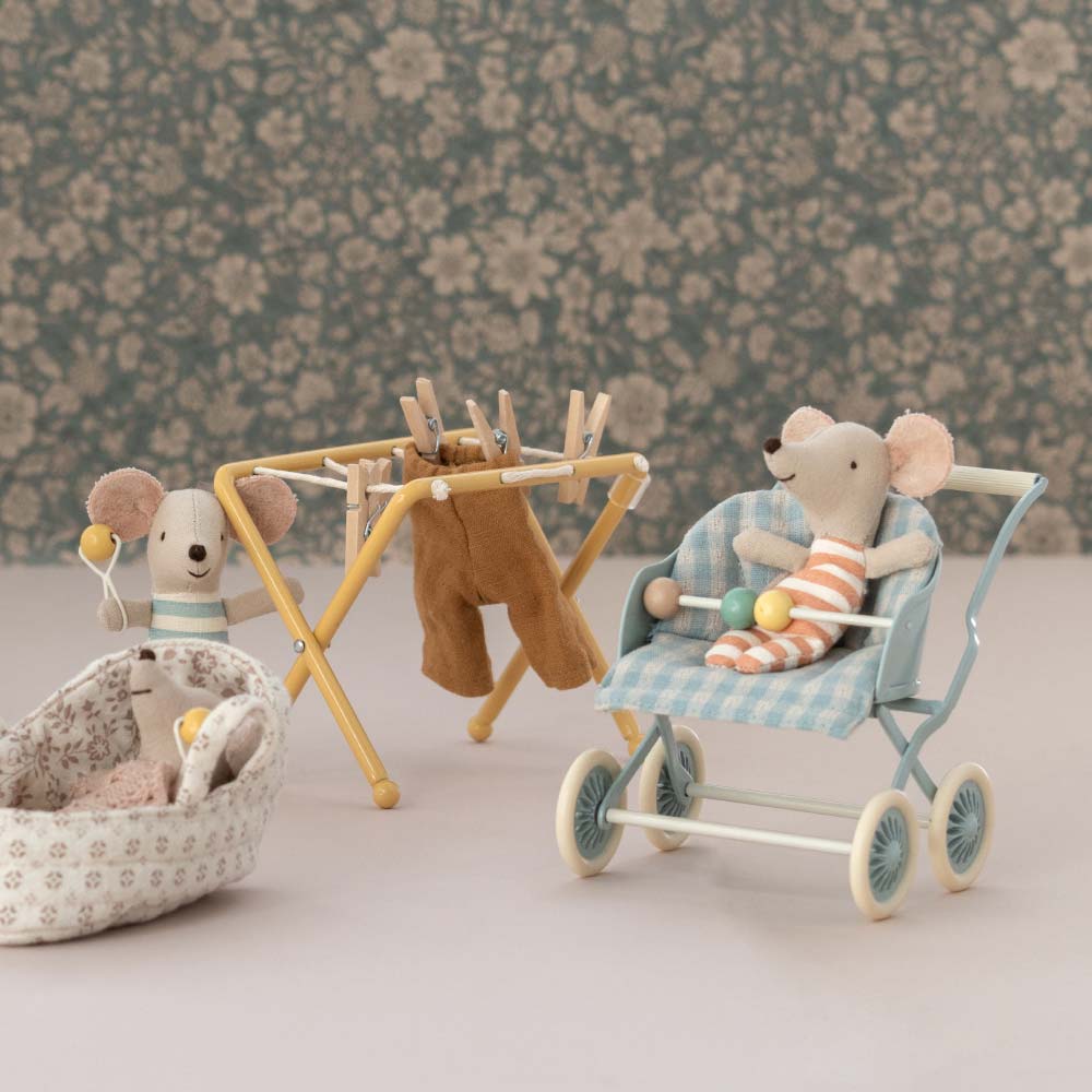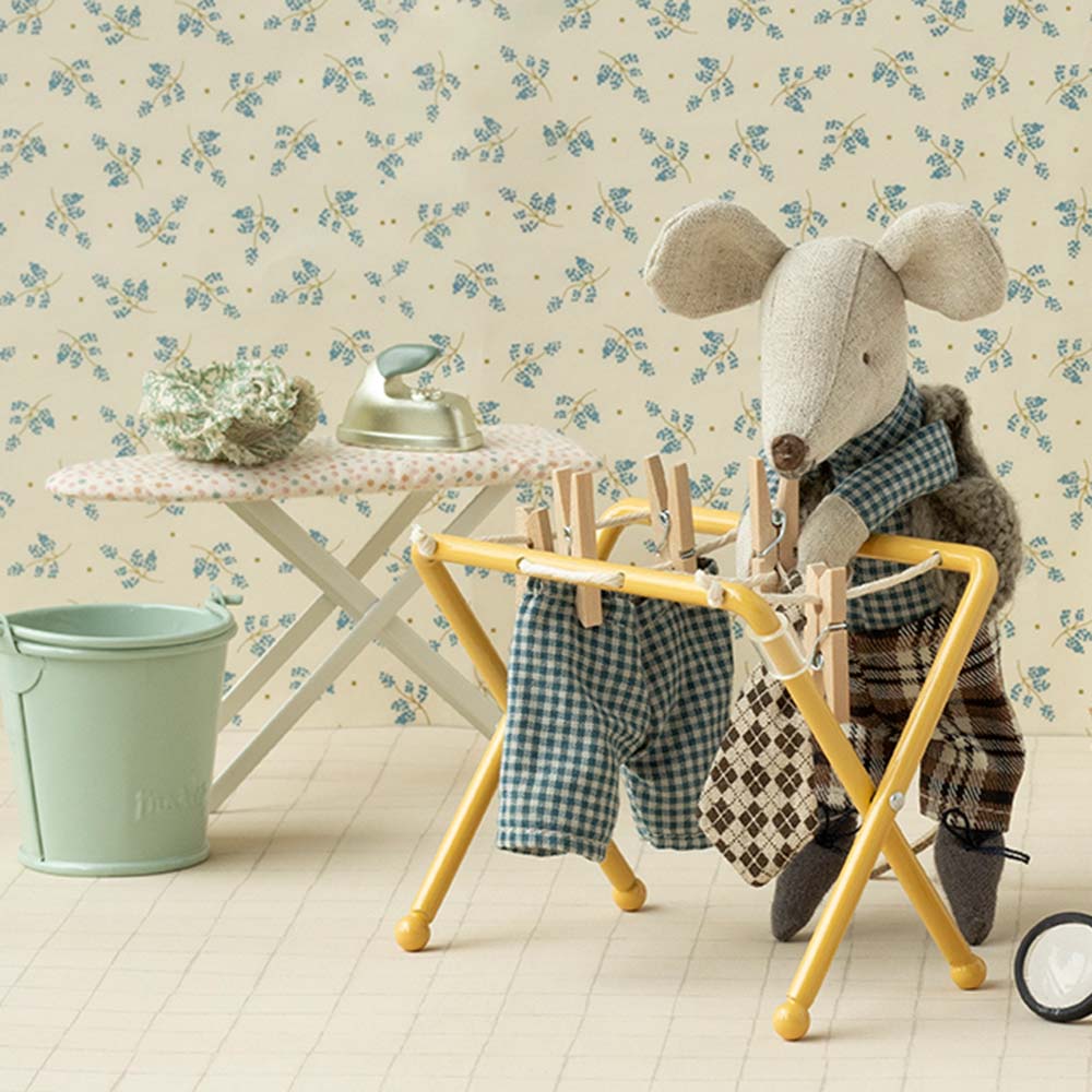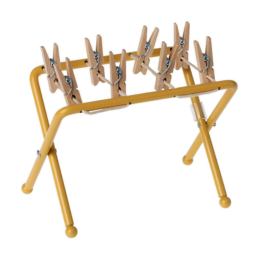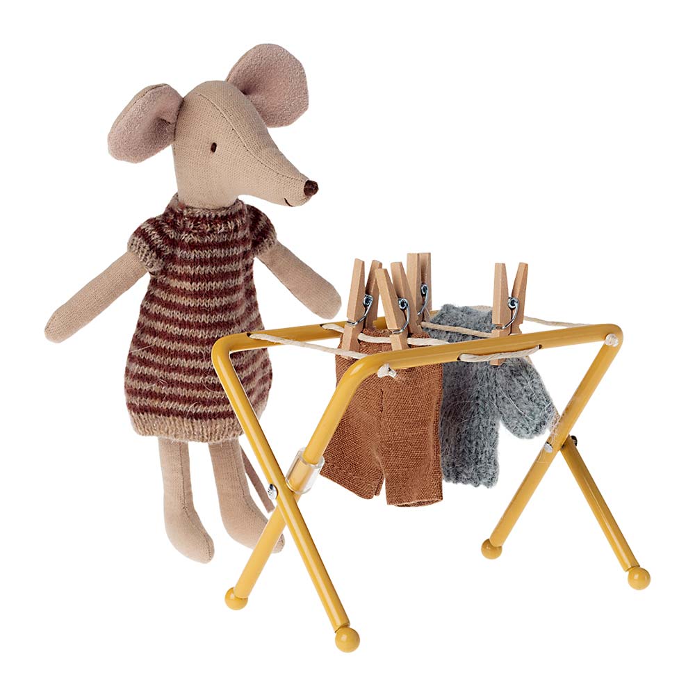 Die Mäuse Familie hat viel Wäsche. Dieser Wäscheständer ist für die Mäusfamilie gemacht und passt zu ihrer kleinen Kleidung. Dieses Set enthält einen Wäscheständer und kleine Holzklammern.