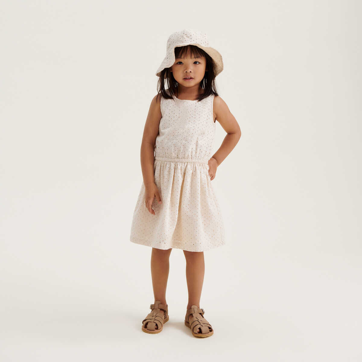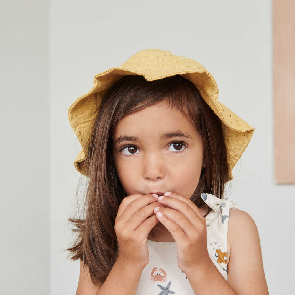 Der leichte Amelia Sonnenhut mit Lochstickerei hat eine große Krempe, um Gesicht und Hals deiner Kleinen zu schützen. Die 100% Bio-Baumwolle sorgt für ein schweißfreies und atmungsaktives Tragegefühl.