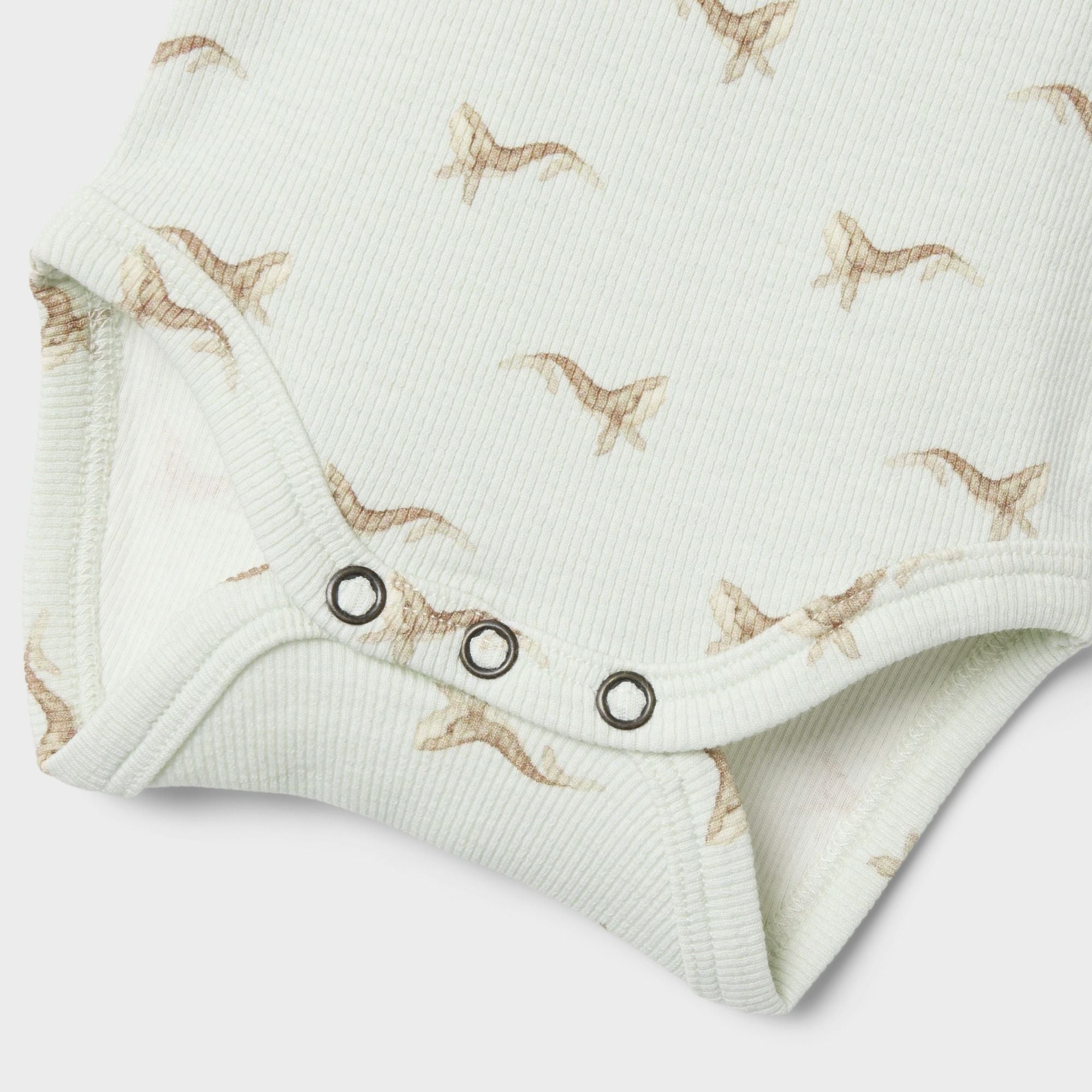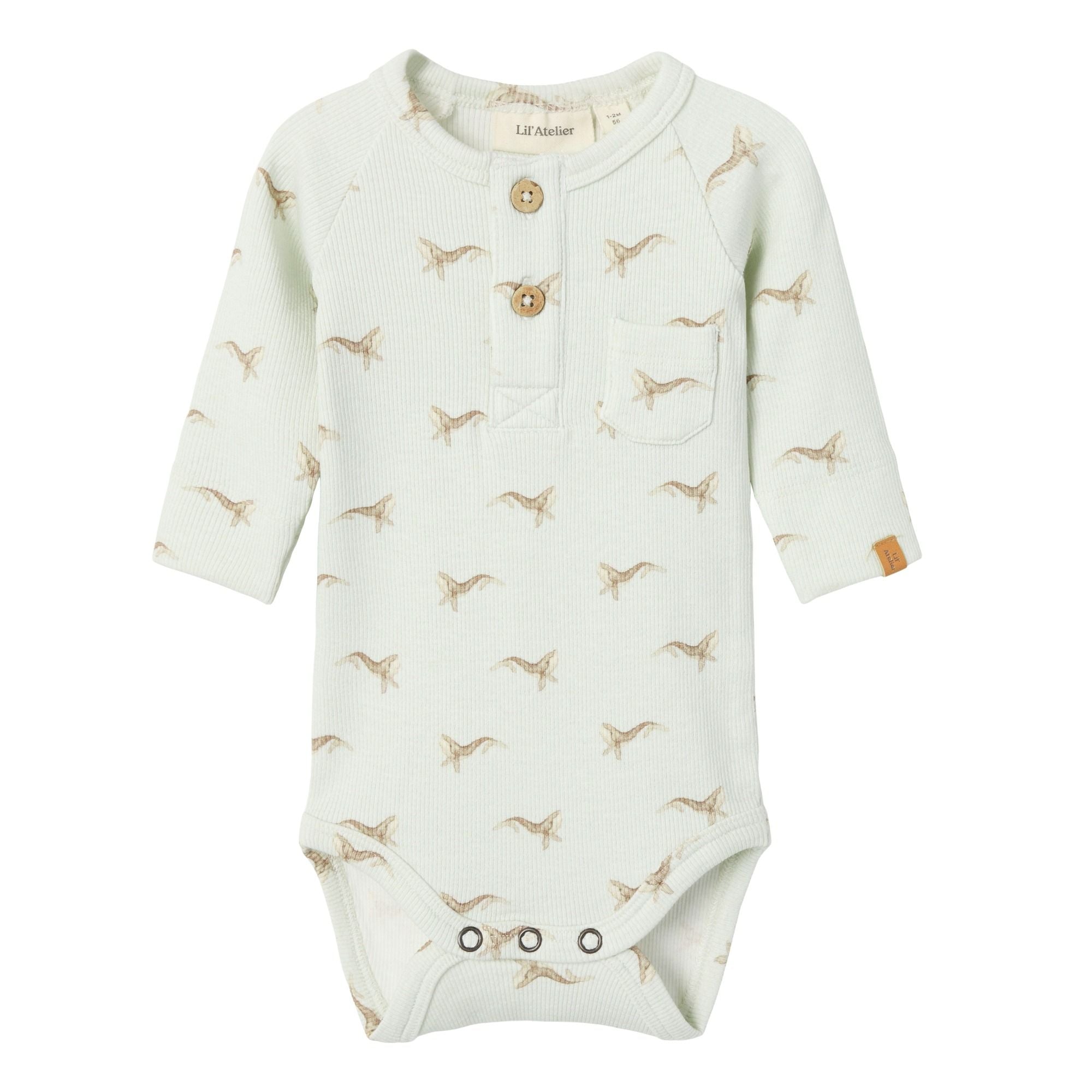 Mit seinem klassischen Grandad-Kragen, einer kurzen Knopfleiste mit Druckknöpfen sowie dem durchgehenden, liebevoll gestalteten Allover-Print wird der Body schnell zum Lieblingsstück im Alltag. Das kleine Label-Detail rundet das Design harmonisch ab – ideal für bewusste Eltern, die Wert auf Stil und Nachhaltigkeit legen.