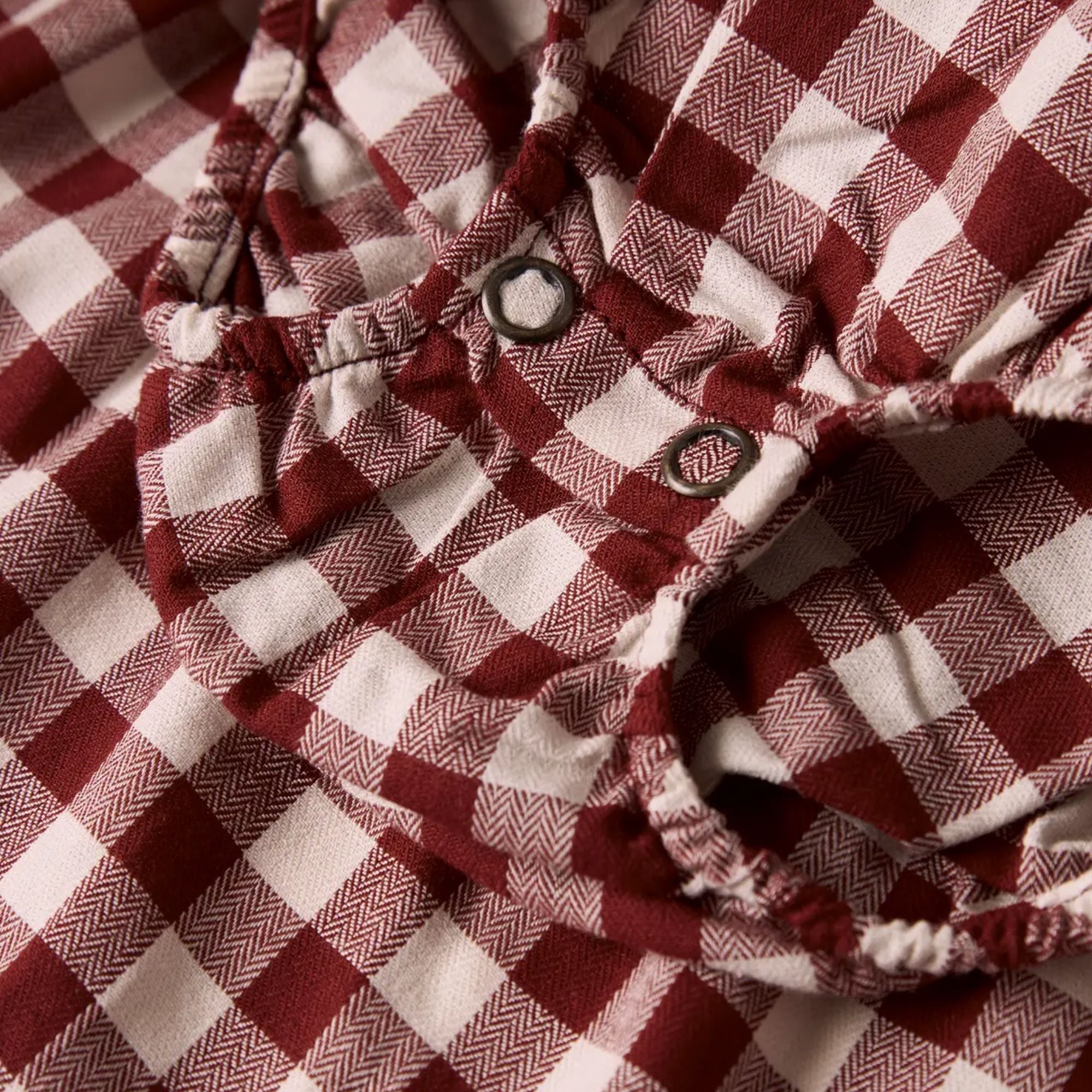 Dieses liebevoll gestaltete Baby-Bodykleid aus weicher, hochwertiger Bio-Baumwolle kombiniert den Komfort eines Bodys mit dem Look eines festlichen Kleides. Das klassische Karomuster in warmem Rot-Weiß verleiht dem Outfit einen charmanten, zeitlosen Stil. Zarte Rüschen an der Taille und an den Ärmeln setzen verspielte Akzente. Ein praktischer Knopf im Nacken erleichtert das An- und Ausziehen, ebenso wie die Druckknöpfe im Schritt. Ideal für Alltag und besondere Anlässe, angenehm weich auf empfindlicher Babyhaut und rundum bequem.