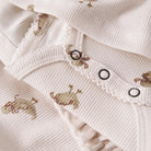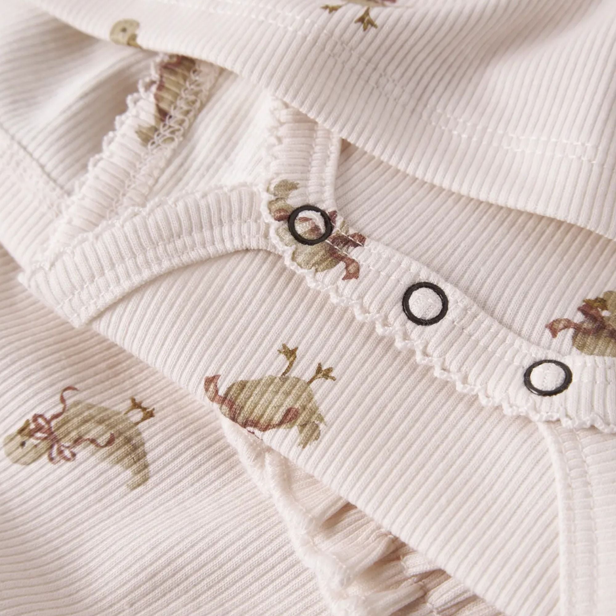 Dieses entzückende Baby-Bodykleid aus weicher Bio-Baumwolle vereint höchsten Tragekomfort mit einem liebevollen Design. Die feine Ripp-Optik und der All-Over-Print mit niedlichem Motiv verleihen dem Kleid einen charmanten Look. Zarte Rüschen an den Schultern und die leicht geraffte Taille sorgen für eine verspielte Note. Praktische Druckknöpfe im Schritt und ein Knopf im Nacken erleichtern das An- und Ausziehen. Sanft zur empfindlichen Babyhaut und perfekt für Alltag oder besondere Anlässe.