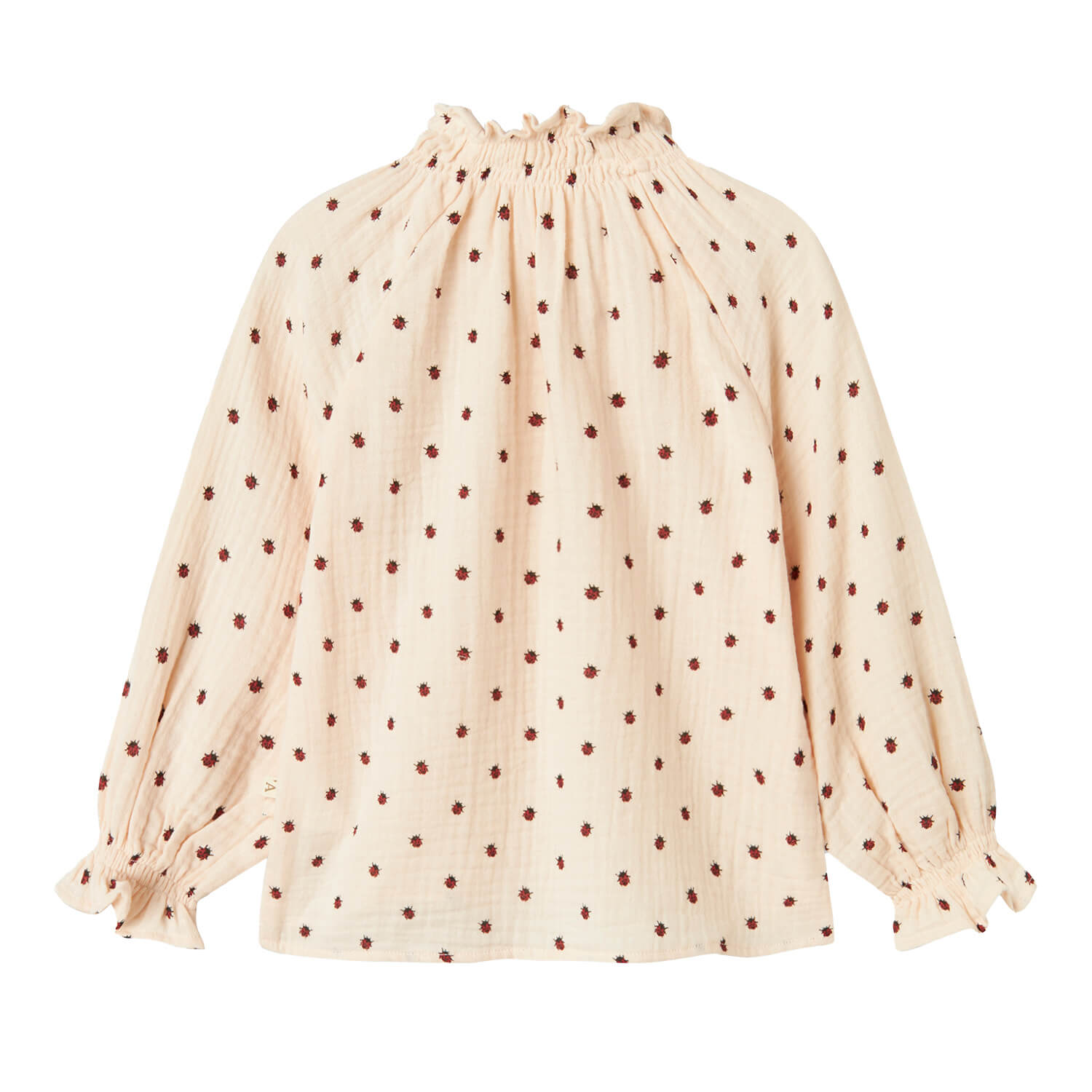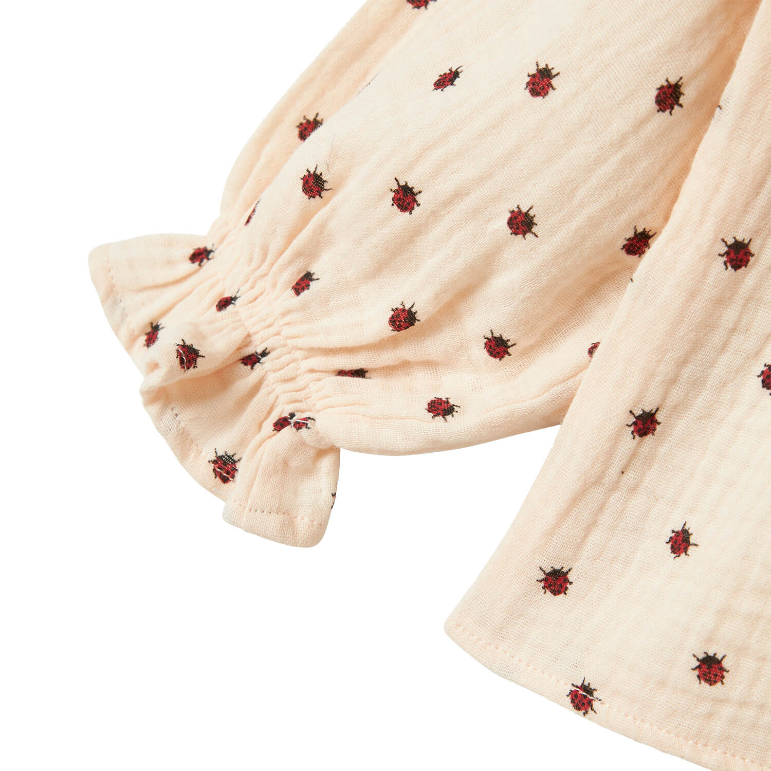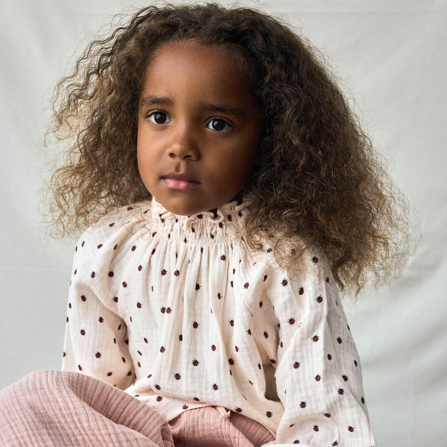 Diese leichte Langarmbluse aus weichem Musselin aus Bio-Baumwolle ist ein echtes Lieblingsstück für stilvolle Alltagslooks. Der zarte All-Over-Print verleiht der Bluse eine verspielte Note, während der hochgeschlossene Kragen und die dezent gerafften Ärmel für einen charmanten, kindgerechten Look sorgen. Dank des lockeren Schnitts bietet die Bluse viel Bewegungsfreiheit und trägt sich angenehm luftig – perfekt für warme Tage oder als Layering-Piece. Nachhaltig gefertigt und liebevoll gestaltet, kombiniert sie Komfort mit einem modernen Design.